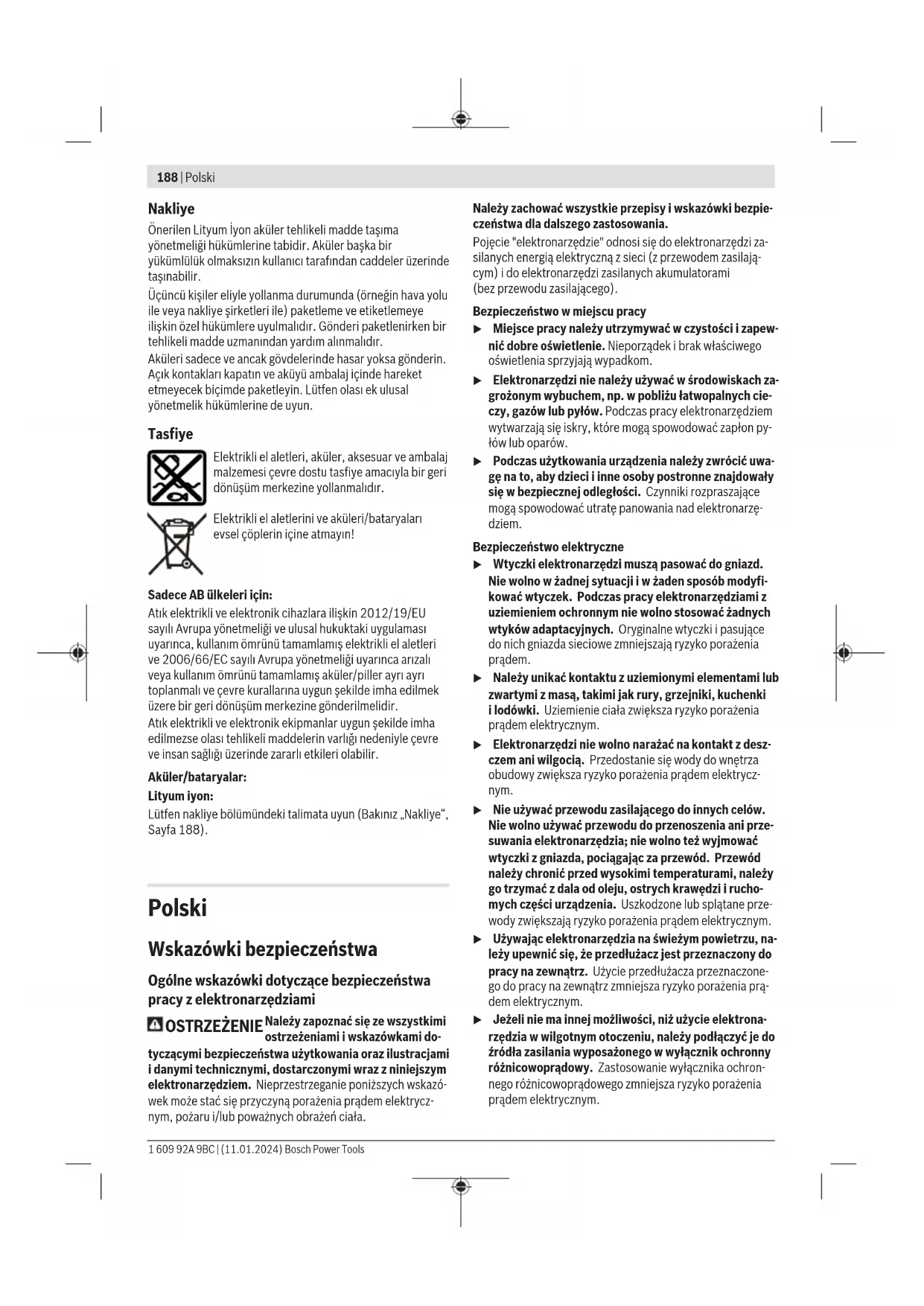 Karasoku Mahallesi 28028. Sokak No:20/A Merkez / ADANA Tel.: +903223599710 -3521379 Fax: +903223591323 E-mail: isiklar@isiklarelektrik.com Diğer servis adreslerini şurada bulabilirsiniz: www.bosch-pt.com/serviceaddresses Bosch Power Tools 1 609 92A 9BC | (11.01.2024)188 | Polski Nakliye Önerilen Lityum İyon aküler tehlikeli madde taşıma yönetmeliği hükümlerine tabidir. Aküler başka bir yükümlülük olmaksızın kullanıcı tarafından caddeler üzerinde taşınabilir. Üçüncü kişiler eliyle yollanma durumunda (örneğin hava yolu ile veya nakliye şirketleri ile) paketleme ve etiketlemeye ilişkin özel hükümlere uyulmalıdır. Gönderi paketlenirken bir tehlikeli madde uzmanından yardım alınmalıdır. Aküleri sadece ve ancak gövdelerinde hasar yoksa gönderin. Açık kontakları kapatın ve aküyü ambalaj içinde hareket etmeyecek biçimde paketleyin. Lütfen olası ek ulusal yönetmelik hükümlerine de uyun. Tasfiye Elektrikli el aletleri, aküler, aksesuar ve ambalaj malzemesi çevre dostu tasfiye amacıyla bir geri dönüşüm merkezine yollanmalıdır. Elektrikli el aletlerini ve aküleri/bataryaları evsel çöplerin içine atmayın! Sadece AB ülkeleri için: Atık elektrikli ve elektronik cihazlara ilişkin 2012/19/EU sayılı Avrupa yönetmeliği ve ulusal hukuktaki uygulaması uyarınca, kullanım ömrünü tamamlamış elektrikli el aletleri ve 2006/66/EC sayılı Avrupa yönetmeliği uyarınca arızalı veya kullanım ömrünü tamamlamış aküler/piller ayrı ayrı toplanmalı ve çevre kurallarına uygun şekilde imha edilmek üzere bir geri dönüşüm merkezine gönderilmelidir. Atık elektrikli ve elektronik ekipmanlar uygun şekilde imha edilmezse olası tehlikeli maddelerin varlığı nedeniyle çevre ve insan sağlığı üzerinde zararlı etkileri olabilir. Aküler/bataryalar: Lityum iyon: Lütfen nakliye bölümündeki talimata uyun (Bakınız „Nakliye“, Sayfa188). Polski Wskazówki bezpieczeństwa Ogólne wskazówki dotyczące bezpieczeństwa pracy z elektronarzędziami OSTRZEŻENIE Należy zapoznać się ze wszystkimi ostrzeżeniami i wskazówkami do- tyczącymi bezpieczeństwa użytkowania oraz ilustracjami i danymi technicznymi, dostarczonymi wraz z niniejszym elektronarzędziem. Nieprzestrzeganie poniższych wskazó- wek może stać się przyczyną porażenia prądem elektrycz- nym, pożaru i/lub poważnych obrażeń ciała. Należy zachować wszystkie przepisy i wskazówki bezpie- czeństwa dla dalszego zastosowania. Pojęcie "elektronarzędzie" odnosi się do elektronarzędzi za- silanych energią elektryczną z sieci (z przewodem zasilają- cym) i do elektronarzędzi zasilanych akumulatorami (bezprzewodu zasilającego). Bezpieczeństwo w miejscu pracy u Miejsce pracy należy utrzymywać w czystości i zapew- nić dobre oświetlenie. Nieporządek i brak właściwego oświetlenia sprzyjają wypadkom. u Elektronarzędzi nie należy używać w środowiskach za- grożonym wybuchem, np. w pobliżu łatwopalnych cie- czy, gazów lub pyłów. Podczas pracy elektronarzędziem wytwarzają się iskry, które mogą spowodować zapłon py- łów lub oparów. u Podczas użytkowania urządzenia należy zwrócić uwa- gę na to, aby dzieci i inne osoby postronne znajdowały się w bezpiecznej odległości. Czynniki rozpraszające mogą spowodować utratę panowania nad elektronarzę- dziem. Bezpieczeństwo elektryczne u Wtyczki elektronarzędzi muszą pasować do gniazd. Nie wolno w żadnej sytuacji i w żaden sposób modyfi- kować wtyczek. Podczas pracy elektronarzędziami z uziemieniem ochronnym nie wolno stosować żadnych wtyków adaptacyjnych. Oryginalne wtyczki i pasujące do nich gniazda sieciowe zmniejszają ryzyko porażenia prądem. u Należy unikać kontaktu z uziemionymi elementami lub zwartymi z masą, takimi jak rury, grzejniki, kuchenki ilodówki. Uziemienie ciała zwiększa ryzyko porażenia prądem elektrycznym. u Elektronarzędzi nie wolno narażać na kontakt z desz- czem ani wilgocią. Przedostanie się wody do wnętrza obudowy zwiększa ryzyko porażenia prądem elektrycz- nym. u Nie używać przewodu zasilającego do innych celów. Nie wolno używać przewodu do przenoszenia ani prze- suwania elektronarzędzia; nie wolno też wyjmować wtyczki z gniazda, pociągając za przewód. Przewód należy chronić przed wysokimi temperaturami, należy go trzymać zdala od oleju, ostrych krawędzi i rucho- mych części urządzenia. Uszkodzone lub splątane prze- wody zwiększają ryzyko porażenia prądem elektrycznym. u Używając elektronarzędzia na świeżym powietrzu, na- leży upewnić się, że przedłużacz jest przeznaczony do pracy na zewnątrz. Użycie przedłużacza przeznaczone- go do pracy na zewnątrz zmniejsza ryzyko porażenia prą- dem elektrycznym. u Jeżeli nie ma innej możliwości, niż użycie elektrona- rzędzia w wilgotnym otoczeniu, należy podłączyć je do źródła zasilania wyposażonego w wyłącznik ochronny różnicowoprądowy. Zastosowanie wyłącznika ochron- nego różnicowoprądowego zmniejsza ryzyko porażenia prądem elektrycznym. 1 609 92A 9BC | (11.01.2024) Bosch Power ToolsPolski | 189 Bezpieczeństwo osób u Podczas pracy z elektronarzędziem należy zachować czujność, każdą czynność wykonywać ostrożnie i z rozwagą. Nie przystępować do pracy elektronarzę- dziem w stanie zmęczenia lub będąc pod wpływem narkotyków, alkoholu lub leków. Chwila nieuwagi pod- czas pracy może grozić bardzo poważnymi obrażeniami ciała. u Stosować środki ochrony osobistej. Należy zawsze nosić okulary ochronne. Środki ochrony osobistej, np. maska przeciwpyłowa, antypoślizgowe obuwie, kask ochronny czy ochraniacze na uszy, w określonych warun- kach pracy obniżają ryzyko obrażeń ciała. u Należy unikać niezamierzonego uruchomienia narzę- dzia. Przed podłączeniem elektronarzędzia do źródła zasilania i/lub podłączeniem akumulatora, podniesie- niem albo transportem urz