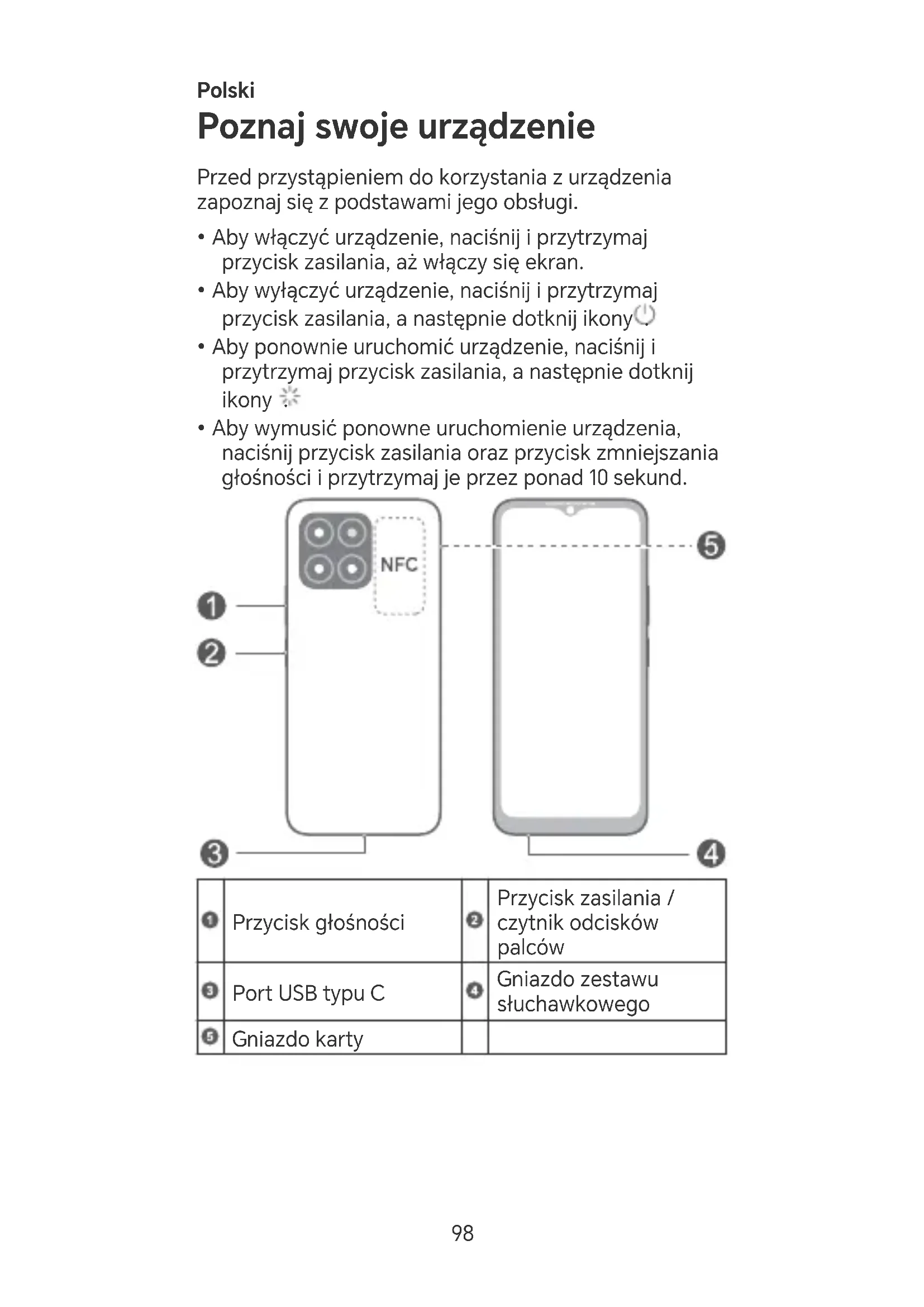 - Aby wymusić ponowne uruchomienie urządzenia, naciśnij przycisk zasilania oraz przycisk zmniejszania głośności i przytrzymaj je przez ponad 10 sekund. Przycisk głośności Przycisk zasilania / czytnik odcisków palców Po USB typu C Gniazdo zestawu słuchawkowego Gniazdo kay 98• Podczas korzystania z tej funkcji obszar aktywny NFC należy jak najbardziej zbliżyć do drugiego urządzenia lub przedmiotu.