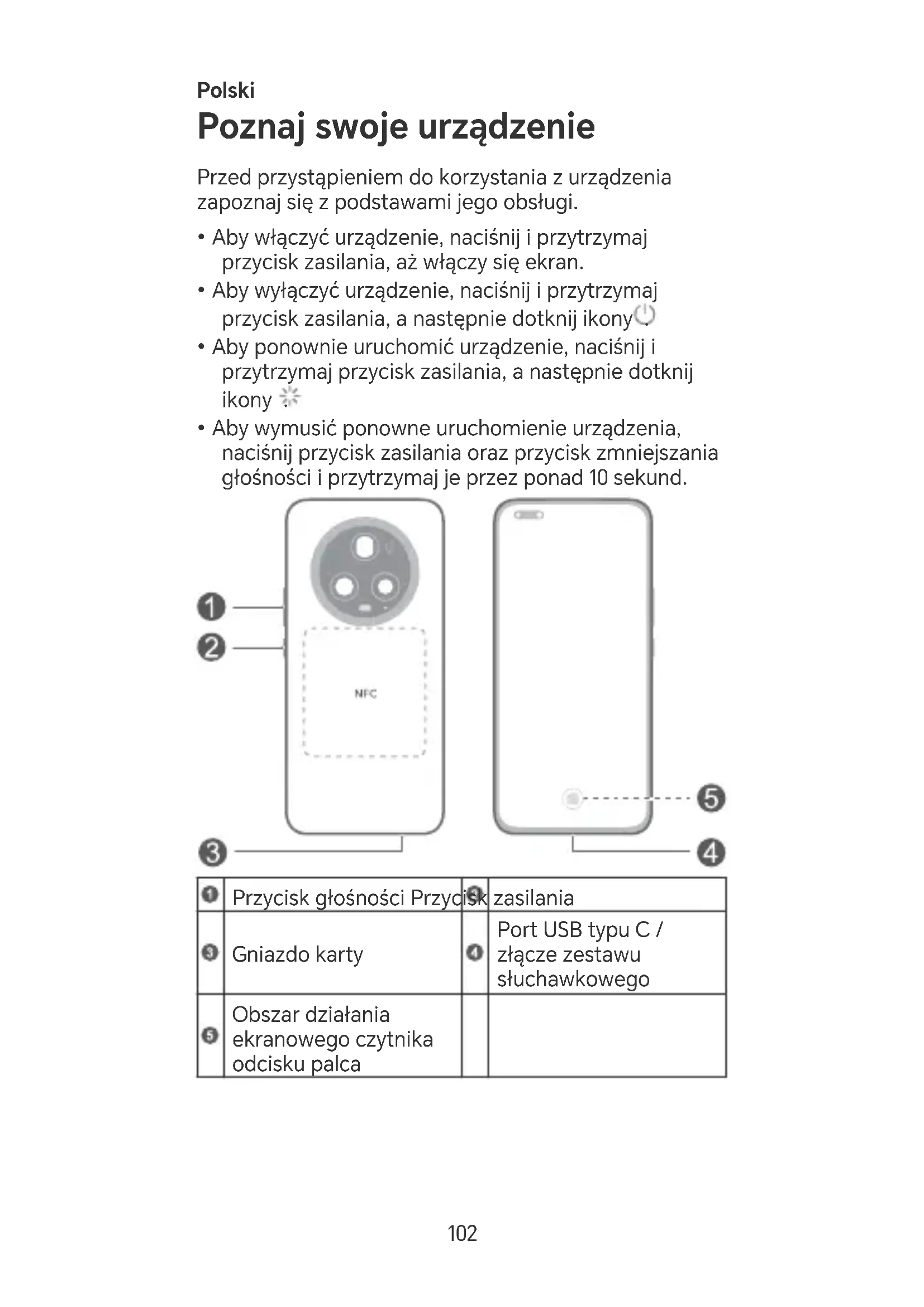 - Aby wymusić ponowne uruchomienie urządzenia, naciśnij przycisk zasilania oraz przycisk zmniejszania głośności i przytrzymaj je przez ponad 10 sekund. Przycisk głośności Przycisk zasilania Gniazdo kay Po USB typu C / złącze zestawu słuchawkowego Obszar działania ekranowego czytnika odcisku palca 102• Podczas korzystania z tej funkcji obszar aktywny NFC należy jak najbardziej zbliżyć do drugiego urządzenia lub przedmiotu.
