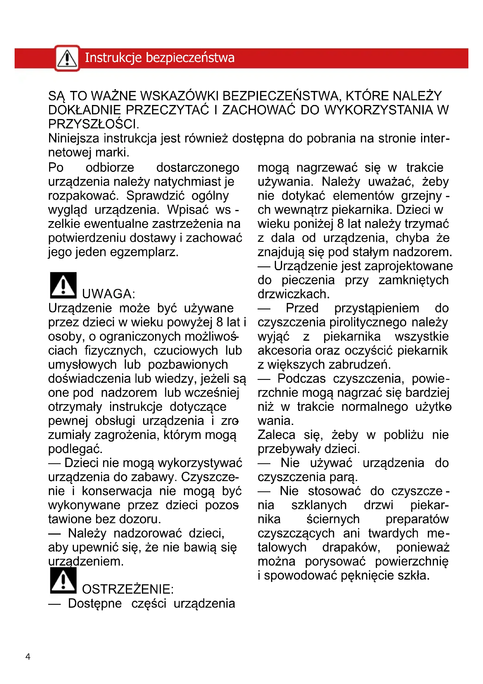 ch wewnątrz piekarnika. Dzieci w wieku poniżej 8 lat należy trzymać z dala od urządzenia, chyba że znajdują się pod stałym nadzorem. — Urządzenie jest zaprojektowane do pieczenia przy zamkniętych drzwiczkach. — Przed przystąpieniem do czyszczenia pirolitycznego należy wyjąć z piekarnika wszystkie akcesoria oraz oczyścić piekarnik z większych zabrudzeń. — Podczas czyszczenia, powie