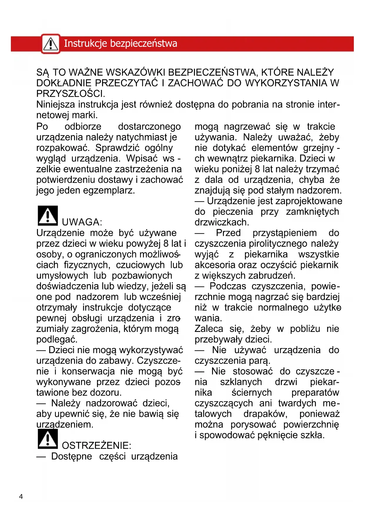 ch wewnątrz piekarnika. Dzieci w wieku poniżej 8 lat należy trzymać z dala od urządzenia, chyba że znajdują się pod stałym nadzorem. — Urządzenie jest zaprojektowane do pieczenia przy zamkniętych drzwiczkach. — Przed przystąpieniem do czyszczenia pirolitycznego należy wyjąć z piekarnika wszystkie akcesoria oraz oczyścić piekarnik z większych zabrudzeń. — Podczas czyszczenia, powie