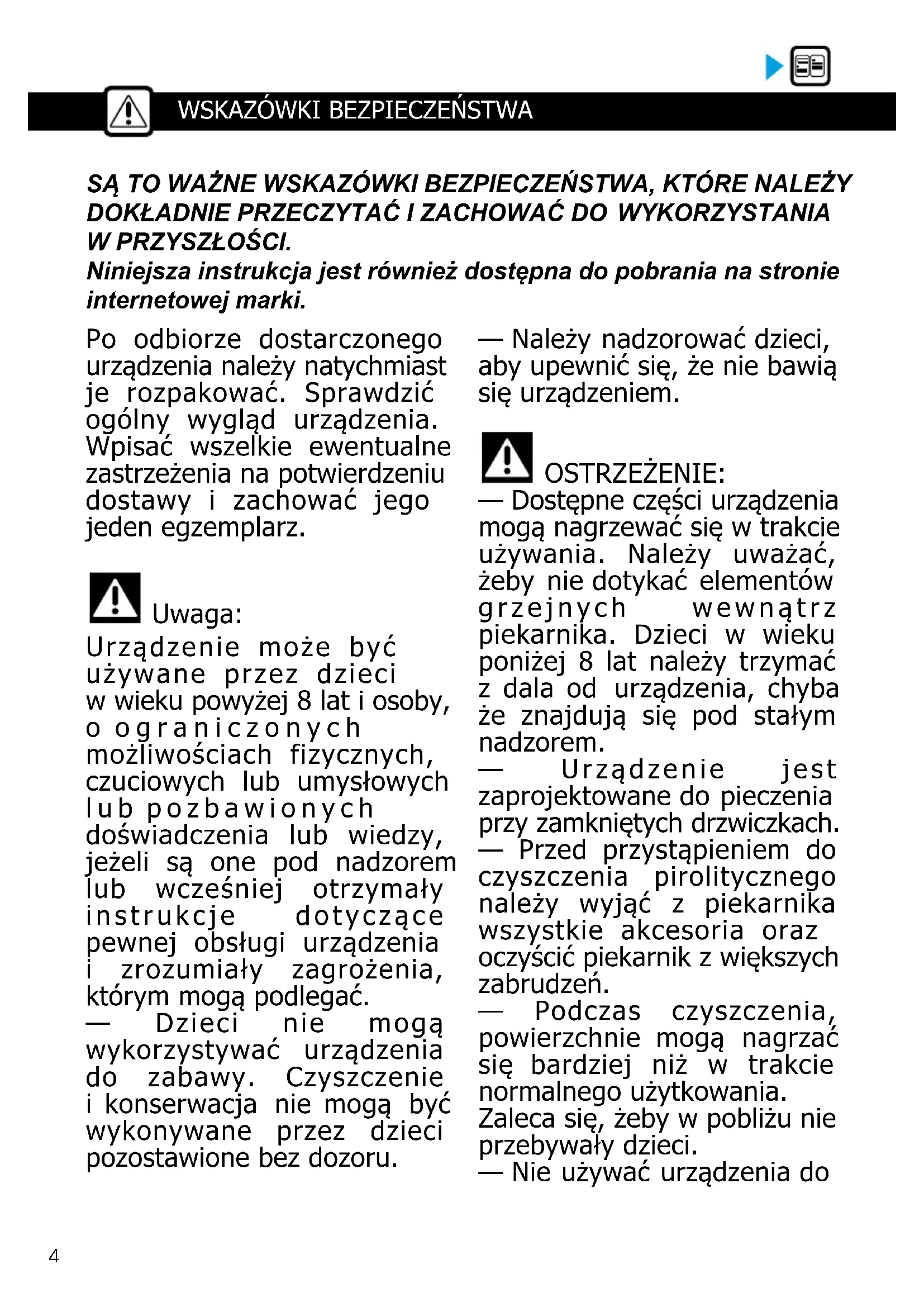 Po odbiorze dostarczonego urządzenia należy natychmiast je rozpakować. Sprawdzić ogólny wygląd urządzenia. Wpisać wszelkie ewentualne zastrzeżenia na potwierdzeniu dostawy i zachować jego jeden egzemplarz. Uwaga: Urządzenie może być używane przez dzieci w wieku powyżej 8 lat i osoby, o ograniczonych możliwościach fizycznych, czuciowych lub umysłowych lub pozbawionych doświadczenia lub wiedzy, jeżeli są one pod nadzorem lub wcześniej otrzymały instrukcje dotyczące pewnej obsługi urządzenia i zrozumiały zagrożenia, którym mogą podlegać. — Dzieci nie mogą wykorzystywać urządzenia do zabawy. Czyszczenie i konserwacja nie mogą być wykonywane przez dzieci pozostawione bez dozoru. — Należy nadzorować dzieci, aby upewnić się, że nie bawią się urządzeniem. OSTRZEŻENIE: — Dostępne części urządzenia mogą nagrzewać się w trakcie używania. Należy uważać, żeby nie dotykać elementów grzejnych wewnątrz piekarnika. Dzieci w wieku poniżej 8 lat należy trzymać z dala od urządzenia, chyba że znajdują się pod stałym nadzorem. — Urządzenie jest zaprojektowane do pieczenia przy zamkniętych drzwiczkach. — Przed przystąpieniem do czyszczenia pirolitycznego należy wyjąć z piekarnika wszystkie akcesoria oraz oczyścić piekarnik z większych zabrudzeń. — Podczas czyszczenia, powierzchnie mogą nagrzać się bardziej niż w trakcie normalnego użytkowania. Zaleca się, żeby w pobliżu nie przebywały dzieci. — Nie używać urządzenia do SĄ TO WAŻNE WSKAZÓWKI BEZPIECZEŃSTWA, KTÓRE NALEŻY DOKŁADNIE PRZECZYTAĆ I ZACHOWAĆ DO WYKORZYSTANIA W PRZYSZŁOŚCI. Niniejsza instrukcja jest również dostępna do pobrania na stronie internetowej marki.5 WSKAZÓWKI BEZPIECZEŃSTWA WSKAZÓWKI BEZPIECZEŃSTWA czyszczenia parą. — Nie stosować do czyszczenia szklanych drzwi piekarnika ściernych preparatów czyszczących ani twardych metalowych drapaków, ponieważ można porysować powierzchnię i spowodować pęknięcie szkła. OSTRZEŻENIE : Upewnić się, że urządzenie jest wyłączone od zasilania przed przystąpieniem do wymiany lampy, aby uniknąć ryzyka porażenia prądem. Rozpocząć czynności po ostygnięciu urządzenia. Aby odkręcić oprawę i lampę, używać gumowej rękawicy, która ułatwi demontaż. Gniazdko prądu powinno być dostępne po instalacji. Należy przewidzieć sposób odłączenia urządzenia od sieci zasilającej za pomocą gniazdka prądu lub zintegrowanego wyłącznika w stałym układzie przewodów zgodnie z regułami instalacji. — Jeśli kabel zasilania jest uszkodzony, powinien zostać wymieniony przez producenta, jego serwis posprzedażny lub osoby o podobnych kwalifikacjach w celu uniknięcia zagrożenia. — Urządzenie może być zainstalowane pod blatem lub w kolumnie jak pokazano na schemacie instalacji. — Ustawić piekarnik wewnątrz szafki w taki sposób, aby odległość od sąsiedniego mebla wynosiła co najmniej 10 mm. Mebel do zabudowy kuchenki powinien być wykonany z materiału odpornego na wysoką temperaturę (lub pokryty takim materiałem). Dla zapewnienia większej stabilności należy przymocować piekarnik w szafce za pomocą 2 śrub w przewidzianych do tego otworach. — Aby uniknąć przegrzania, urządzenia nie należy montować za drzwiami ozdobnymi. — Urządzenie to jest przeznaczone do użytku domowego i podobnego, takiego jak: Kuchenki przeznaczone dla pracowników sklepów, biur i w innych miejscach pracy. Gospodarstwa rolne. UżywanieOszczędność środowiska i energii Oszczędność środowiska i energii