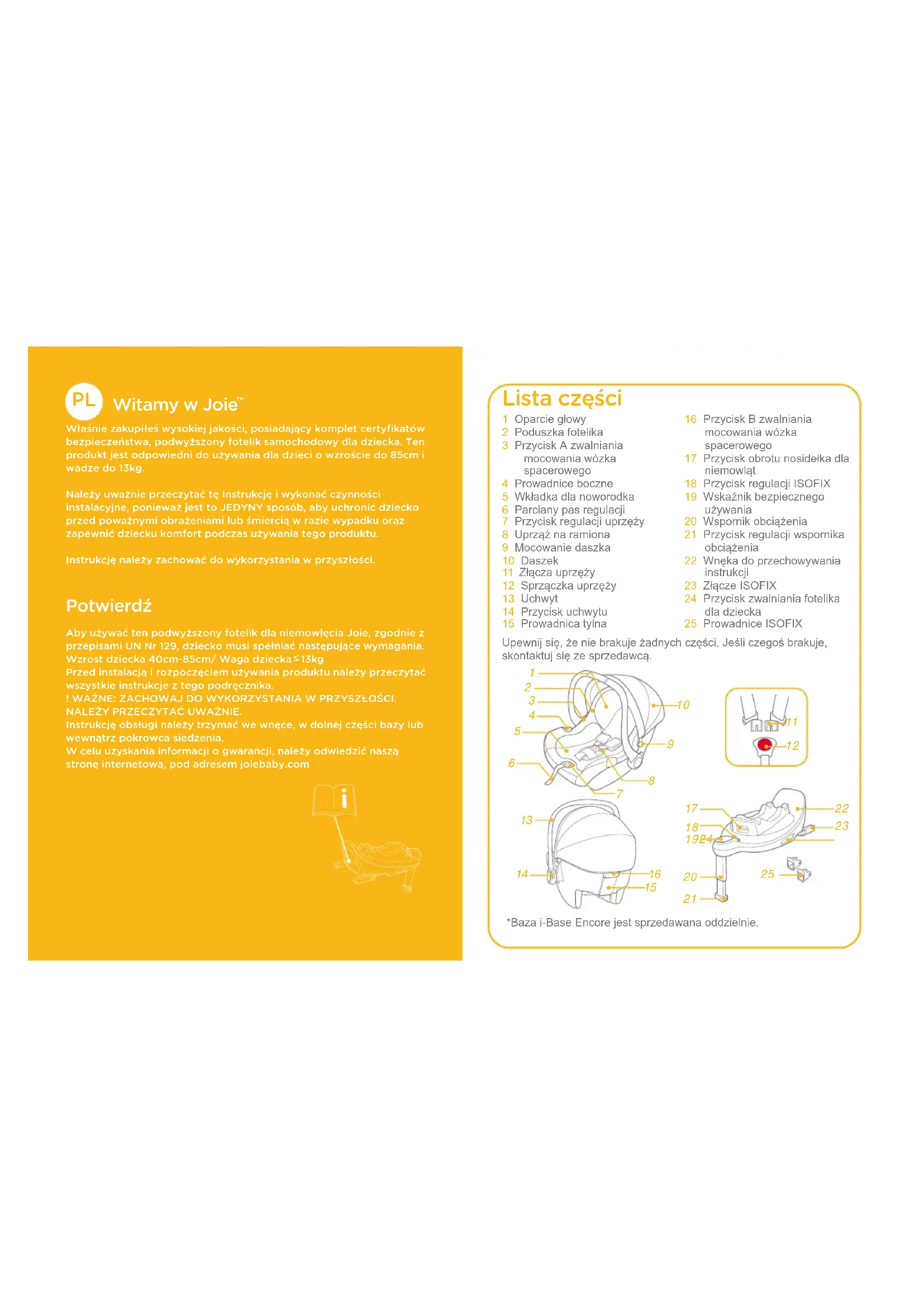 Właśnie zakupiłeś wysokiej jakości﹐ posiadający komplet certyfikatów bezpieczeństwa﹐ podwyższony fotelik samochodowy dla dziecka. Ten produkt jest odpowiedni do używania dla dzieci o wzroście do 85cm i wadze do 13kg.Należy uważnie przeczytać tę Instrukcję i wykonać czynności instalacyjne﹐ ponieważ jest to JEDYNY sposób﹐ aby uchronić dziecko przed poważnymi obrażeniami lub śmiercią w razie wypadku oraz zapewnić dziecku komfort podczas używania tego produktu.Instrukcję należy zachować do wykorzystania w przyszłości. Potwierdź Aby używać ten podwyższony fotelik dla niemowlęcia Joie﹐ zgodnie z przepisami UN Nr 129﹐ dziecko musi spełniać następujące wymagania.Wzrost dziecka 40cm-85cm/ Waga dziecka 13kgPrzed instalacją i rozpoczęciem używania produktu należy przeczytać wszystkie instrukcje z tego podręcznika.! WAŻNE: ZACHOWAJ DO WYKORZYSTANIA W PRZYSZŁOŚCI. NALEŻY PRZECZYTAĆ UWAŻNIE.Instrukcję obsługi należy trzymać we wnęce﹐ w dolnej części bazy lub wewnątrz pokrowca siedzenia.W celu uzyskania informacji o gwarancji﹐ należy odwiedzić naszą stronę internetową﹐ pod adresem joiebaby.com*Baza i-Base Encore jest sprzedawana oddzielnie.