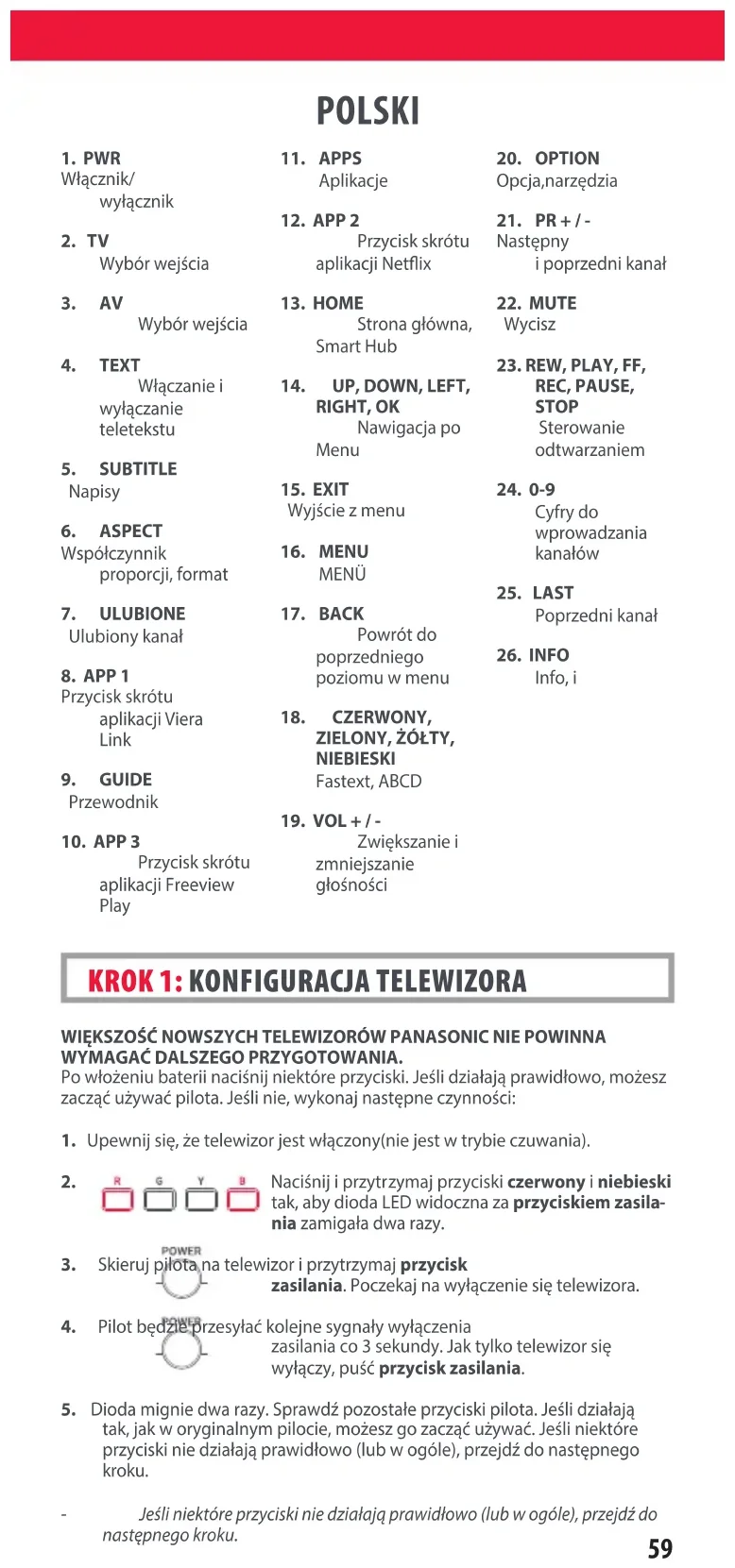 712188_Panasonic_manual URC4914_RDN1091120.indd 58712188_Panasonic_manual URC4914_RDN1091120.indd 58 09-11-2020 13:1509-11-2020 13:1559 POLSKI WIĘKSZOŚĆ NOWSZYCH TELEWIZORÓW PANASONIC NIE POWINNA WYMAGAĆ DALSZEGO PRZYGOTOWANIA. Po włożeniu baterii naciśnij niektóre przyciski. Jeśli działają prawidłowo, możesz zacząć używać pilota. Jeśli nie, wykonaj następne czynności: