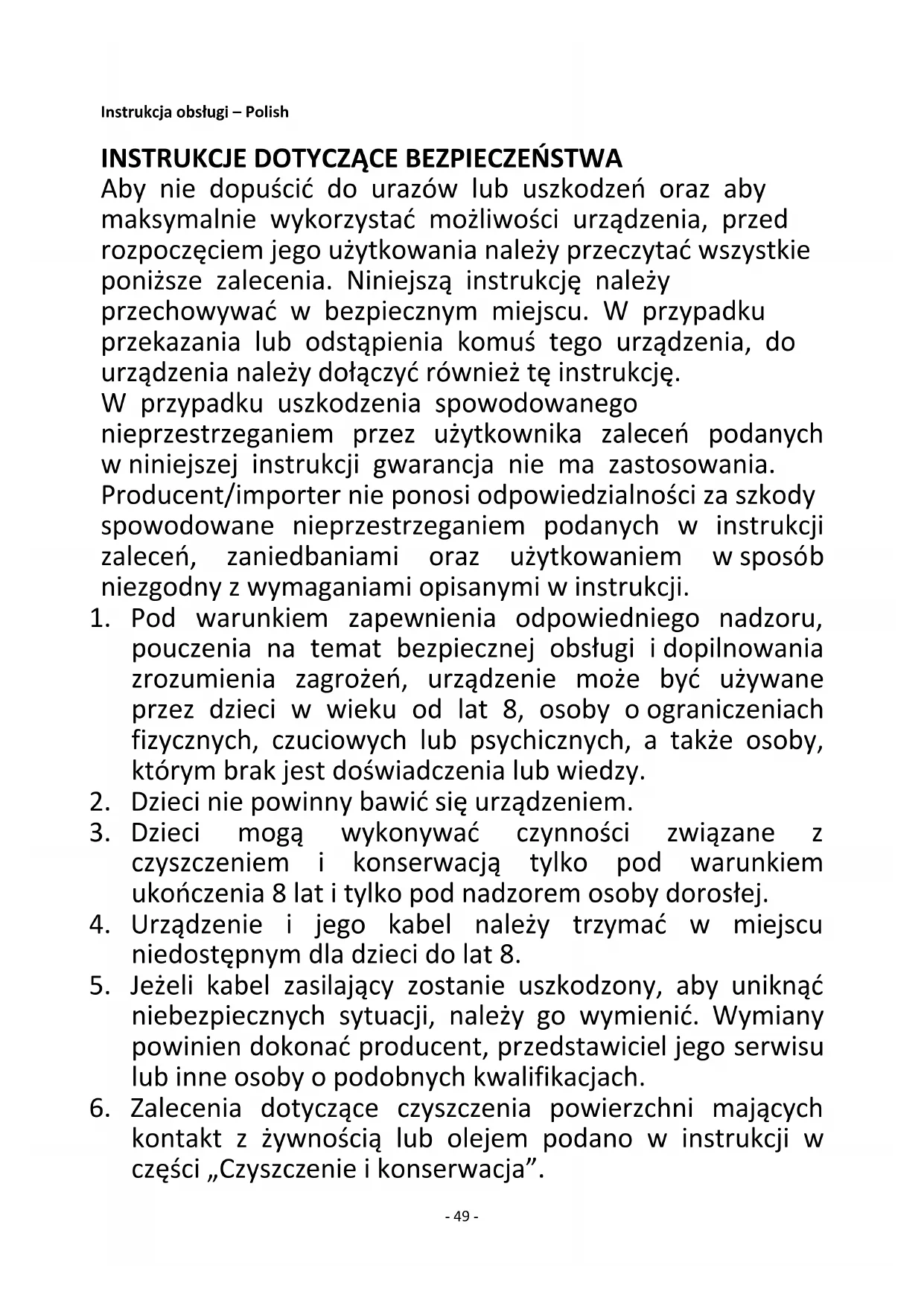Aby nie dopuścić do urazów lub uszkodzeń oraz aby maksymalnie wykorzystać możliwości urządzenia, przed rozpoczęciem jego użytkowania należy przeczytać wszystkie poniższe zalecenia. Niniejszą instrukcję należy przechowywać w bezpiecznym miejscu. W przypadku przekazania lub odstąpienia komuś tego urządzenia, do urządzenia należy dołączyć również tę instrukcję. W przypadku uszkodzenia spowodowanego nieprzestrzeganiem przez użytkownika zaleceń podanych w niniejszej instrukcji gwarancja nie ma zastosowania. Producent/importer nie ponosi odpowiedzialności za szkody spowodowane nieprzestrzeganiem podanych w instrukcji zaleceń, zaniedbaniami oraz użytkowaniem w sposób niezgodny z wymaganiami opisanymi w instrukcji.