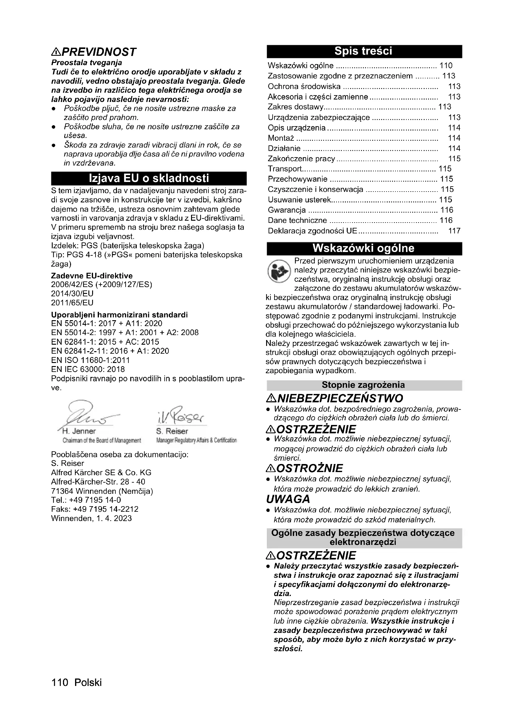- EN IEC 63000: 2018 Podpisniki ravnajo po navodilih in s pooblastilom upra- ve. Pooblaščena oseba za dokumentacijo: S. Reiser Alfred Kärcher SE & Co. KG Alfred-Kärcher-Str. 28 - 40 71364 Winnenden (Nemčija) Tel.: +49 7195 14-0 Faks: +49 7195 14-2212 Winnenden, 1. 4. 2023 Spis treści Wskazówki ogólne Przed pierwszym uruchomieniem urządzenia należy przeczytać niniejsze wskazówki bezpie- czeństwa, oryginalną instrukcję obsługi oraz załączone do zestawu akumulatorów wskazów- ki bezpieczeństwa oraz oryginalną instrukcję obsługi zestawu akumulatorów / standardowej ładowarki. Po- stępować zgodnie z podanymi instrukcjami. Instrukcje obsługi przechować do późniejszego wykorzystania lub dla kolejnego właściciela. Należy przestrzegać wskazówek zawartych w tej in- strukcji obsługi oraz obowiązujących ogólnych przepi- sów prawnych dotyczących bezpieczeństwa i zapobiegania wypadkom. Stopnie zagrożenia NIEBEZPIECZEŃSTWO ● Wskazówka dot. bezpośredniego zagrożenia, prowa- dzącego do ciężkich obrażeń ciała lub do śmierci. 몇 OSTRZEŻENIE ● Wskazówka dot. możliwie niebezpiecznej sytuacji, mogącej prowadzić do ciężkich obrażeń ciała lub śmierci. 몇 OSTROŻNIE ● Wskazówka dot. możliwie niebezpiecznej sytuacji, która może prowadzić do lekkich zranień. UWAGA ● Wskazówka dot. możliwie niebezpiecznej sytuacji, która może prowadzić do szkód materialnych. Ogólne zasady bezpieczeństwa dotyczące elektronarzędzi 몇 OSTRZEŻENIE ● Należy przeczytać wszystkie zasady bezpieczeń- stwa i instrukcje oraz zapoznać się z ilustracjami i specyfikacjami dołączonymi do elektronarzę- dzia. Nieprzestrzeganie zasad bezpieczeństwa i instrukcji może spowodować porażenie prądem elektrycznym lub inne ciężkie obrażenia. Wszystkie instrukcje i zasady bezpieczeństwa przechowywać w taki sposób, aby może było z nich korzystać w przy- szłości. Wskazówki ogólne p. 110