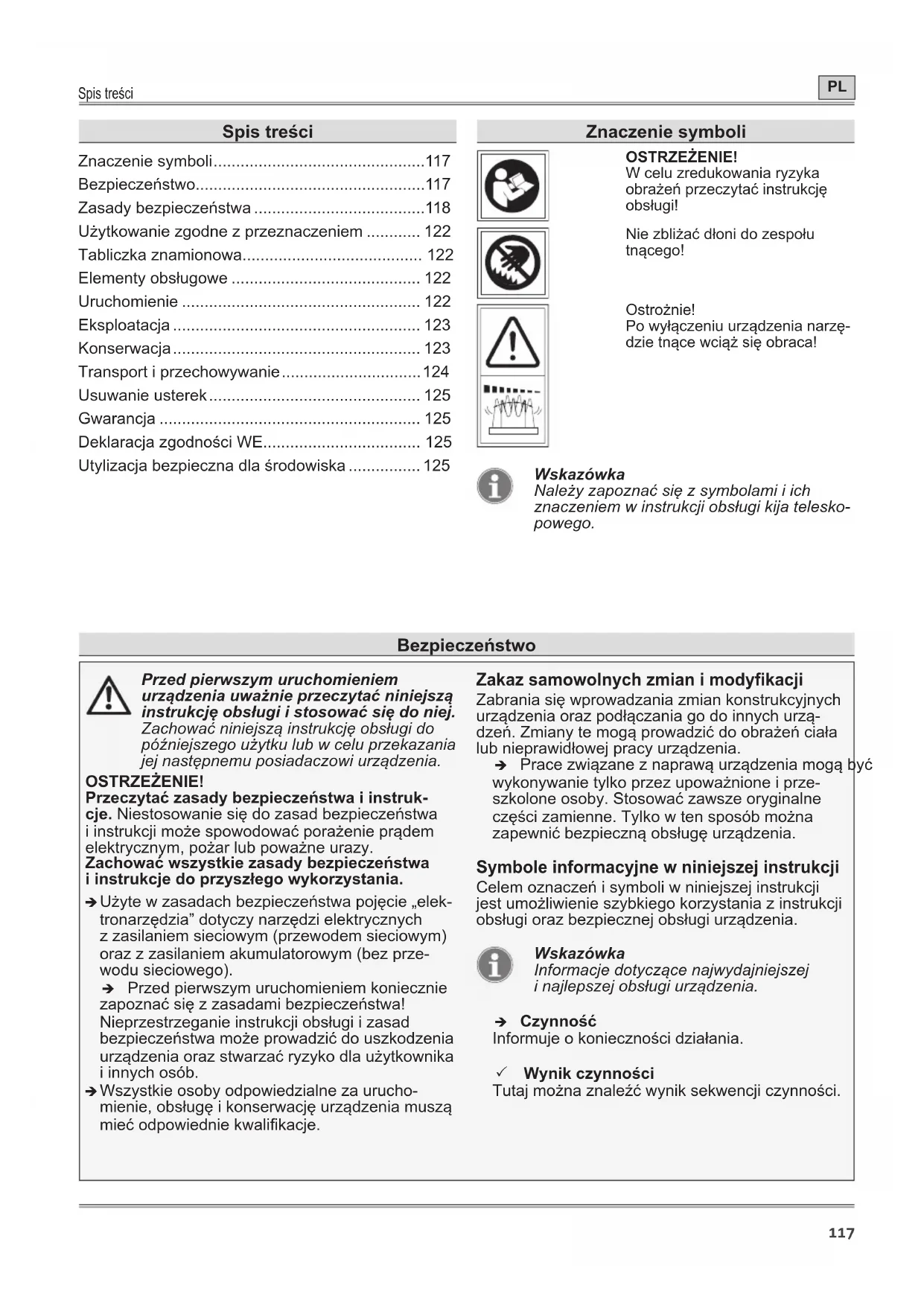- Utylizacja bezpieczna dla środowiska Znaczenie symboli OSTRZEŻENIE! W celu zredukowania ryzyka obrażeń przeczytać instrukcję obsługi! Nie zbliżać dłoni do zespołu tnącego! Ostrożnie! Po wyłączeniu urządzenia narzę- dzie tnące wciąż się obraca! Wskazówka Należy zapoznać się z symbolami i ich znaczeniem w instrukcji obsługi kija telesko- powego. Bezpieczeństwo Przed pierwszym uruchomieniem urządzenia uważnie przeczytać niniejszą instrukcję obsługi i stosować się do niej. Zachować niniejszą instrukcję obsługi do późniejszego użytku lub w celu przekazania jej następnemu posiadaczowi urządzenia. OSTRZEŻENIE! Przeczytać zasady bezpieczeństwa i instruk- cje. Niestosowanie się do zasad bezpieczeństwa i instrukcji może spowodować porażenie prądem elektrycznym, pożar lub poważne urazy. Zachować wszystkie zasady bezpieczeństwa i instrukcje do przyszłego wykorzystania. Î Użyte w zasadach bezpieczeństwa pojęcie „elek- tronarzędzia” dotyczy narzędzi elektrycznych z zasilaniem sieciowym (przewodem sieciowym) oraz z zasilaniem akumulatorowym (bez prze- wodu sieciowego). Î Przed pierwszym uruchomieniem koniecznie zapoznać się z zasadami bezpieczeństwa! Nieprzestrzeganie instrukcji obsługi i zasad bezpieczeństwa może prowadzić do uszkodzenia urządzenia oraz stwarzać ryzyko dla użytkownika i innych osób. Î Wszystkie osoby odpowiedzialne za urucho- mienie, obsługę i konserwację urządzenia muszą mieć odpowiednie kwalikacje. Zakaz samowolnych zmian i modyfikacji Zabrania się wprowadzania zmian konstrukcyjnych urządzenia oraz podłączania go do innych urzą- dzeń. Zmiany te mogą prowadzić do obrażeń ciała lub nieprawidłowej pracy urządzenia. Î Prace związane z naprawą urządzenia mogą być wykonywanie tylko przez upoważnione i prze- szkolone osoby. Stosować zawsze oryginalne części zamienne. Tylko w ten sposób można zapewnić bezpieczną obsługę urządzenia. Symbole informacyjne w niniejszej instrukcji Celem oznaczeń i symboli w niniejszej instrukcji jest umożliwienie szybkiego korzystania z instrukcji obsługi oraz bezpiecznej obsługi urządzenia. Wskazówka Informacje dotyczące najwydajniejszej i najlepszej obsługi urządzenia. Î Czynność Informuje o konieczności działania. 3 Wynik czynności Tutaj można znaleźć wynik sekwencji czynności.Bezpieczeństwo p. 125