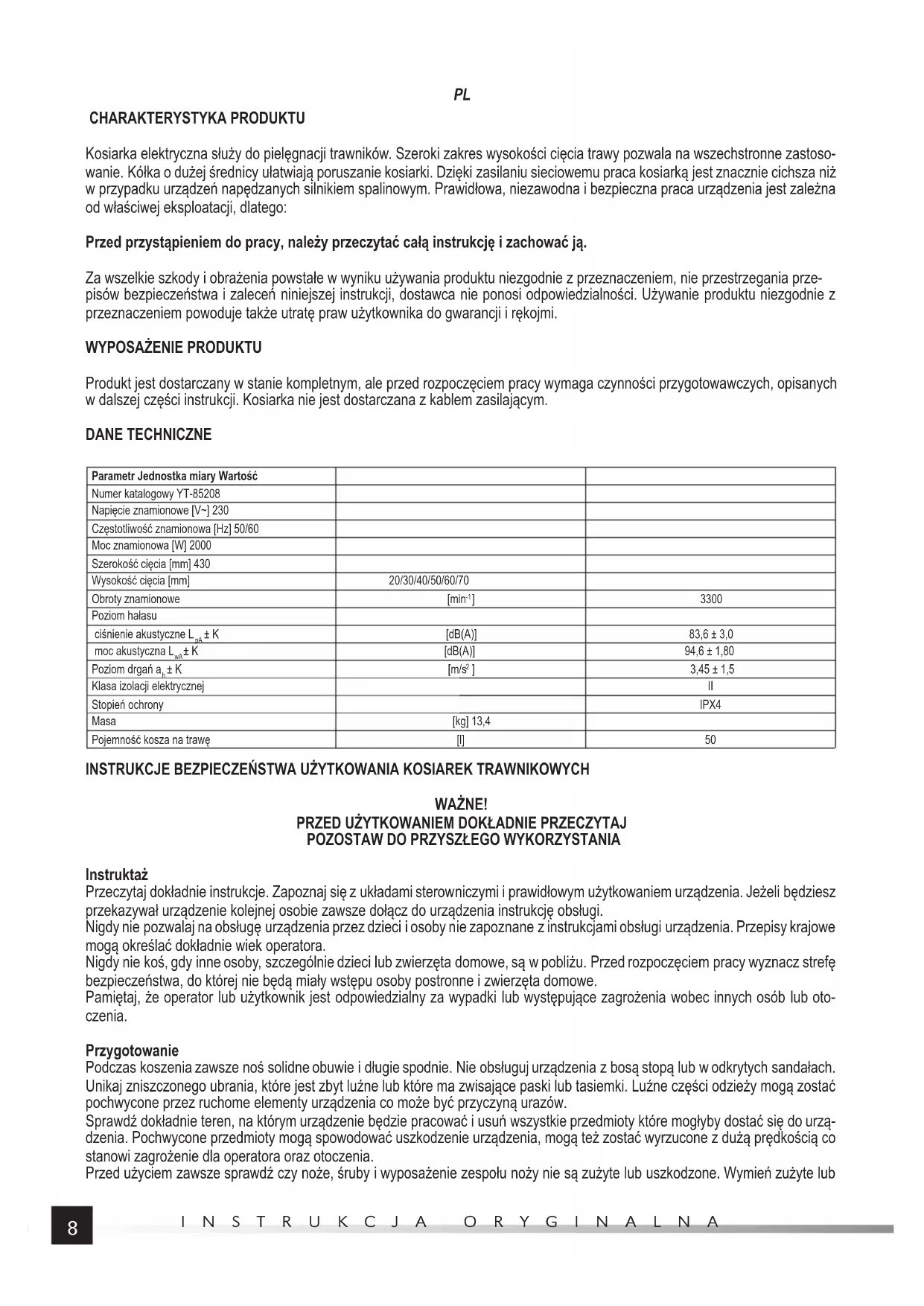 Produkt jest dostarczany w stanie kompletnym, ale przed rozpoczęciem pracy wymaga czynności przygotowawczych, opisanych w dalszej części instrukcji. Kosiarka nie jest dostarczana z kablem zasilającym. DANE TECHNICZNE Parametr Jednostka miary Wartość Numer katalogowy YT-85208 Napięcie znamionowe [V~] 230 Częstotliwość znamionowa [Hz] 50/60 Moc znamionowa [W] 2000 Szerokość cięcia [mm] 430 Wysokość cięcia [mm] 20/30/40/50/60/70 Obroty znamionowe [min
