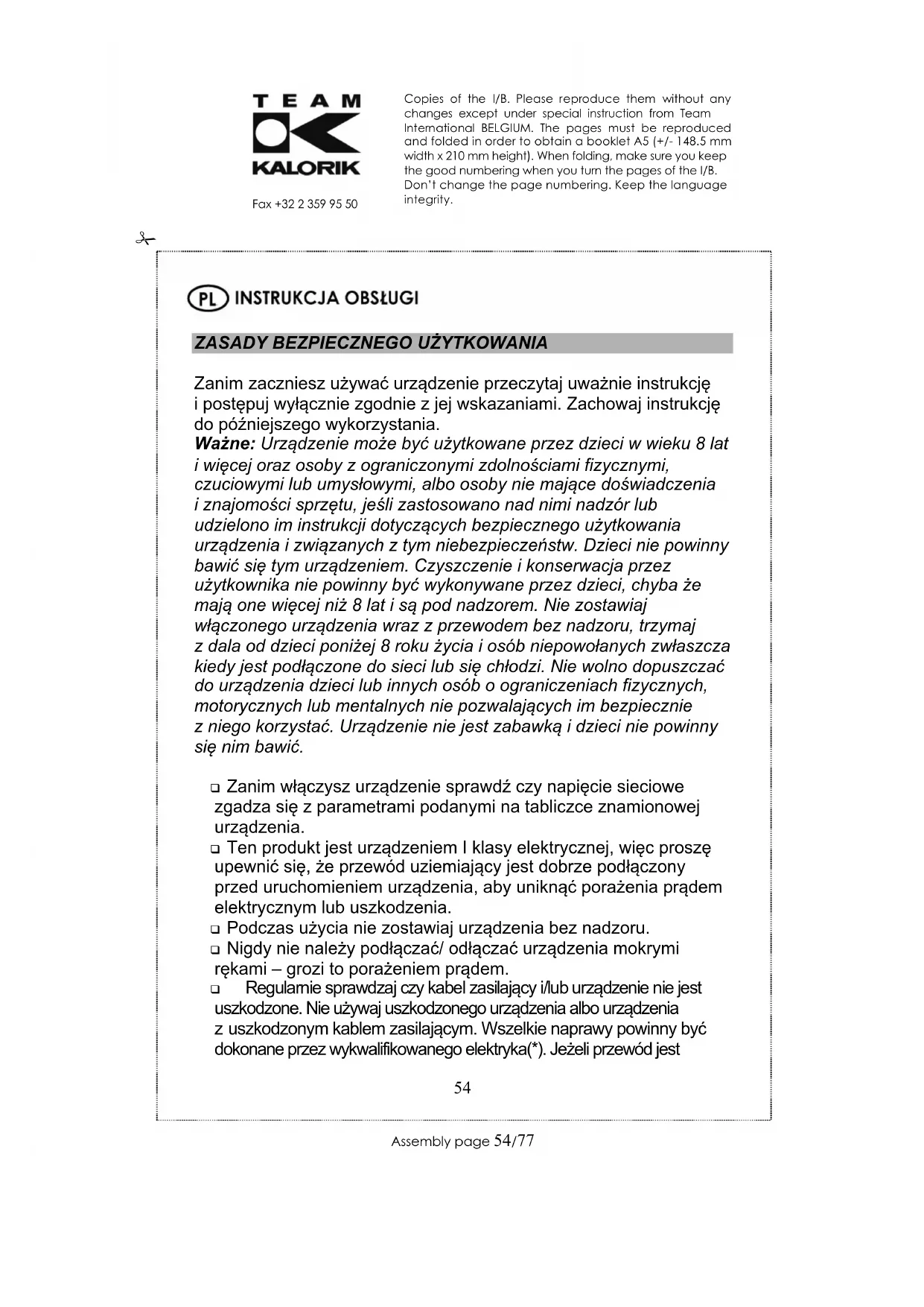 Zanim zaczniesz używać urządzenie przeczytaj uważnie instrukcję i postępuj wyłącznie zgodnie z jej wskazaniami. Zachowaj instrukcję do późniejszego wykorzystania. Ważne: Urządzenie może być użytkowane przez dzieci w wieku 8 lat i więcej oraz osoby z ograniczonymi zdolnościami fizycznymi, czuciowymi lub umysłowymi, albo osoby nie mające doświadczenia i znajomości sprzętu, jeśli zastosowano nad nimi nadzór lub udzielono im instrukcji dotyczących bezpiecznego użytkowania urządzenia i związanych z tym niebezpieczeństw. Dzieci nie powinny bawić się tym urządzeniem. Czyszczenie i konserwacja przez użytkownika nie powinny być wykonywane przez dzieci, chyba że mają one więcej niż 8 lat i są pod nadzorem. Nie zostawiaj włączonego urządzenia wraz z przewodem bez nadzoru, trzymaj z dala od dzieci poniżej 8 roku życia i osób niepowołanych zwłaszcza kiedy jest podłączone do sieci lub się chłodzi. Nie wolno dopuszczać do urządzenia dzieci lub innych osób o ograniczeniach fizycznych, motorycznych lub mentalnych nie pozwalających im bezpiecznie z niego korzystać. Urządzenie nie jest zabawką i dzieci nie powinny się nim bawić. q Zanim włączysz urządzenie sprawdź czy napięcie sieciowe zgadza się z parametrami podanymi na tabliczce znamionowej urządzenia. q Ten produkt jest urządzeniem I klasy elektrycznej, więc proszę upewnić się, że przewód uziemiający jest dobrze podłączony przed uruchomieniem urządzenia, aby uniknąć porażenia prądem elektrycznym lub uszkodzenia. q Podczas użycia nie zostawiaj urządzenia bez nadzoru. q Nigdy nie należy podłączać/ odłączać urządzenia mokrymi rękami – grozi to porażeniem prądem. q Regularnie sprawdzaj czy kabel zasilający i/lub urządzenie nie jest uszkodzone. Nie używaj uszkodzonego urządzenia albo urządzenia z uszkodzonym kablem zasilającym. Wszelkie naprawy powinny być dokonane przez wykwalifikowanego elektryka(*). Jeżeli przewód jestFax +32 2 359 95 50 Copies of the I/B. Please reproduce them without any changes except under special instruction from Team International BELGIUM. The pages must be reproduced and folded in order to obtain a booklet A5 (+/- 148.5 mm width x 210 mm height). When folding, make sure you keep the good numbering when you turn the pages of the I/B. Don’t change the page numbering. Keep the language integrity.