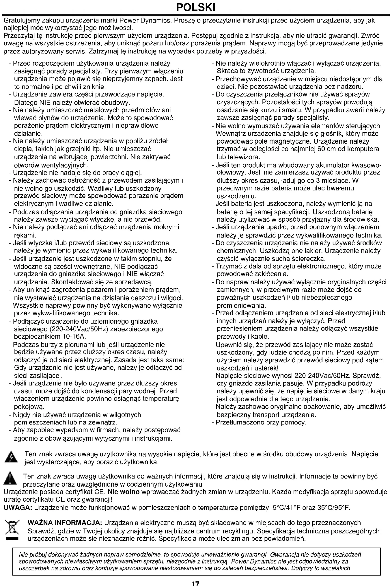 Pour des systèmes ligne 100 V, reliez l’amplificateur au premier haut-parleur dans le système en utilisant un câble haut-parleur à double isolation ayant la puissance adéquate pour supporter la sortie totale de l’amplificateur. Reliez la borne de sortie “100V“ à la borne (+) du haut-parleur et la sortie “COM“ à la borne (-). Reliez d'autres haut-parleurs en parallèle au premier haut-parleur avec tous les borniers positifs ensemble et reliez tous les borniers négatifs ensemble comme indiqué sur le schéma. Un système ligne 100 V peut se compose de plusieurs haut-parleurs reliés entre eux. Le facteur permettant de définir le nombre de haut-parleurs pouvant être reliés à un seul amplificateur est la puissance. Pour la majorité des applications, il est conseillé de relier autant de haut-parleurs que nécessaire avec une puissance combinée de 90% au plus de la puissance de sortie de l'amplificateur. Les bornes d'un haut-parleur 100 V sont reliées à un transformateur et dans certains cas, ce transformateur peut être utilisé pour différentes puissances. Ces réglages peuvent être utilisés pour régler la puissance (et le volume de sortie) de chaque haut-parleur dans le système pour obtenir la puissance totale idéale du système pour l'amplificateur. BORNIERS HP Ces borniers proposent une sortie basse tension (8Ω). Une sortie 70V/100V est également disponible. Notez qu'un câble uniquement doit être connecté à la borne COM et un câble à l'impédance ou tension sélectionnée. ATTENTION : Il n'est pas possible de faire des combinaisons multiples sur le niveau de sortie. Différents types de branchement sont prévus. La section basse impédance (8Ω) est conçue pour un petit nombre d'enceintes à connecter à votre amplificateur. Section 70V / 100V : spécifiquement conçue pour une distribution multiple. Si vous utilisez la sortie 70V/100W, les haut-parleurs doivent être équipés d'un transformateur 70V/100V. La quantité maximale de haut-parleurs à intégrer dans le système est fonction de la puissance délivrée par chaque haut-parleur. La puissance totale réglée sur le côté secondaire des transformateurs de la ligne de haut-parleurs ne doit pas dépasser la puissance de sortie RMS maximale. Un non-respect de ces données pourrait endommager durablement l'amplificateur.17 POLSKI Gratulujemy zakupu urządzenia marki Power Dynamics. Proszę o przeczytanie instrukcji przed użyciem urządzenia, aby jak najlepiej móc wykorzystać jego możliwości. Przeczytaj tę instrukcję przed pierwszym użyciem urządzenia. Postępuj zgodnie z instrukcją, aby nie utracić gwarancji. Zwróć uwagę na wszystkie ostrzeżenia, aby uniknąć pożaru lub/oraz porażenia prądem. Naprawy mogą być przeprowadzane jedynie przez autoryzowany serwis. Zatrzymaj tę instrukcję na wypadek potrzeby w przyszłości. - Przed rozpoczęciem użytkowania urządzenia należy zasięgnąć porady specjalisty. Przy pierwszym włączeniu urządzenia może pojawić się nieprzyjemny zapach. Jest to normalne i po chwili zniknie. - Urządzenie zawiera części przewodzące napięcie. Dlatego NIE należy otwierać obudowy. - Nie należy umieszczać metalowych przedmiotów ani wlewać płynów do urządzenia. Może to spowodować porażenie prądem elektrycznym i nieprawidłowe działanie. - Nie należy umieszczać urządzenia w pobliżu źródeł ciepła, takich jak grzejniki itp. Nie umieszczać urządzenia na wibrującej powierzchni. Nie zakrywać otworów wentylacyjnych. - Urządzenie nie nadaje się do pracy ciągłej. - Należy zachować ostrożność z przewodem zasilającym i nie wolno go uszkodzić. Wadliwy lub uszkodzony przewód sieciowy może spowodować porażenie prądem elektrycznym i wadliwe działanie. - Podczas odłączania urządzenia od gniazdka sieciowego należy zawsze wyciągać wtyczkę, a nie przewód. - Nie należy podłączać ani odłączać urządzenia mokrymi rękami. - Jeśli wtyczka i/lub przewód sieciowy są uszkodzone, należy je wymienić przez wykwalifikowanego technika. - Jeśli urządzenie jest uszkodzone w takim stopniu, że widoczne są części wewnętrzne, NIE podłączać urządzenia do gniazdka sieciowego i NIE włączać urządzenia. Skontaktować się ze sprzedawcą. - Aby uniknąć zagrożenia pożarem i porażeniem prądem, nie wystawiać urządzenia na działanie deszczu i wilgoci. - Wszystkie naprawy powinny być wykonywane wyłącznie przez wykwalifikowanego technika. - Podłączyć urządzenie do uziemionego gniazdka sieciowego (220-240Vac/50Hz) zabezpieczonego bezpiecznikiem 10-16A. - Podczas burzy z piorunami lub jeśli urządzenie nie będzie używane przez dłuższy okres czasu, należy odłączyć je od sieci elektrycznej. Zasada jest taka sama: Gdy urządzenie nie jest używane, należy je odłączyć od sieci zasilającej. - Jeśli urządzenie nie było używane przez dłuższy okres czasu, może dojść do kondensacji pary wodnej. Przed włączeniem urządzenie powinno osiągnąć temperaturę pokojową. - Nigdy nie używać urządzenia w wilgotnych pomieszczeniach lub na zewnątrz. - Aby zapobiec wypadkom w firmach, należy postępować zgodnie z obowiązującymi wytycznymi i instrukcjami. - Nie należy wielokrotnie włączać i wyłączać urządzenia. Skraca to żywotność urządzenia. - Przechowywać urządzenie w miejscu niedostępnym dla dzieci. Nie pozostawiać urządzenia bez nadzoru. - Do czyszczenia przełączników nie używać sprayów czyszczących. Pozostałości tych sprayów powodują osadzanie się kurzu i smaru. W przypadku awarii należy zawsze zasięgnąć porady specjalisty. - Nie wolno wymuszać używania elementów sterujących. - Wewnątrz urządzenia znajduje się głośnik, który może powodować pole magnetyczne. Urządzenie należy trzymać w odległości co najmniej 60 cm od komputera lub telewizora. - Jeśli ten produkt ma wbudowany akumulator kwasowo- ołowiowy. Jeśli nie zamierzasz uż