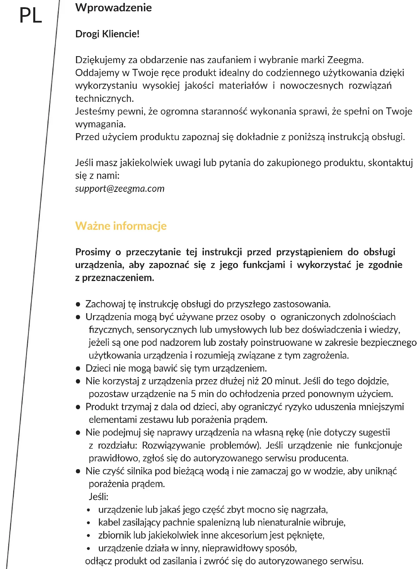 - Należy zachować ostrożność przy wyciskaniu soku z twardych warzyw i owoców (np. marchewka). Urządzenie może się szybciej przegrzać. Rozwiązywanie problemów Problem Sprawdź Rozwiązanie Wyciskarka nie działa Czy przewód zasilający jest podłączony? Sprawdź, czy przewód zasilający podłączony jest do gniazdka o mocy 220-240 V ~ 50-60 Hz. Czy wyciskarka jest złożona w sposób prawidłowy? Złóż produkt zgodnie z instrukcją. Czy włącznik jest poprawnie ustawiony? Aby włączyć urządzenie, przesuń przycisk na „STA”. Czy korzystano z urządzenia dłużej niż 20 minut? Wyłącz produkt. Zaczekaj chwilę, po czym uruchom go ponownie. Jeśli chcesz korzystać z urządzenia przez kolejne 20 minut, produkt potrzebuje godziny do pełnego schłodzenia.PL Problem Sprawdź Rozwiązanie Sok ma elementy miąższu lub sok wylatuje z ujścia na miąższ Czy poprawnie nałożono gumową uszczelkę? Nałóż lub popraw gumową uszczelkę w sposób opisany w instrukcji. Czy użyto świeżych warzyw lub owoców? Przejrzałe owoce lub warzywa mają mniej wody i mogą zatykać mechanizm wyciskarki. Jeśli chcesz użyć przejrzałych owoców, w pierwszej kolejności namocz je w wodzie mineralnej przez 10 lub więcej minut. Czy włożono do wyciskarki zbyt wiele produktów naraz? Przestaw włącznik na tryb obrotów wstecznych (REV), po kilku sekundach zatrzymaj urządzenie i ustaw na normalny tryb (STA). Wyciskarka zatrzymuje się w trakcie pracy Czy włożono do wyciskarki owoce/warzywa „na siłę”? Wyjmij część owoców lub warzyw Czy włożono do wyciskarki owoce/warzywa z twardymi pestkami? Przestaw włącznik na tryb obrotów wstecznych (REV), po kilku sekundach zatrzymaj urządzenie i ustaw na normalny tryb (STA). Miąższ jest zbyt mokry Czy sito się zapchało? Sprawdź czy w mechanizmie ślimaka nie znajduje się zbyt dużo miąższu. Przeczyść go. Silnik działa zbyt głośno lub wibruje Czy wszystkie elementy zestawu złożone są prawidłowo? Jeśli produkt złożony jest w sposób prawidłowy: to normalne, że urządzenie pracuje głośniej podczas wyciskania soku z przejrzałych owoców i warzyw. Pojemnik wibruje podczas pracy To normalne działanie produktu. Silnik wprawia w ruch pojemnik.PL Czyszczenie i konserwacja Nie używaj detergentów takich jak rozpuszczalnik, rozcieńczalnik, wybielacz lub innych środków, zawierających chlor albo benzen. Nie korzystaj też z materiałów ściernych. Przed czyszczeniem należy odłączyć urządzenie. Czyszczenie podstawy z silnikiem: Użyj miękkiej, wilgotnej ścierki. Nie zanurzaj podstawy sokowirówki w wodzie ani nie czyść jej pod bieżącą wodą. Do czyszczenia kabla i wtyczki użyj suchej ścierki. Czyszczenie ślimaka obrotowego: Użyj szczotki lub mokrej ścierki do wyczyszczenia pozostałości miąższu. Ślimak obrotowy może być czyszczony pod bieżącą wodą. Produkt należy czyścić po każdym użyciu. Czyszczenie pozostałych elementów zestawu: Nie używaj zmywarki. Nie osuszaj elementów przy pomocy np. suszarki. Po każdym użyciu należy wyczyścić produkt. Miąższ należy usunąć z urządzenia maksymalnie 5 minut po zakończeniu wyciskania. Produkt zgodny z wymaganiami dyrektyw Unii Europejskiej. Zgodnie z Dyrektywą 2012/19/UE, niniejszy produkt podlega zbiórce selektywnej. Produktu nie należy wyrzucać wraz z odpadami komunalnymi, gdyż może stanowić on zagrożenie dla środowiska i zdrowia ludzi. Zużyty produkt należy oddać do punktu recyklingu urządzeń elektrycznych i elektronicznych. Zdjęcia mają charakter poglądowy, rzeczywisty wygląd produktów może różnić się od prezentowanego na zdjęciach.IT Introduzione Genle Cliente! Grazie per aver riposto in noi la Vostra ducia e aver scelto un marchio Zeegma. Vi oriamo il prodoo ideale per l’uso quodiano grazie all’ulizzo di materiali di alta qualità e soluzioni tecniche moderne.Siamo sicuri che una grande cura nella lavorazione lo renderà conforme alle Vostre esigenze.Prima di ulizzare il prodoo, leggere aentamente il presente manuale. In caso di un qualsiasi commento o domanda sul prodoo acquistato, non esitate a contaarci: support@zeegma.com Informazioni importan Si prega di leggere questo manuale prima di ulizzare il disposivo per scoprire le sue funzioni e ulizzarle secondo lo scopo previsto.
