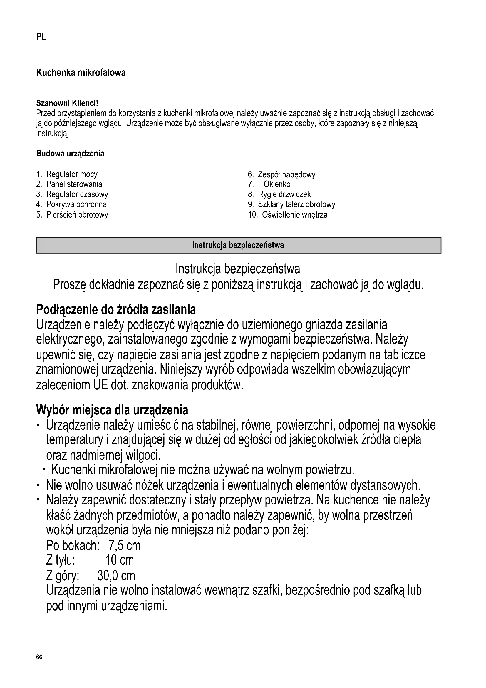 Instrukcja bezpieczeństwa Instrukcja bezpieczeństwa Proszę dokładnie zapoznać się z poniższą instrukcją i zachować ją do wglądu. Podłączenie do źródła zasilania Urządzenie należy podłączyć wyłącznie do uziemionego gniazda zasilania elektrycznego, zainstalowanego zgodnie z wymogami bezpieczeństwa. Należy upewnić się, czy napięcie zasilania jest zgodne z napięciem podanym na tabliczce znamionowej urządzenia. Niniejszy wyrób odpowiada wszelkim obowiązującym zaleceniom UE dot. znakowania produktów. Wybór miejsca dla urządzenia ∙ Urządzenie należy umieścić na stabilnej, równej powierzchni, odpornej na wysokie temperatury i znajdującej się w dużej odległości od jakiegokolwiek źródła ciepła oraz nadmiernej wilgoci. ∙ Kuchenki mikrofalowej nie można używać na wolnym powietrzu. ∙ Nie wolno usuwać nóżek urządzenia i ewentualnych elementów dystansowych. ∙ Należy zapewnić dostateczny i stały przepływ powietrza. Na kuchence nie należy kłaść żadnych przedmiotów, a ponadto należy zapewnić, by wolna przestrzeń wokół urządzenia była nie mniejsza niż podano poniżej: Po bokach: 7,5 cm Z tyłu: 10 cm Z góry: 30,0 cm Urządzenia nie wolno instalować wewnątrz szafki, bezpośrednio pod szafką lub pod innymi urządzeniami.67 142 x 208 mm Ważne wskazówki ∙ Ostrzeżenie: Niektóre rodzaje żywności mogą się łatwo zapalić. Nie pozostawiaj włączonego urządzenia bez nadzoru. ∙ Kuchenka mikrofalowa jest przeznaczona wyłącznie do rozmrażania, podgrzewania i gotowania potraw. Ostrzeżenie: Wszelkie próby suszenia żywności lub części garderoby, podgrzewania wkładek rozgrzewających, kapci, gąbek, mokrych ubrań itp. mogą doprowadzić do obrażeń ciała, spalenia lub pożaru. ∙ Producent nie ponosi odpowiedzialności za szkody wynikłe w skutek nieprawidłowego korzystania z urządzenia bądź nie stosowania się do niniejszej instrukcji. ∙ Można używać wyłącznie naczyń nadających się do mikrofalówki. Nie wolno używać metalowych pojemników w celu podgrzewania żywności i napojów w kuchence mikrofalowej. Więcej informacji na ten temat można znaleźć w punkcie pt. „Stosowanie odpowiednich naczyń kuchennych”. ∙ Urządzenie nie jest przystosowane do bycia uruchamianym przy użyciu zewnętrznego czasomierza lub odrębnego systemu zdalnego sterowania. ∙ Osoby o ograniczonych zdolnościach zycznych, czuciowych lub psychicznych albo nieposiadające stosownego doświadczenia lub wiedzy, a także dzieci (w wieku co najmniej 8 lat), mogą korzystać z urządzenia, pod warunkiem że znajdują się pod nadzorem lub zostały poinstruowane, jak używać urządzenia i są w pełni świadome wszelkich zagrożeń i wymaganych środków ostrożności. ∙ Nie dopuszczać do używania urządzenia jako zabawki przez dzieci. ∙ Nie wolno pozwalać dzieciom na wykonywanie jakichkolwiek prac związanych bezpośrednio z konserwacją lub czyszczeniem urządzenia bez nadzoru osoby dorosłej. ∙ Nie dopuszczać do urządzenia i jego przewodu zasilającego dzieci poniżej 8 lat. ∙ Zanurzanie urządzenia w wodzie i mycie go wodą jest niedozwolone i może grozić porażeniem prądem. ∙ Urządzenie nie może być czyszczone za pomocą myjki parowej. ∙ Urządzenie należy wyłączyć i wyjąć wtyczkę przewodu zasilającego z gniazdka elektrycznego: - przed przystąpieniem do czyszczenia lub mycia; - w przypadku stwierdzenia wadliwego działania; - po zakończeniu pracy. ∙ Wyjmując wtyczkę z gniazdka nigdy nie należy szarpać za przewód. Nie należy dotykać wtyczki mokrymi rękami.68 142 x 208 mm ∙ Ostrzeżenie: W czasie używania kuchenki, zewnętrzna obudowa urządzenia może się znacznie rozgrzać, a z otworów wentylacyjnych może wydobywać się gorąca para. Aby uniknąć oparzenia, należy w obu wypadkach przestrzegać zasad bezpieczeństwa. ∙ Nie wolno dopuścić, by urządzenie lub przewód zasilający dotykał rozgrzanych powierzchni lub znajdował się w bezpośrednim sąsiedztwie silnych źródeł ciepła. Przewód zasilający nie powinien swobodnie zwisać, ani też dotykać rozgrzanych elementów urządzenia. ∙ Nieutrzymywanie urządzenia w czystości może spowodować pogorszenie się jakości jego powierzchni, a następnie skrócenie okresu jego użytkowania, jak również zagrożenie dla bezpieczeństwa użytkownika. Dlatego wszelkie pozostawione resztki jedzenia należy od razu usuwać. Po każdym użyciu należy wyczyścić uszczelki drzwiczek, komorę kuchenki z podstawką obrotową i przyległe elementy wilgotną ściereczką. Ruszt do grillowania i podstawkę obrotową czyścić pod bieżącą wodą. Szczegółowe informacje na temat czyszczenia urządzenia znajdują się w punkcie Czyszczenie i konserwacja. ∙ Urządzenie przeznaczone jest do zastosowań domowych lub podobnych, jak np. w - kuchniach biurowych lub innych miejscach pracy; - agroturystyce; - przez klientów w hotelach, motelach i podobnych rodzajach środowisk mieszkalnych; - pensjonatach. ∙ Ostrzeżenie! Wszelkie reperacje kuchenki, które wymagają usunięcia pokryw chroniących przed promieniowaniem, są związane z dużym niebezpieczeństwem dla zdrowia i muszą być dokonywane przez odpowiednio wykwalikowany personel. W skład takich reperacji wchodzi wymiana specjalnego przewodu przyłączeniowego lub żarówki wewnątrz kuchenki. W przypadku niezbędnej naprawy prosimy o dostarczenie urządzenia do jednego z naszych punktów obsługi. Ich adresy podane są w karcie gwarancyjnej w języku polskim. ∙ Podczas podgrzewania płynów w kuchence mikrofalowej może się zdarzyć, iż płyn ulegnie zagotowaniu bez widocznych objawów wrzenia. Należy zatem zachować szczególną ostrożność w obchodzeniu się z pojemnikami, np. podczas wyjmowania ich z kuchenki. ∙ W kuchence mikrofalowej nie wolno podgrzewać jajek w skorupkach lub jajek ugotowanych na twardo, ponieważ mogą one eksplodować 