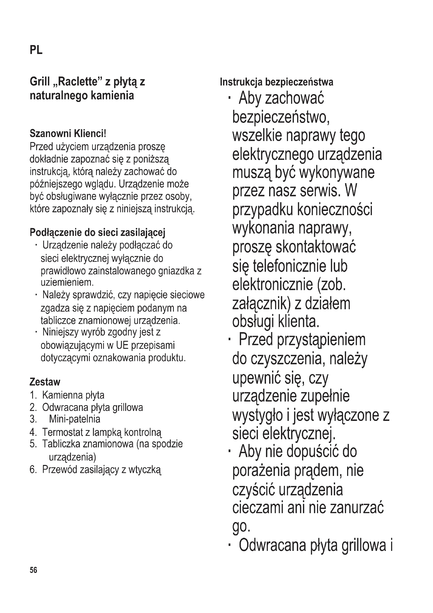 Zastosowanie Urządzenie to jest elektrycznym grillem raclette przeznaczonym do grillowania chudego mięsa, ryb i warzyw oraz przyrządzania sera „au gratin”. Każdy inne użycie urządzenia niż opisane w niniejszej instrukcji jest nieprawidłowe i może doprowadzić do obrażeń ciała lub szkód materialnych. Przed pierwszym użyciem ∙ Zdjąć wszystkie elementy opakowania. ∙ Przed pierwszym użyciem urządzenia wyczyścić dwustronną płytę grillową, płytę kamienną i mini-patelnie przy użyciu wilgotnej ściereczki. ∙ Włączyć urządzenie z nałożoną płytą grillową/kamienną oraz wsuniętymi mini-patelniami na około 10 minut bez żywności w celu pozbycia się specycznego zapachu, jaki pojawia się przy pierwszym włączeniu grilla (może się też pojawić nieco dymu). Z tego względu należy zapewnić w pomieszczeniu odpowiednią wentylację, otwierając okna lub drzwi balkonowe. ∙ Wyczyścić następnie urządzenie zgodnie z instrukcją zamieszczoną w punkcie Czyszczenie i konserwacja. Kamienna płyta ∙ Przed użyciem urządzenia, ułożyć na urządzeniu kamienną płytę, wypolerowaną stroną w górę, obok odwracanej płyty grillowej w taki sposób, aby zaokrąglone rogi znalazły się po zewnętrznej stronie. Ostrzeżenie: Nie należy kłaść zimnej płyty na gorącym elemencie grzewczym. ∙ Kamienną płytę można używać do pieczenia/smażenia warzyw, plasterków mięsa, ryb itp. ∙ Płyta kamienna wykonana jest z naturalnego materiału. Niewielkie pęknięcia wynikające z naturalnego rozkurczania i skurczania się płyty podczas ogrzewania i stygnięcia urządzenia są zjawiskiem normalnym, podobnie jak zmiana barwy na ciemniejszą. Nie ma to negatywnego wpływu na pracę urządzenia. ∙ Na płycie kamiennej nie należy umieszczać zamrożonej żywności ani produktów zawierających cukier (jak np. korniszony czy musztarda). Odwracana płyta grillowa ∙ Przed użyciem urządzenia, ułożyć na urządzeniu odwracaną płytę grillową, obok kamiennej płyty w taki sposób, aby zaokrąglone rogi znalazły się po zewnętrznej stronie. ∙ Kiedy odwracana płyta grillowa jest odwrócona żeberkowaną stroną do góry, można jej używać do grillowania mięsa, kiełbasek itp. Gładka strona sprawdza się przy grillowaniu ryb i warzyw. Przed użyciem płytę grillową należy posmarować niewielką ilością tłuszczu.60 104 x 142 mm Regulowany termostat ze wskaźnikiem świetlnym ∙ Termostat służy do regulowania temperatury pomiędzy poziomami MIN a MAX. ∙ Lampka kontrolna informuje o tym, czy włączony jest w danej chwili element grzejny: Ogrzewanie włączone = lampka włączona Ogrzewanie wyłączone = lampka wyłączona ∙ Po zakończeniu pracy, ustawić termostat na najniższą temperaturę i wyjąć wtyczkę z gniazdka elektrycznego. Instrukcja obsługi Porada: Aby grillowane mięso wyszło jak najlepiej, należy wyjąć je z lodówki około 30 minut wcześniej i odstawić na przykrytym talerzu. ∙ Ułożyć na urządzeniu płytę kamienną i grillową. ∙ Włożyć wtyczkę do kontaktu elektrycznego i przekręcić termostat maksymalnie w prawo. ∙ Pozostawić urządzenie na około 10 minut, aby płyty osiągnęły odpowiednią temperaturę. Użycie płyty kamiennej wymaga rozgrzewania przez około 25 minut. ∙ Umieścić produkt przeznaczony do przygotowania na odwracanej płycie grillowej albo na kamiennej, wedle potrzeby. ∙ Do mini-patelni włożyć ser raclette. Włożyć mini-patelnie pod element grzewczy i zostawić je tak długo, aż ser się rozpuści. ∙ Ostrzeżenie: Nie wkładać pustych mini-patelni do włączonego urządzenia. ∙ Po zakończeniu pracy, przekręcić regulator termostatu maksymalnie w lewo i wyjąć wtyczkę z kontaktu. Jak przyrządzić ser raclette Użyć od 200 do 300 gramów sera na osobę. Pokroić ser na plasterki o grubości od 3 do 5 mm i ułożyć je na mini- patelniach. Najlepiej użyć oryginalnego sera „Raclette”, aczkolwiek można użyć każdego innego sera, który szybko się rozpuszcza. Kilka praktycznych rad ∙ Przed rozpoczęciem smażenia lub grillowania zamrożona wcześniej żywność powinna być zawsze dokładnie rozmrożona. ∙ Aby nie uszkodzić warstwy ochronnej odwracanej płyty grillowej i mini-patelni, używać wyłącznie odpowiednich przyborów, które nie powodują tarcia. ∙ Podczas przyrządzania większej ilości żywności należy regularnie i ostrożnie usuwać nagromadzony tłuszcz; w tym celu użyć ręcznika papierowego lub innego podobnego. Czyszczenie i konserwacja ∙ Przed przystąpieniem do czyszczenia, należy sprawdzić, czy urządzenie zupełnie ostygło i jest wyłączone z sieci elektrycznej. ∙ Aby nie dopuścić do porażenia prądem, nie czyścić urządzenia cieczami ani nie zanurzać go.104 x 142 mm