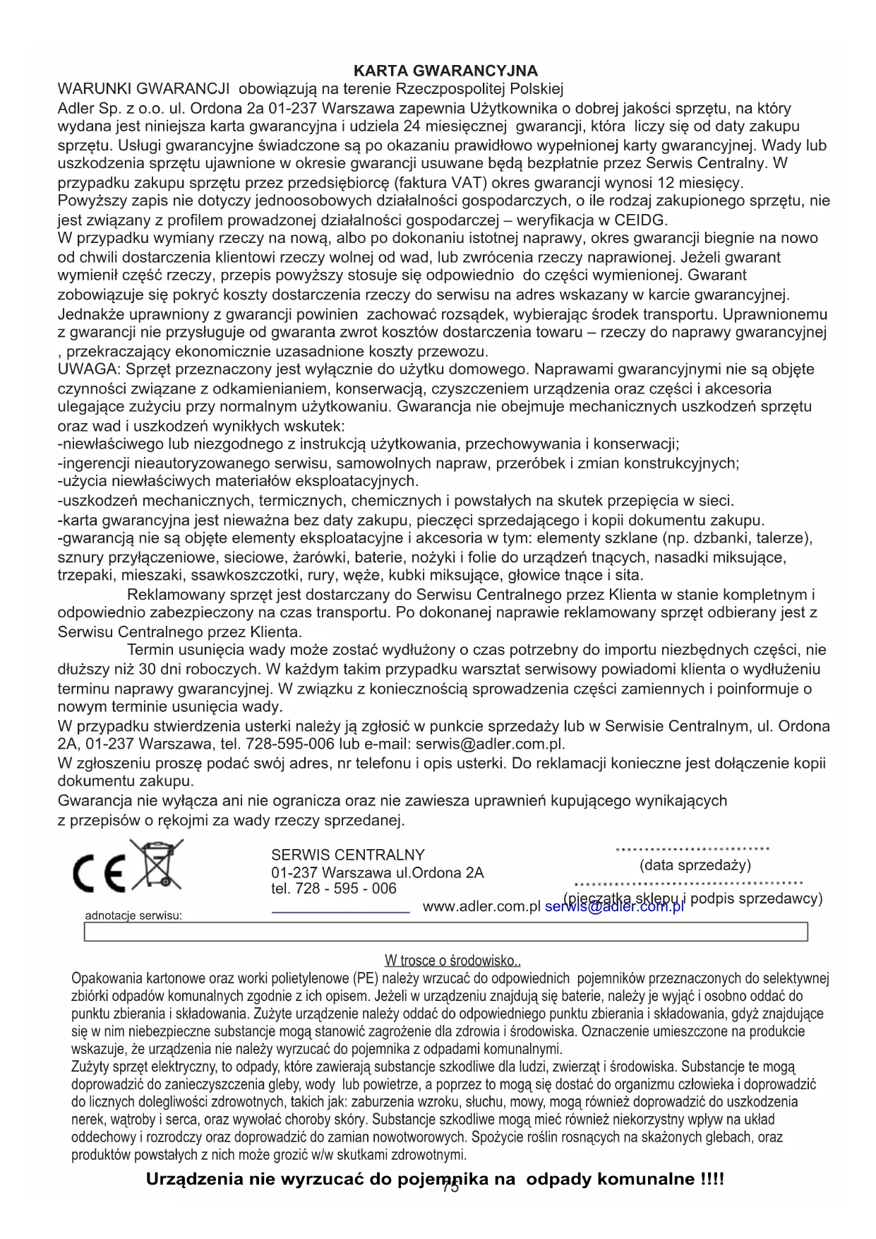 W przypadku chęci zakupu części zamiennych lub zgłoszenia ewentualnych reklamacji należy kontaktować się bezpośrednio ze sprzedawcą, który wystawił paragon.