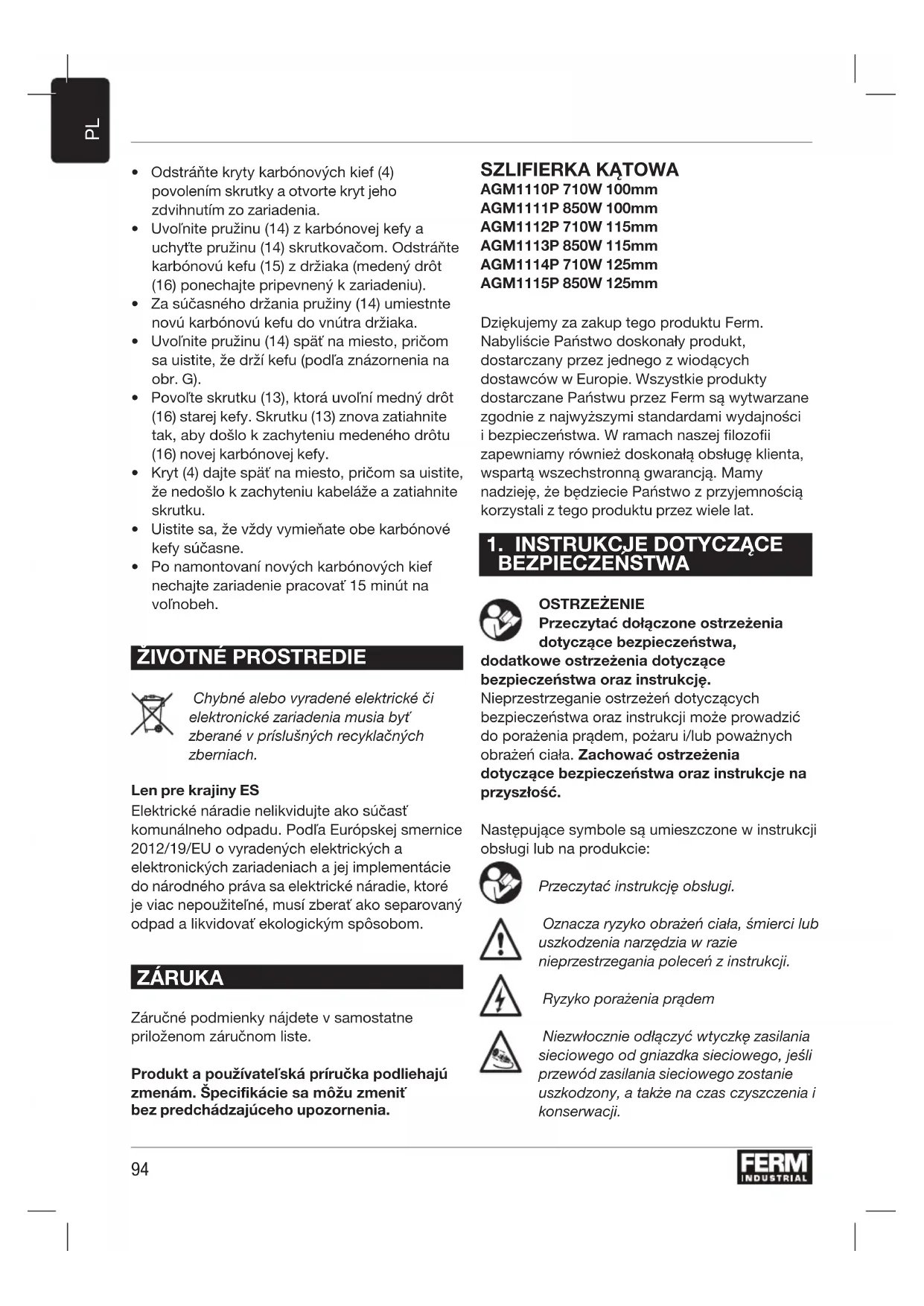 AGM1110P 710W 100mm AGM1111P 850W 100mm AGM1112P 710W 115mm AGM1113P 850W 115mm AGM1114P 710W 125mm AGM1115P 850W 125mm Dziękujemy za zakup tego produktu Ferm. Nabyliście Państwo doskonały produkt, dostarczany przez jednego z wiodących dostawców w Europie. Wszystkie produkty dostarczane Państwu przez Ferm są wytwarzane zgodnie z najwyższymi standardami wydajności i bezpieczeństwa. W ramach naszej filozofii zapewniamy również doskonałą obsługę klienta, wspartą wszechstronną gwarancją. Mamy nadzieję, że będziecie Państwo z przyjemnością korzystali z tego produktu przez wiele lat.
