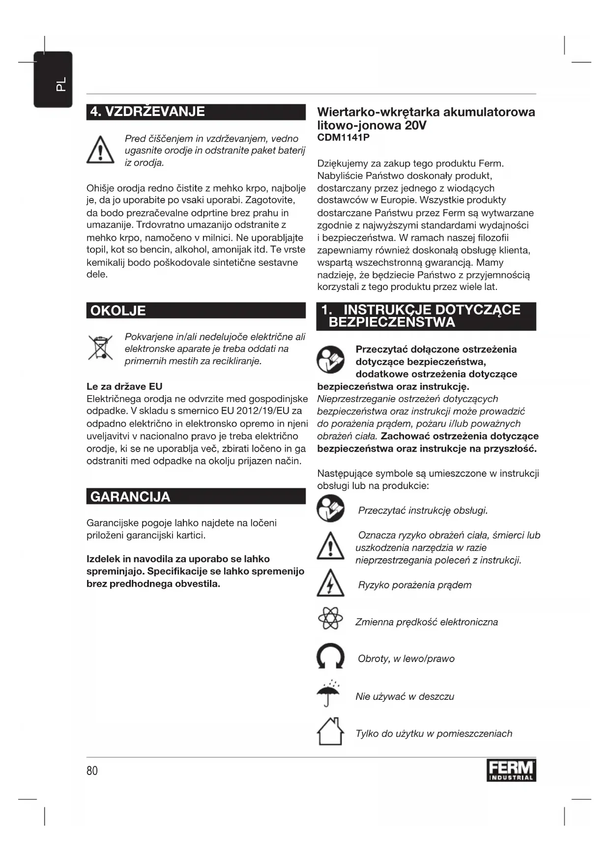 spowodują uszkodzenie części z tworzyw sztucznych. ŚRODOWISKO Uszkodzone i/lub niepotrzebne urządzenia elektryczne lub elektroniczne podlegają zbiórce w odpowiednich punktach recyklingu. Tylko kraje WE Nie wyrzucać elektronarzędzi wraz z odpadami z gospodarstw domowych. Zgodnie z dyrektywą 2012/19/EU dotyczącą zużytych urządzeń elektrycznych i elektronicznych oraz jej wdrożeniem do prawodawstwa krajowego, elektronarzędzia, które już nie nadają się do użytku, podlegają oddzielnej zbiórce oraz utylizacji w sposób przyjazny dla środowiska. GWARANCJA Warunki gwarancji są opisane w oddzielnej, dołączonej karcie gwarancyjnej. Produkt i instrukcja obsługi podlegają zmianom. Dane techniczne podlegają zmianom bez uprzedzenia. Akumuliatorinis ličio jonų gręžtuvas 20 V CDM1141P Ačiū, kad įsigijote šį „Ferm“ gaminį. Dabar turite puikų gaminį, kurį pateikia vieni svarbiausių Europos tiekėjų. Visi „Ferm“ tiekiami gaminiai yra pagaminti pagal aukščiausius veikimo ir saugos standartus. Be to, mes užtikriname puikią techninę priežiūrą, pagrįstą mūsų visapusiška garantija. Mes tikimės, kad šis įrankis puikiai tarnaus jums ilgus metus.
