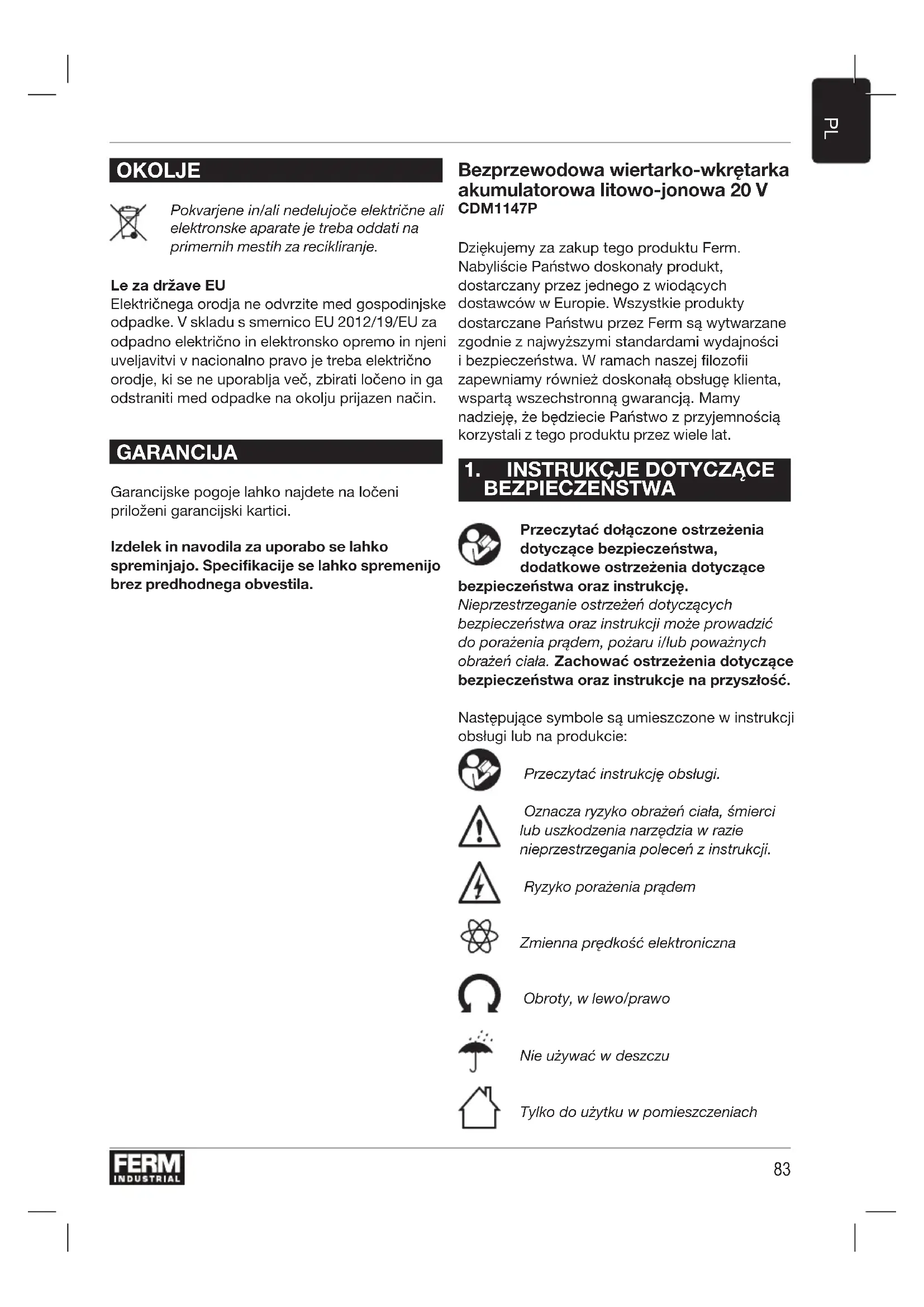 OKOLJE Pokvarjene in/ali nedelujoče električne ali elektronske aparate je treba oddati na primernih mestih za recikliranje. LezadržaveEU Električnega orodja ne odvrzite med gospodinjske odpadke. V skladu s smernico EU 2012/19/EU za odpadno električno in elektronsko opremo in njeni uveljavitvi v nacionalno pravo je treba električno orodje, ki se ne uporablja več, zbirati ločeno in ga odstraniti med odpadke na okolju prijazen način. GARANCIJA Garancijske pogoje lahko najdete na ločeni priloženi garancijski kartici. Izdelek in navodila za uporabo se lahko spreminjajo. Specifikacije se lahko spremenijo brez predhodnega obvestila. Bezprzewodowawiertarko-wkrętarka akumulatorowa litowo-jonowa 20 V CDM1147P Dziękujemy za zakup tego produktu Ferm. Nabyliście Państwo doskonały produkt, dostarczany przez jednego z wiodących dostawców w Europie. Wszystkie produkty dostarczane Państwu przez Ferm są wytwarzane zgodnie z najwyższymi standardami wydajności i bezpieczeństwa. W ramach naszej filozofii zapewniamy również doskonałą obsługę klienta, wspartą wszechstronną gwarancją. Mamy nadzieję, że będziecie Państwo z przyjemnością korzystali z tego produktu przez wiele lat.