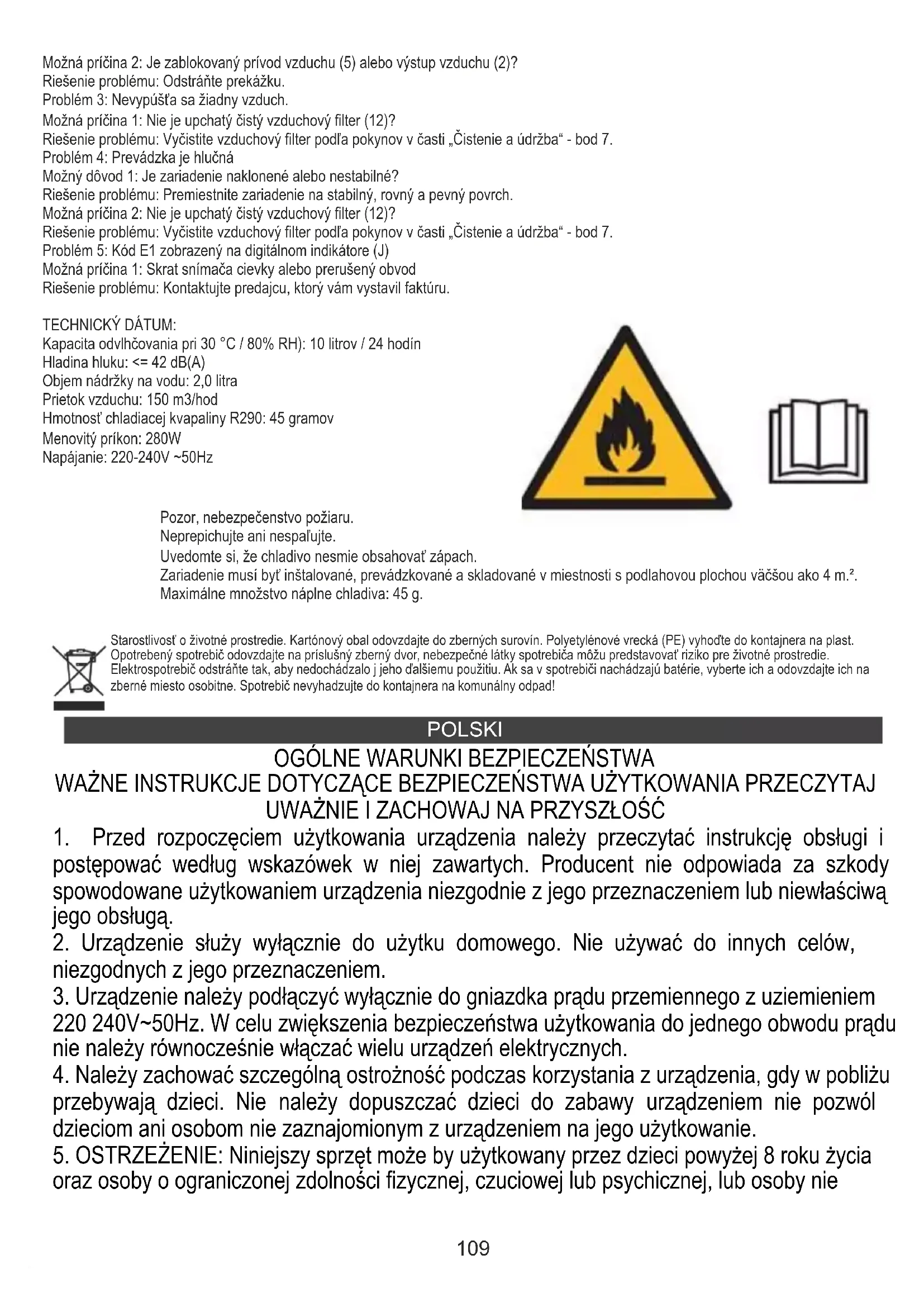 W przypadku wystąpienia wymienionego poniżej stanu, przed skontaktowaniem się z działem obsługi klienta należy sprawdzić następujące elementy. Problem 1: Urządzenie nie działa. Możliwa przyczyna 1: Czy przewód zasilający został odłączony?114 Rozwiązanie problemu: Podłącz przewód zasilający do gniazdka. Możliwa przyczyna 2: Czy miga wskaźnik pełnego zbiornika na wodę (H)? Rozwiązanie problemu: Zbiornik jest pełny lub znajduje się w niewłaściwej pozycji. Opróżnij zbiornik na wodę (7), a następnie ponownie umieść zbiornik. Możliwy powód 3: Czy temperatura w pomieszczeniu jest wyższa niż 35 stopni Celsjusza lub niższa niż 5 stopni Celsjusza? Rozwiązanie problemu: Zadziałało wbudowane zabezpieczenie i osuszacz nie może zostać uruchomiony w temperaturze pomieszczenia powyżej 35 stopni Celsjusza lub poniżej 5 stopni Celsjusza. Problem 2: Funkcja osuszania nie działa Możliwa przyczyna 1: Czy filtr siatkowy powietrza (12) jest zatkany? Rozwiązanie problemu 1: Wyczyść filtr powietrza zgodnie z instrukcją w punkcie „Czyszczenie i konserwacja” – punkt 7. Możliwa przyczyna 2: Czy wlot powietrza (5) lub wylot powietrza (2) jest zatkany? Rozwiązanie problemu: Usuń przeszkodę. Problem 3: Powietrze nie jest odprowadzane. Możliwa przyczyna 1: Czy filtr siatkowy powietrza (12) jest zatkany? Rozwiązanie problemu: Wyczyść filtr powietrza zgodnie z instrukcją w punkcie „Czyszczenie i konserwacja” – punkt 7. Problem 4: Praca jest głośna Możliwa przyczyna 1: Czy urządzenie jest przechylone lub ustawione niestabilnie? Rozwiązanie problemu: Ustaw urządzenie na stabilnej, równej i solidnej powierzchni. Możliwa przyczyna 2: Czy siatkowy filtr powietrza (12) jest zatkany? Rozwiązanie problemu: Wyczyść filtr powietrza zgodnie z instrukcją w punkcie „Czyszczenie i konserwacja” – punkt 7. Problem 5: Kod E1 pokazany na wskaźniku cyfrowym (J) Możliwa przyczyna 1: Zwarcie lub przerwa w obwodzie czujnika cewki Rozwiązanie problemu: Skontaktuj się ze sprzedawcą, który wystawił Ci rachunek zakupu. DANE TECHNICZNE: Wydajność osuszania przy 30°C / 80% wilgotności względnej): 10 litrów / 24 godziny Poziom hałasu: <= 42 dB (A) Pojemność zbiornika na wodę: 2,0 litry Przepływ powietrza: 150 m3/godz. Masa płynu chłodzącego R290: 45 gramów Znamionowa moc wejściowa: 280W Zasilanie: 220-240V ~50Hz Ostrożnie, ryzyko pożaru. NIE przekłuwać ani nie spalać. Należy pamiętać, że czynnik chłodniczy może nie wydzielać zapachu. Maksymalna ilość czynnika chłodniczego: 35g. Uwaga, ryzyko pożaru. NIE przekłuwać ani nie spalać. Należy pamiętać, że czynnik chłodniczy może nie zawierać zapachu. Urządzenie należy instalować, obsługiwać i przechowywać w pomieszczeniu o powierzchni podłogi większej niż 4 m.². Maksymalna ilość czynnika chłodniczego: 45g.115 KARTA GWARANCYJNA WARUNKI GWARANCJI obowiązują na terenie Rzeczpospolitej Polskiej Adler Sp. z o.o. ul. Ordona 2a 01-237 Warszawa zapewnia Użytkownika o dobrej jakości sprzętu, na który wydana jest niniejsza karta gwarancyjna i udziela 24 miesięcznej gwarancji, która liczy się od daty zakupu sprzętu. Usługi gwarancyjne świadczone są po okazaniu prawidłowo wypełnionej karty gwarancyjnej. Wady lub uszkodzenia sprzętu ujawnione w okresie gwarancji usuwane będą bezpłatnie przez Serwis Centralny. W przypadku zakupu sprzętu przez przedsiębiorcę (faktura VAT) okres gwarancji wynosi 12 miesięcy. Powyższy zapis nie dotyczy jednoosobowych działalności gospodarczych, o ile rodzaj zakupionego sprzętu, nie jest związany z profilem prowadzonej działalności gospodarczej – weryfikacja w CEIDG. W przypadku wymiany rzeczy na nową, albo po dokonaniu istotnej naprawy, okres gwarancji biegnie na nowo od chwili dostarczenia klientowi rzeczy wolnej od wad, lub zwrócenia rzeczy naprawionej. Jeżeli gwarant wymienił część rzeczy, przepis powyższy stosuje się odpowiednio do części wymienionej. Gwarant zobowiązuje się pokryć koszty dostarczenia rzeczy do serwisu na adres wskazany w karcie gwarancyjnej. Jednakże uprawniony z gwarancji powinien zachować rozsądek, wybierając środek transportu. Uprawnionemu z gwarancji nie przysługuje od gwaranta zwrot kosztów dostarczenia towaru – rzeczy do naprawy gwarancyjnej , przekraczający ekonomicznie uzasadnione koszty przewozu. UWAGA: Sprzęt przeznaczony jest wyłącznie do użytku domowego. Naprawami gwarancyjnymi nie są objęte czynności związane z odkamienianiem, konserwacją, czyszczeniem urządzenia oraz części i akcesoria ulegające zużyciu przy normalnym użytkowaniu. Gwarancja nie obejmuje mechanicznych uszkodzeń sprzętu oraz wad i uszkodzeń wynikłych wskutek: -niewłaściwego lub niezgodnego z instrukcją użytkowania, przechowywania i konserwacji; -ingerencji nieautoryzowanego serwisu, samowolnych napraw, przeróbek i zmian konstrukcyjnych; -użycia niewłaściwych materiałów eksploatacyjnych. -uszkodzeń mechanicznych, termicznych, chemicznych i powstałych na skutek przepięcia w sieci. -karta gwarancyjna jest nieważna bez daty zakupu, pieczęci sprzedającego i kopii dokumentu zakupu. -gwarancją nie są objęte elementy eksploatacyjne i akcesoria w tym: elementy szklane (np. dzbanki, talerze), sznury przyłączeniowe, sieciowe, żarówki, baterie, nożyki i folie do urządzeń tnących, nasadki miksujące, trzepaki, mieszaki, ssawkoszczotki, rury, węże, kubki miksujące, głowice tnące i sita. Reklamowany sprzęt jest dostarczany do Serwisu Centralnego przez Klienta w stanie kompletnym i odpowiednio zabezpieczony na czas transportu. Po dokonanej naprawie reklamowany sprzęt odbierany jest z Serwisu Centralnego przez Klienta. Termin usunięcia wady może zostać wydłużony o czas potrzebny do importu niezbędnych części, nie dłuższy niż 30 dni roboczych. W każdym takim przypadku warsztat serwisowy powiadomi klienta o wydłużeniu terminu napraw