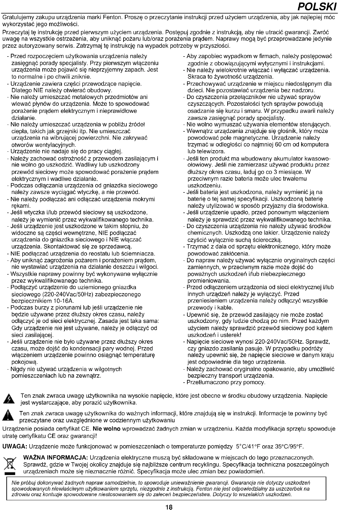 Si un mot de passe est demandé, vous pouvez saisir "0000". Attention: la distance BT est de 10 mètres environ sans obstacle.18 POLSKI Gratulujemy zakupu urządzenia marki Fenton. Proszę o przeczytanie instrukcji przed użyciem urządzenia, aby jak najlepiej móc wykorzystać jego możliwości. Przeczytaj tę instrukcję przed pierwszym użyciem urządzenia. Postępuj zgodnie z instrukcją, aby nie utracić gwarancji. Zwróć uwagę na wszystkie ostrzeżenia, aby uniknąć pożaru lub/oraz porażenia prądem. Naprawy mogą być przeprowadzane jedynie przez autoryzowany serwis. Zatrzymaj tę instrukcję na wypadek potrzeby w przyszłości. - Przed rozpoczęciem użytkowania urządzenia należy zasięgnąć porady specjalisty. Przy pierwszym włączeniu urządzenia może pojawić się nieprzyjemny zapach. Jest to normalne i po chwili zniknie. - Urządzenie zawiera części przewodzące napięcie. Dlatego NIE należy otwierać obudowy. - Nie należy umieszczać metalowych przedmiotów ani wlewać płynów do urządzenia. Może to spowodować porażenie prądem elektrycznym i nieprawidłowe działanie. - Nie należy umieszczać urządzenia w pobliżu źródeł ciepła, takich jak grzejniki itp. Nie umieszczać urządzenia na wibrującej powierzchni. Nie zakrywać otworów wentylacyjnych. - Urządzenie nie nadaje się do pracy ciągłej. - Należy zachować ostrożność z przewodem zasilającym i nie wolno go uszkodzić. Wadliwy lub uszkodzony przewód sieciowy może spowodować porażenie prądem elektrycznym i wadliwe działanie. - Podczas odłączania urządzenia od gniazdka sieciowego należy zawsze wyciągać wtyczkę, a nie przewód. - Nie należy podłączać ani odłączać urządzenia mokrymi rękami. - Jeśli wtyczka i/lub przewód sieciowy są uszkodzone, należy je wymienić przez wykwalifikowanego technika. - Jeśli urządzenie jest uszkodzone w takim stopniu, że widoczne są części wewnętrzne, NIE podłączać urządzenia do gniazdka sieciowego i NIE włączać urządzenia. Skontaktować się ze sprzedawcą. - NIE podłączać urządzenia do reostatu lub ściemniacza. - Aby uniknąć zagrożenia pożarem i porażeniem prądem, nie wystawiać urządzenia na działanie deszczu i wilgoci. - Wszystkie naprawy powinny być wykonywane wyłącznie przez wykwalifikowanego technika. - Podłączyć urządzenie do uziemionego gniazdka sieciowego (220-240Vac/50Hz) zabezpieczonego bezpiecznikiem 10-16A. - Podczas burzy z piorunami lub jeśli urządzenie nie będzie używane przez dłuższy okres czasu, należy odłączyć je od sieci elektrycznej. Zasada jest taka sama: Gdy urządzenie nie jest używane, należy je odłączyć od sieci zasilającej. - Jeśli urządzenie nie było używane przez dłuższy okres czasu, może dojść do kondensacji pary wodnej. Przed włączeniem urządzenie powinno osiągnąć temperaturę pokojową. - Nigdy nie używać urządzenia w wilgotnych pomieszczeniach lub na zewnątrz. - Aby zapobiec wypadkom w firmach, należy postępować zgodnie z obowiązującymi wytycznymi i instrukcjami. - Nie należy wielokrotnie włączać i wyłączać urządzenia. Skraca to żywotność urządzenia. - Przechowywać urządzenie w miejscu niedostępnym dla dzieci. Nie pozostawiać urządzenia bez nadzoru. - Do czyszczenia przełączników nie używać sprayów czyszczących. Pozostałości tych sprayów powodują osadzanie się kurzu i smaru. W przypadku awarii należy zawsze zasięgnąć porady specjalisty. - Nie wolno wymuszać używania elementów sterujących. - Wewnątrz urządzenia znajduje się głośnik, który może powodować pole magnetyczne. Urządzenie należy trzymać w odległości co najmniej 60 cm od komputera lub telewizora. - Jeśli ten produkt ma wbudowany akumulator kwasowo- ołowiowy. Jeśli nie zamierzasz używać produktu przez dłuższy okres czasu, ładuj go co 3 miesiące. W przeciwnym razie bateria może ulec trwałemu uszkodzeniu. - Jeśli bateria jest uszkodzona, należy wymienić ją na baterię o tej samej specyfikacji. Uszkodzoną baterię należy utylizować w sposób przyjazny dla środowiska. - Jeśli urządzenie upadło, przed ponownym włączeniem należy je sprawdzić przez wykwalifikowanego technika. - Do czyszczenia urządzenia nie należy używać środków chemicznych. Uszkodzą one lakier. Urządzenie należy czyścić wyłącznie suchą ściereczką. - Trzymać z dala od sprzętu elektronicznego, który może powodować zakłócenia. - Do napraw należy używać wyłącznie oryginalnych części zamiennych, w przeciwnym razie może dojść do poważnych uszkodzeń i/lub niebezpiecznego promieniowania. - Przed odłączeniem urządzenia od sieci elektrycznej i/lub innych urządzeń należy je wyłączyć. Przed przeniesieniem urządzenia należy odłączyć wszystkie przewody i kable. - Upewnić się, że przewód zasilający nie może zostać uszkodzony, gdy ludzie chodzą po nim. Przed każdym użyciem należy sprawdzić przewód sieciowy pod kątem uszkodzeń i usterek! - Napięcie sieciowe wynosi 220-240Vac/50Hz. Sprawdź, czy gniazdo zasilania pasuje. W przypadku podróży należy upewnić się, że napięcie sieciowe w danym kraju jest odpowiednie dla tego urządzenia. - Należy zachować oryginalne opakowanie, aby umożliwić bezpieczny transport urządzenia. - Przetłumaczono przy pomocy. Ten znak zwraca uwagę użytkownika na wysokie napięcie, które jest obecne w środku obudowy urządzenia. Napięcie jest wystarczające, aby porazić użytkownika. Ten znak zwraca uwagę użytkownika do ważnych informacji, które znajdują się w instrukcji. Informacje te powinny być przeczytane oraz uwzględnione w codziennym użytkowaniu Urządzenie posiada certyfikat CE. Nie wolno wprowadzać żadnych zmian w urządzeniu. Każda modyfikacja sprzętu spowoduje utratę certyfikatu CE oraz gwarancji! UWAGA: Urządzenie może funkcjonować w pomieszczeniach o temperaturze pomiędzy 5°C/41°F oraz 35°C/95°F. WAŻNA INFORMACJA: Ur