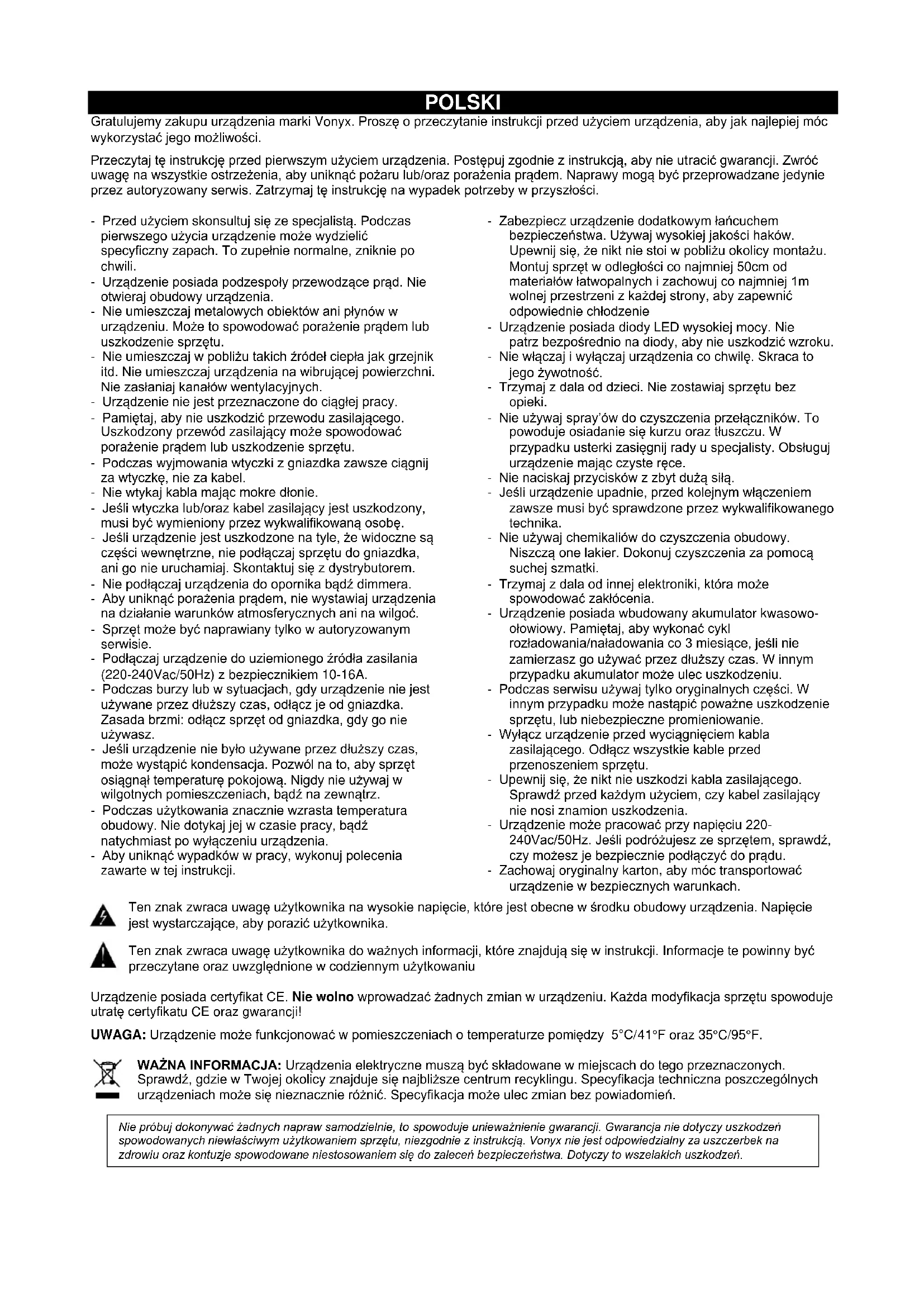 - Si la télécommande ne fonctionne pas correctement ou si la portée d’utilisation diminue, remplacez l’ensemble des batteries par des batteries neuves. Si une batterie venait à couler, essuyez le liquide dans le compartiment, insérez des batteries neuves. En condition normale, les batteries peuvent être utilisées pendant un an.POLSKI Gratulujemy zakupu urządzenia marki Vonyx. Proszę o przeczytanie instrukcji przed użyciem urządzenia, aby jak najlepiej móc wykorzystać jego możliwości. Przeczytaj tę instrukcję przed pierwszym użyciem urządzenia. Postępuj zgodnie z instrukcją, aby nie utracić gwarancji. Zwróć uwagę na wszystkie ostrzeżenia, aby uniknąć pożaru lub/oraz porażenia prądem. Naprawy mogą być przeprowadzane jedynie przez autoryzowany serwis. Zatrzymaj tę instrukcję na wypadek potrzeby w przyszłości. - Przed użyciem skonsultuj się ze specjalistą. Podczas pierwszego użycia urządzenie może wydzielić specyficzny zapach. To zupełnie normalne, zniknie po chwili. - Urządzenie posiada podzespoły przewodzące prąd. Nie otwieraj obudowy urządzenia. - Nie umieszczaj metalowych obiektów ani płynów w urządzeniu. Może to spowodować porażenie prądem lub uszkodzenie sprzętu. - Nie umieszczaj w pobliżu takich źródeł ciepła jak grzejnik itd. Nie umieszczaj urządzenia na wibrującej powierzchni. Nie zasłaniaj kanałów wentylacyjnych. - Urządzenie nie jest przeznaczone do ciągłej pracy. - Pamiętaj, aby nie uszkodzić przewodu zasilającego. Uszkodzony przewód zasilający może spowodować porażenie prądem lub uszkodzenie sprzętu. - Podczas wyjmowania wtyczki z gniazdka zawsze ciągnij za wtyczkę, nie za kabel. - Nie wtykaj kabla mając mokre dłonie. - Jeśli wtyczka lub/oraz kabel zasilający jest uszkodzony, musi być wymieniony przez wykwalifikowaną osobę. - Jeśli urządzenie jest uszkodzone na tyle, że widoczne są części wewnętrzne, nie podłączaj sprzętu do gniazdka, ani go nie uruchamiaj. Skontaktuj się z dystrybutorem. - Nie podłączaj urządzenia do opornika bądź dimmera. - Aby uniknąć porażenia prądem, nie wystawiaj urządzenia na działanie warunków atmosferycznych ani na wilgoć. - Sprzęt może być naprawiany tylko w autoryzowanym serwisie. - Podłączaj urządzenie do uziemionego źródła zasilania (220-240Vac/50Hz) z bezpiecznikiem 10-16A. - Podczas burzy lub w sytuacjach, gdy urządzenie nie jest używane przez dłuższy czas, odłącz je od gniazdka. Zasada brzmi: odłącz sprzęt od gniazdka, gdy go nie używasz. - Jeśli urządzenie nie było używane przez dłuższy czas, może wystąpić kondensacja. Pozwól na to, aby sprzęt osiągnął temperaturę pokojową. Nigdy nie używaj w wilgotnych pomieszczeniach, bądź na zewnątrz. - Podczas użytkowania znacznie wzrasta temperatura obudowy. Nie dotykaj jej w czasie pracy, bądź natychmiast po wyłączeniu urządzenia. - Aby uniknąć wypadków w pracy, wykonuj polecenia zawarte w tej instrukcji. - Zabezpiecz urządzenie dodatkowym łańcuchem bezpieczeństwa. Używaj wysokiej jakości haków. Upewnij się, że nikt nie stoi w pobliżu okolicy montażu. Montuj sprzęt w odległości co najmniej 50cm od materiałów łatwopalnych i zachowuj co najmniej 1m wolnej przestrzeni z każdej strony, aby zapewnić odpowiednie chłodzenie - Urządzenie posiada diody LED wysokiej mocy. Nie patrz bezpośrednio na diody, aby nie uszkodzić wzroku. - Nie włączaj i wyłączaj urządzenia co chwilę. Skraca to jego żywotność. - Trzymaj z dala od dzieci. Nie zostawiaj sprzętu bez opieki. - Nie używaj spray’ów do czyszczenia przełączników. To powoduje osiadanie się kurzu oraz tłuszczu. W przypadku usterki zasięgnij rady u specjalisty. Obsługuj urządzenie mając czyste ręce. - Nie naciskaj przycisków z zbyt dużą siłą. - Jeśli urządzenie upadnie, przed kolejnym włączeniem zawsze musi być sprawdzone przez wykwalifikowanego technika. - Nie używaj chemikaliów do czyszczenia obudowy. Niszczą one lakier. Dokonuj czyszczenia za pomocą suchej szmatki. - Trzymaj z dala od innej elektroniki, która może spowodować zakłócenia. - Urządzenie posiada wbudowany akumulator kwasowo- ołowiowy. Pamiętaj, aby wykonać cykl rozładowania/naładowania co 3 miesiące, jeśli nie zamierzasz go używać przez dłuższy czas. W innym przypadku akumulator może ulec uszkodzeniu. - Podczas serwisu używaj tylko oryginalnych części. W innym przypadku może nastąpić poważne uszkodzenie sprzętu, lub niebezpieczne promieniowanie. - Wyłącz urządzenie przed wyciągnięciem kabla zasilającego. Odłącz wszystkie kable przed przenoszeniem sprzętu. - Upewnij się, że nikt nie uszkodzi kabla zasilającego. Sprawdź przed każdym użyciem, czy kabel zasilający nie nosi znamion uszkodzenia. - Urządzenie może pracować przy napięciu 220- 240Vac/50Hz. Jeśli podróżujesz ze sprzętem, sprawdź, czy możesz je bezpiecznie podłączyć do prądu. - Zachowaj oryginalny karton, aby móc transportować urządzenie w bezpiecznych warunkach. Ten znak zwraca uwagę użytkownika na wysokie napięcie, które jest obecne w środku obudowy urządzenia. Napięcie jest wystarczające, aby porazić użytkownika. Ten znak zwraca uwagę użytkownika do ważnych informacji, które znajdują się w instrukcji. Informacje te powinny być przeczytane oraz uwzględnione w codziennym użytkowaniu Urządzenie posiada certyfikat CE. Nie wolno wprowadzać żadnych zmian w urządzeniu. Każda modyfikacja sprzętu spowoduje utratę certyfikatu CE oraz gwarancji! UWAGA: Urządzenie może funkcjonować w pomieszczeniach o temperaturze pomiędzy 5°C/41°F oraz 35°C/95°F. WAŻNA INFORMACJA: Urządzenia elektryczne muszą być składowane w miejscach do tego przeznaczonych. Sprawdź, gdzie w Twojej okolicy znajduje się najbliższe centrum recyklingu. Specyfikacja techniczna poszczególnych urządzeniach może się nieznacznie różnić. Specyfikacja może ulec zmian 