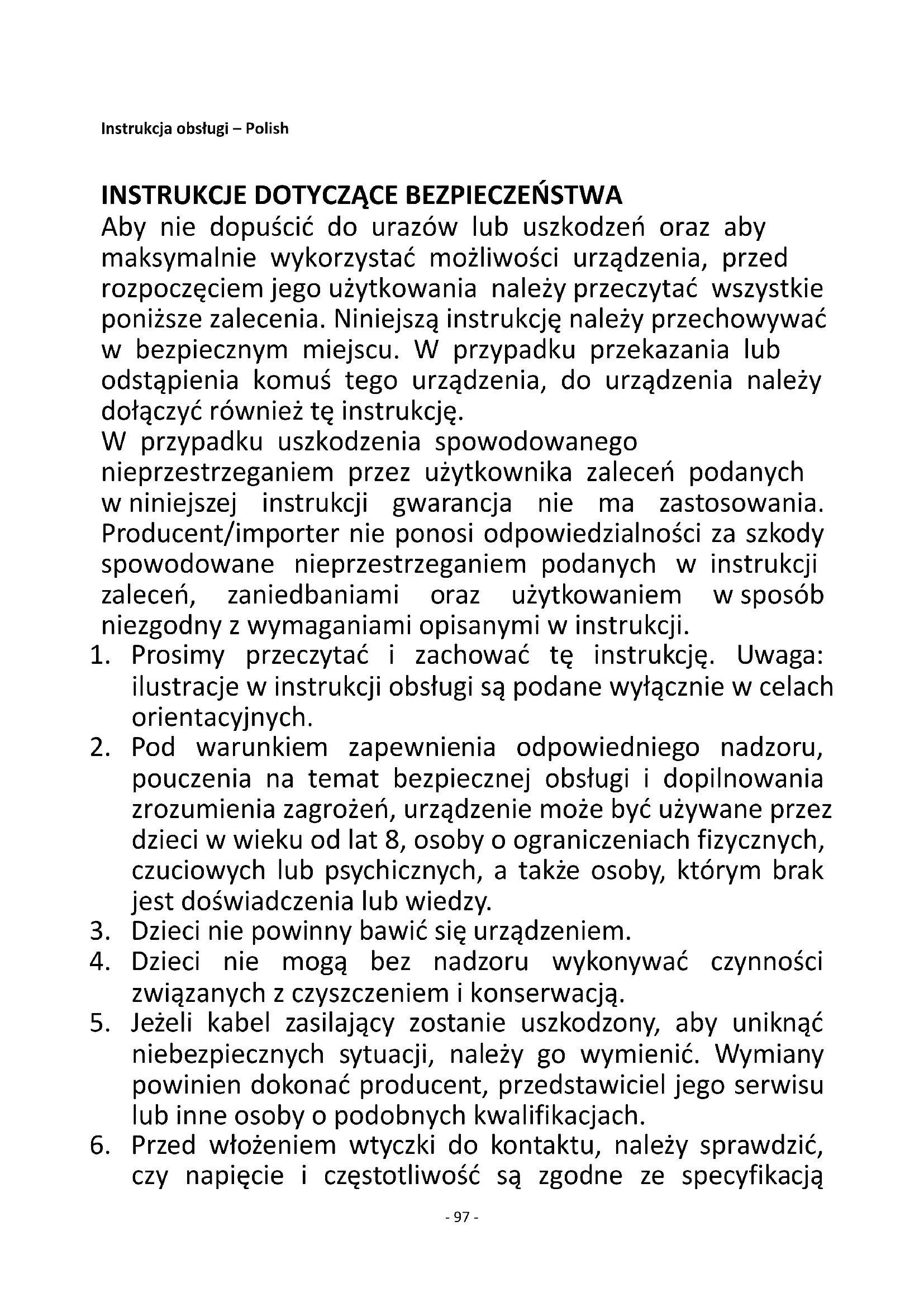 Aby nie dopuścić do urazów lub uszkodzeń oraz aby maksymalnie wykorzystać możliwości urządzenia, przed rozpoczęciem jego użytkowania należy przeczytać wszystkie poniższe zalecenia. Niniejszą instrukcję należy przechowywać w bezpiecznym miejscu. W przypadku przekazania lub odstąpienia komuś tego urządzenia, do urządzenia należy dołączyć również tę instrukcję. W przypadku uszkodzenia spowodowanego nieprzestrzeganiem przez użytkownika zaleceń podanych w niniejszej instrukcji gwarancja nie ma zastosowania. Producent/importer nie ponosi odpowiedzialności za szkody spowodowane nieprzestrzeganiem podanych w instrukcji zaleceń, zaniedbaniami oraz użytkowaniem w sposób niezgodny z wymaganiami opisanymi w instrukcji.