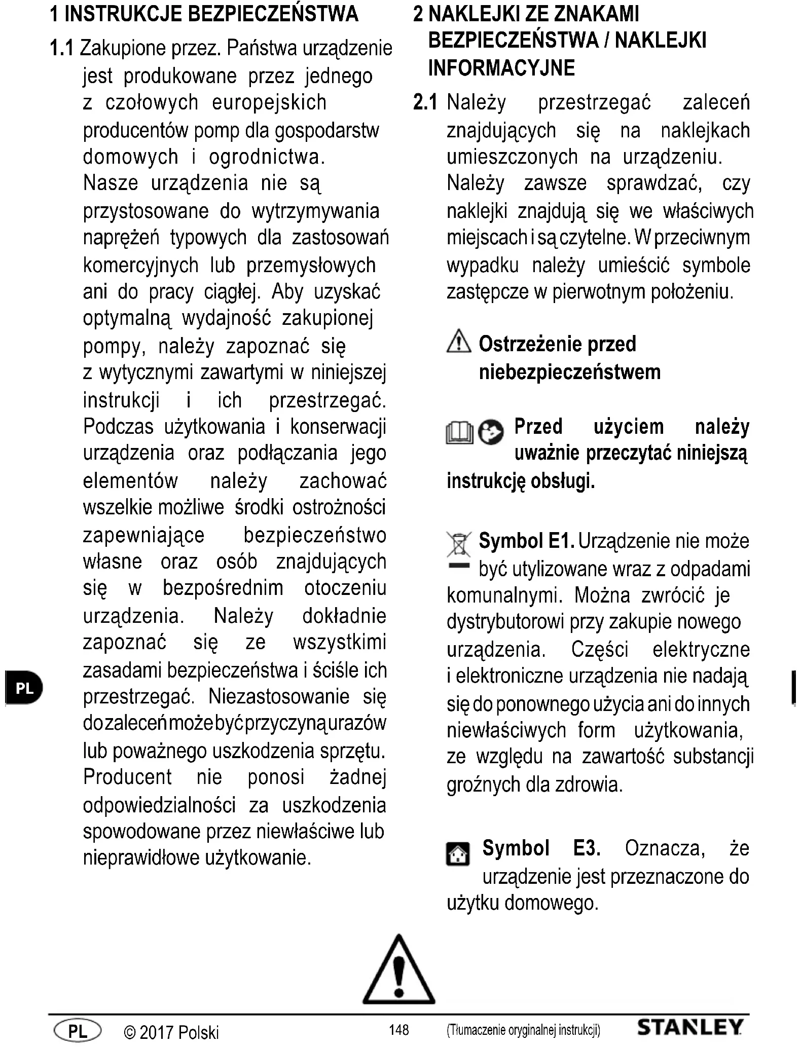Należy przestrzegać zaleceń znajdujących się na naklejkach umieszczonych na urządzeniu. Należy zawsze sprawdzać, czy naklejki znajdują się we właściwych miejscach i są czytelne. W przeciwnym wypadku należy umieścić symbole zastępcze w pierwotnym położeniu. Ostrzeżenie przed niebezpieczeństwem Przed użyciem należy uważnie przeczytać niniejszą instrukcję obsługi. Symbol E1. Urządzenie nie może być utylizowane wraz z odpadami komunalnymi. Można zwrócić je dystrybutorowi przy zakupie nowego urządzenia. Części elektryczne i elektroniczne urządzenia nie nadają się do ponownego użycia ani do innych niewłaściwych form użytkowania, ze względu na zawartość substancji groźnych dla zdrowia. Symbol E3. Oznacza, że urządzenie jest przeznaczone do użytku domowego.149 (Tłumaczenie oryginalnej instrukcji) © 2017 Polski (Tłumaczenie oryginalnej instrukcji) © 2017 Polski
