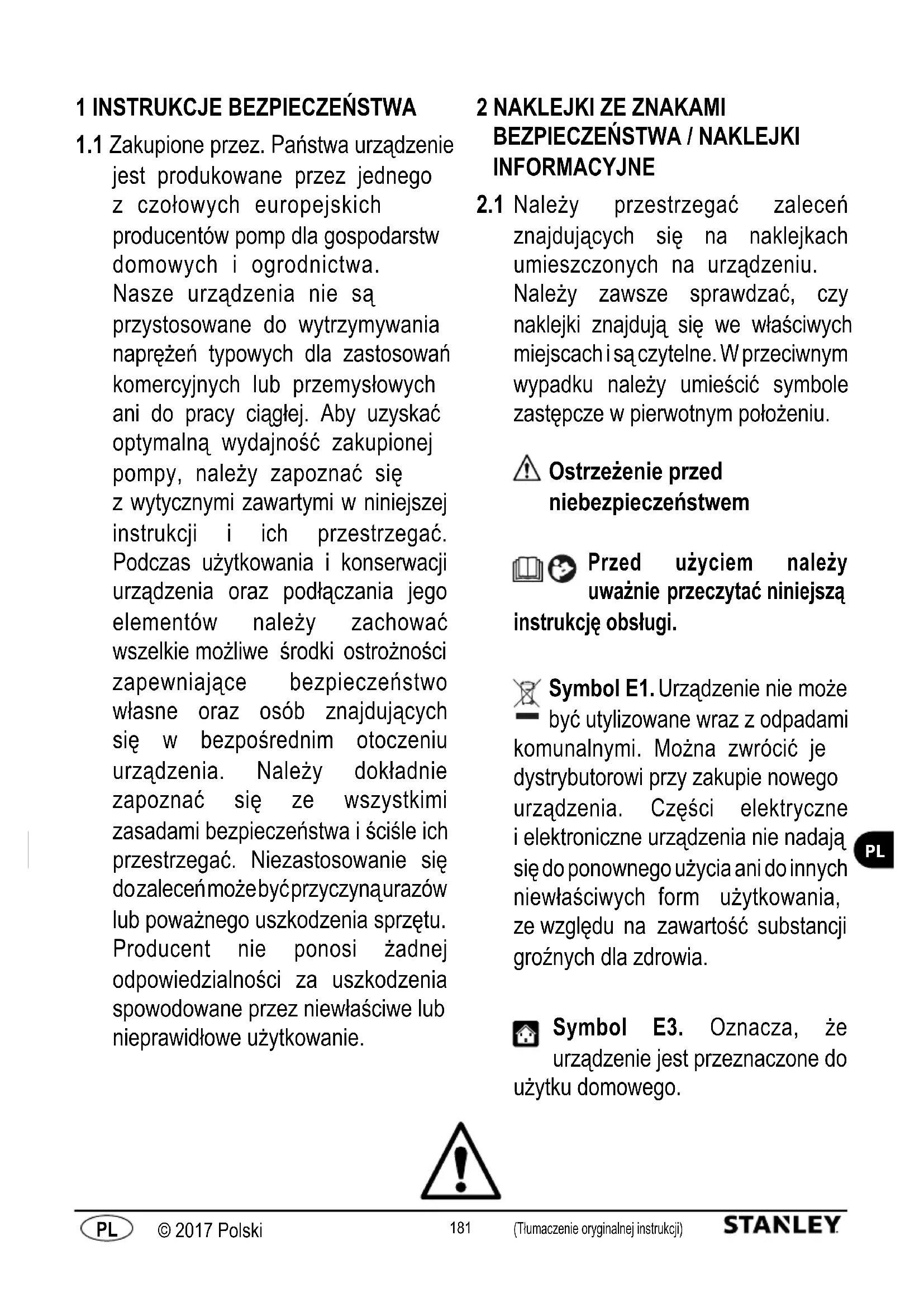 Należy przestrzegać zaleceń znajdujących się na naklejkach umieszczonych na urządzeniu. Należy zawsze sprawdzać, czy naklejki znajdują się we właściwych miejscach i są czytelne. W przeciwnym wypadku należy umieścić symbole zastępcze w pierwotnym położeniu. Ostrzeżenie przed niebezpieczeństwem Przed użyciem należy uważnie przeczytać niniejszą instrukcję obsługi. Symbol E1. Urządzenie nie może być utylizowane wraz z odpadami komunalnymi. Można zwrócić je dystrybutorowi przy zakupie nowego urządzenia. Części elektryczne i elektroniczne urządzenia nie nadają się do ponownego użycia ani do innych niewłaściwych form użytkowania, ze względu na zawartość substancji groźnych dla zdrowia. Symbol E3. Oznacza, że urządzenie jest przeznaczone do użytku domowego.182 (Tłumaczenie oryginalnej instrukcji) © 2017 Polski (Tłumaczenie oryginalnej instrukcji) © 2017 Polski
