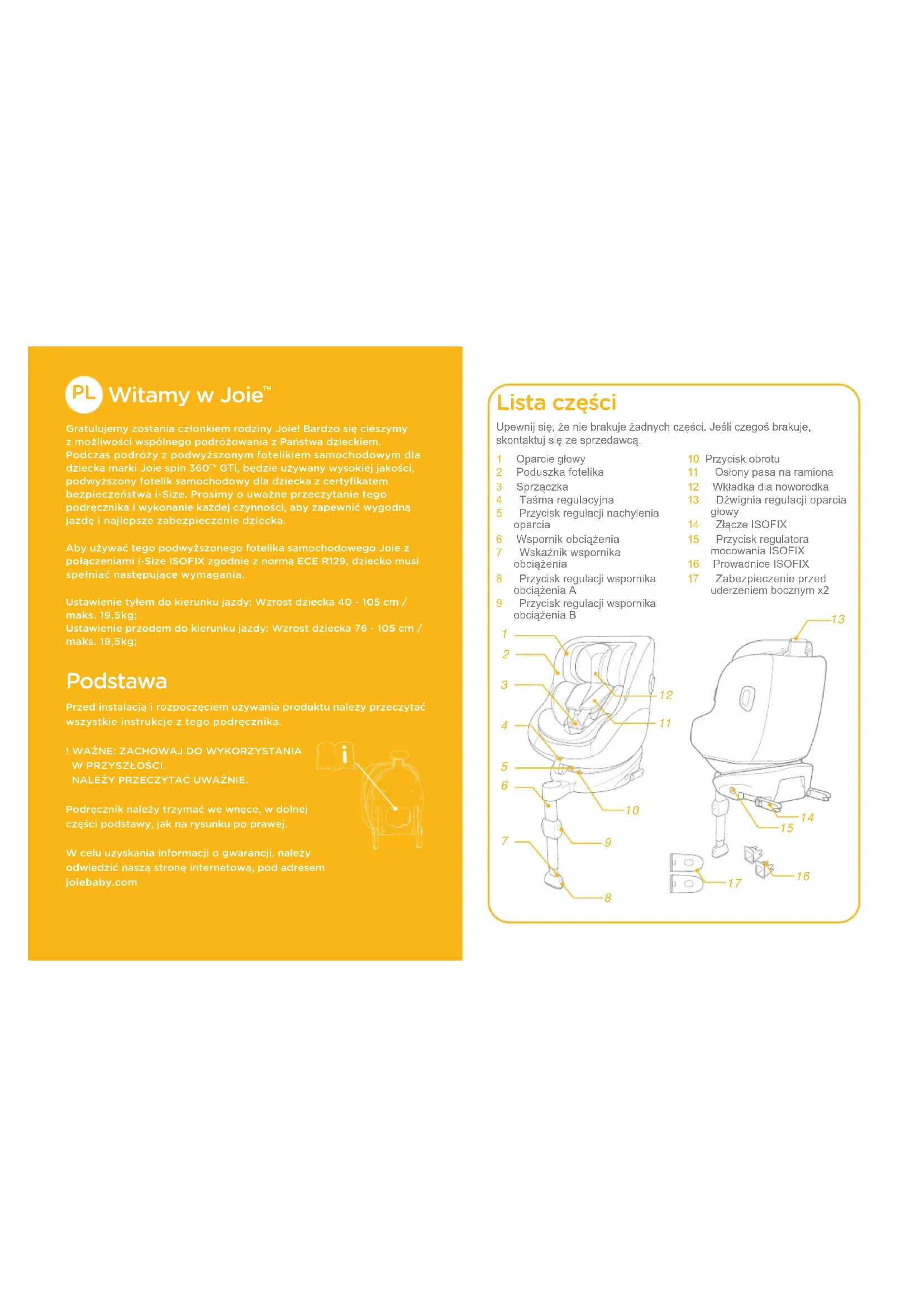 Gratulujemy zostania członkiem rodziny Joie! Bardzo się cieszymy z możliwości wspólnego podróżowania z Państwa dzieckiem. Podczas podróży z podwyższonym fotelikiem samochodowym dla dziecka marki Joie spin 360™ GTi, będzie używany wysokiej jakości, podwyższony fotelik samochodowy dla dziecka z certyfikatem bezpieczeństwa i-Size. Prosimy o uważne przeczytanie tego podręcznika i wykonanie każdej czynności, aby zapewnić wygodną jazdę i najlepsze zabezpieczenie dziecka.Aby używać tego podwyższonego fotelika samochodowego Joie z połączeniami i-Size ISOFIX zgodnie z normą ECE R129, dziecko musi spełniać następujące wymagania.Ustawienie tyłem do kierunku jazdy: Wzrost dziecka 40 - 105 cm /maks. 19,5kg;Ustawienie przodem do kierunku jazdy: Wzrost dziecka 76 - 105 cm /maks. 19,5kg; Podstawa Przed instalacją i rozpoczęciem używania produktu należy przeczytać wszystkie instrukcje z tego podręcznika.! WAŻNE: ZACHOWAJ DO WYKORZYSTANIA W PRZYSZŁOŚCI.NALEŻY PRZECZYTAĆ UWAŻNIE.Podręcznik należy trzymać we wnęce, w dolnej części podstawy, jak na rysunku po prawej.W celu uzyskania informacji o gwarancji, należy odwiedzić naszą stronę internetową, pod adresem joiebaby.com Lista części 1 Oparciegłowy2 Poduszkafotelika3 Sprzączka4 Taśmaregulacyjna5 Przyciskregulacjinachyleniaoparcia6 Wspornikobciążenia7 Wskaźnikwspornikaobciążenia8 PrzyciskregulacjiwspornikaobciążeniaA9 PrzyciskregulacjiwspornikaobciążeniaB10 Przyciskobrotu11 Osłonypasanaramiona12 Wkładkadlanoworodka13 Dźwigniaregulacjioparciagłowy14 ZłączeISOFIX15 PrzyciskregulatoramocowaniaISOFIX16 ProwadniceISOFIX17 Zabezpieczenieprzeduderzeniembocznymx2Upewnijsię,żeniebrakujeżadnychczęści.Jeśliczegośbrakuje,skontaktujsięzesprzedawcą.
