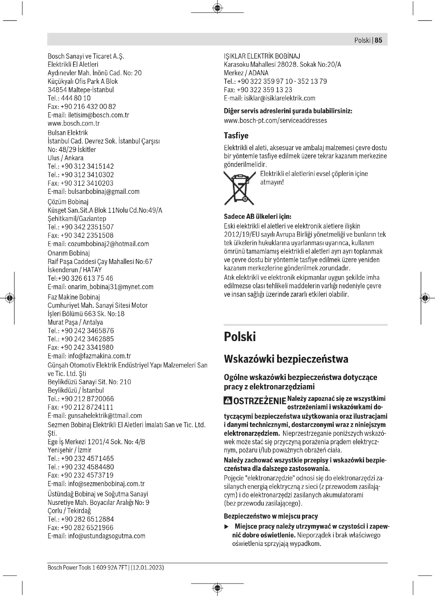 Karasoku Mahallesi 28028. Sokak No:20/A Merkez / ADANA Tel.: +903223599710 -3521379 Fax: +903223591323 E-mail: isiklar@isiklarelektrik.com Diğer servis adreslerini şurada bulabilirsiniz: www.bosch-pt.com/serviceaddresses Tasfiye Elektrikli el aleti, aksesuar ve ambalaj malzemesi çevre dostu bir yöntemle tasfiye edilmek üzere tekrar kazanım merkezine gönderilmelidir. Elektrikli el aletlerini evsel çöplerin içine atmayın! Sadece AB ülkeleri için: Eski elektrikli el aletleri ve elektronik aletlere ilişkin 2012/19/EU sayılı Avrupa Birliği yönetmeliği ve bunların tek tek ülkelerin hukuklarına uyarlanması uyarınca, kullanım ömrünü tamamlamış elektrikli el aletleri ayrı ayrı toplanmak ve çevre dostu bir yöntemle tasfiye edilmek üzere yeniden kazanım merkezlerine gönderilmek zorundadır. Atık elektrikli ve elektronik ekipmanlar uygun şekilde imha edilmezse olası tehlikeli maddelerin varlığı nedeniyle çevre ve insan sağlığı üzerinde zararlı etkileri olabilir. Polski Wskazówki bezpieczeństwa Ogólne wskazówki bezpieczeństwa dotyczące pracy z elektronarzędziami OSTRZEŻENIE Należy zapoznać się ze wszystkimi ostrzeżeniami i wskazówkami do- tyczącymi bezpieczeństwa użytkowania oraz ilustracjami i danymi technicznymi, dostarczonymi wraz z niniejszym elektronarzędziem. Nieprzestrzeganie poniższych wskazó- wek może stać się przyczyną porażenia prądem elektrycz- nym, pożaru i/lub poważnych obrażeń ciała. Należy zachować wszystkie przepisy i wskazówki bezpie- czeństwa dla dalszego zastosowania. Pojęcie "elektronarzędzie" odnosi się do elektronarzędzi za- silanych energią elektryczną z sieci (z przewodem zasilają- cym) i do elektronarzędzi zasilanych akumulatorami (bezprzewodu zasilającego). Bezpieczeństwo w miejscu pracy u Miejsce pracy należy utrzymywać w czystości i zapew- nić dobre oświetlenie. Nieporządek i brak właściwego oświetlenia sprzyjają wypadkom. Bosch Power Tools 1 609 92A 7FT | (12.01.2023)86 | Polski u Elektronarzędzi nie należy używać w środowiskach za- grożonym wybuchem, np. w pobliżu łatwopalnych cie- czy, gazów lub pyłów. Podczas pracy elektronarzędziem wytwarzają się iskry, które mogą spowodować zapłon py- łów lub oparów. u Podczas użytkowania urządzenia należy zwrócić uwa- gę na to, aby dzieci i inne osoby postronne znajdowały się w bezpiecznej odległości. Czynniki rozpraszające mogą spowodować utratę panowania nad elektronarzę- dziem. Bezpieczeństwo elektryczne u Wtyczki elektronarzędzi muszą pasować do gniazd. Nie wolno w żadnej sytuacji i w żaden sposób modyfi- kować wtyczek. Podczas pracy elektronarzędziami z uziemieniem ochronnym nie wolno stosować żadnych wtyków adaptacyjnych. Oryginalne wtyczki i pasujące do nich gniazda sieciowe zmniejszają ryzyko porażenia prądem. u Należy unikać kontaktu z uziemionymi elementami lub zwartymi z masą, takimi jak rury, grzejniki, kuchenki ilodówki. Uziemienie ciała zwiększa ryzyko porażenia prądem elektrycznym. u Elektronarzędzi nie wolno narażać na kontakt z desz- czem ani wilgocią. Przedostanie się wody do wnętrza obudowy zwiększa ryzyko porażenia prądem elektrycz- nym. u Nie używać przewodu zasilającego do innych celów. Nie wolno używać przewodu do przenoszenia ani prze- suwania elektronarzędzia; nie wolno też wyjmować wtyczki z gniazda, pociągając za przewód. Przewód należy chronić przed wysokimi temperaturami, należy go trzymać zdala od oleju, ostrych krawędzi i rucho- mych części urządzenia. Uszkodzone lub splątane prze- wody zwiększają ryzyko porażenia prądem elektrycznym. u Używając elektronarzędzia na świeżym powietrzu, na- leży upewnić się, że przedłużacz jest przeznaczony do pracy na zewnątrz. Użycie przedłużacza przeznaczone- go do pracy na zewnątrz zmniejsza ryzyko porażenia prą- dem elektrycznym. u Jeżeli nie ma innej możliwości, niż użycie elektrona- rzędzia w wilgotnym otoczeniu, należy podłączyć je do źródła zasilania wyposażonego w wyłącznik ochronny różnicowoprądowy. Zastosowanie wyłącznika ochron- nego różnicowoprądowego zmniejsza ryzyko porażenia prądem elektrycznym. Bezpieczeństwo osób u Podczas pracy z elektronarzędziem należy zachować czujność, każdą czynność wykonywać ostrożnie i z rozwagą. Nie przystępować do pracy elektronarzę- dziem w stanie zmęczenia lub będąc pod wpływem narkotyków, alkoholu lub leków. Chwila nieuwagi pod- czas pracy może grozić bardzo poważnymi obrażeniami ciała. u Stosować środki ochrony osobistej. Należy zawsze nosić okulary ochronne. Środki ochrony osobistej, np. maska przeciwpyłowa, antypoślizgowe obuwie, kask ochronny czy ochraniacze na uszy, w określonych warun- kach pracy obniżają ryzyko obrażeń ciała. u Należy unikać niezamierzonego uruchomienia narzę- dzia. Przed podłączeniem elektronarzędzia do źródła zasilania i/lub podłączeniem akumulatora, podniesie- niem albo transportem urządzenia, należy upewnić się, że włącznik elektronarzędzia znajduje się w pozy- cji wyłączonej. Przenoszenie elektronarzędzia z palcem opartym na włączniku/wyłączniku lub włożenie do gniaz- da sieciowego wtyczki włączonego narzędzia, może stać się przyczyną wypadków. u Przed włączeniem elektronarzędzia należy usunąć wszystkie narzędzia nastawcze i klucze maszynowe. Narzędzia lub klucze, pozostawione wruchomych czę- ściach urządzenia, mogą spowodować obrażenia ciała. u Należy unikać nienaturalnych pozycji przy pracy. Na- leży dbać o stabilną pozycję przy pracy i zachowanie równowagi. Dzięki temu można będzie łatwiej zapano- wać nad elektronarzędziem w nieprzewidzianych sytu- acjach. u Należy nosić odpowiednią odzież. Nie należy nosić luźnej odzieży ani biżuterii. Włosy i odzież należy trzy- mać z dala od ruchomych części. Luźna odzież, biżuteria lub długie 