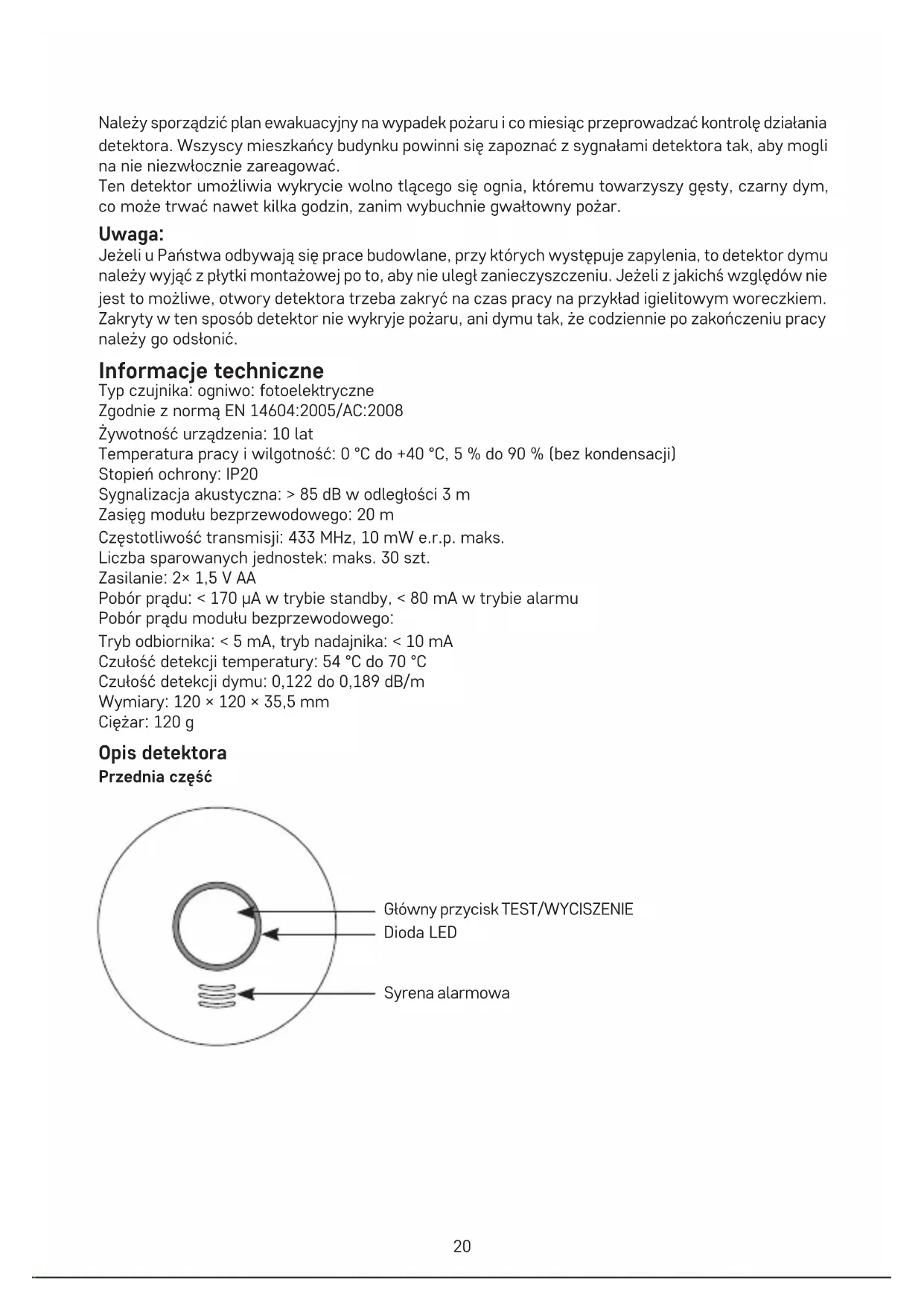 piknięcie, a czerwona dioda LED przestanie świecić– pamięć detektora została skasowana. W ten sposób można kolejno kasować pamięć w dalszych sparowanych detektorach. Testowanie sparowanych detektorów Naciskamy i przytrzymujemy przycisk główny detektora w czasie maks. około 45 sekund.25 Kolejno zaczną pikać wszystkie pozostałe sparowane detektory. W ten sposób sprawdzamy, czy sparowanie detektorów odbyło się poprawnie. Tryb alarmu w pikających detektorach wyłącza się naciśnięciem głównego przycisku. Detektory przechodzą do trybu ręcznego wyciszenia alarmu, który trwa 10 minut. Potem automatycznie przechodzą do normalnego trybu pracy. Czyszczenie i konserwacja Wyrób jest zaprojektowany tak, aby przy właściwym obchodzeniu się z nim mógł służyć przez wiele lat. Dalej zamieszczamy kilka uwag związanych z jego właściwą obsługą: