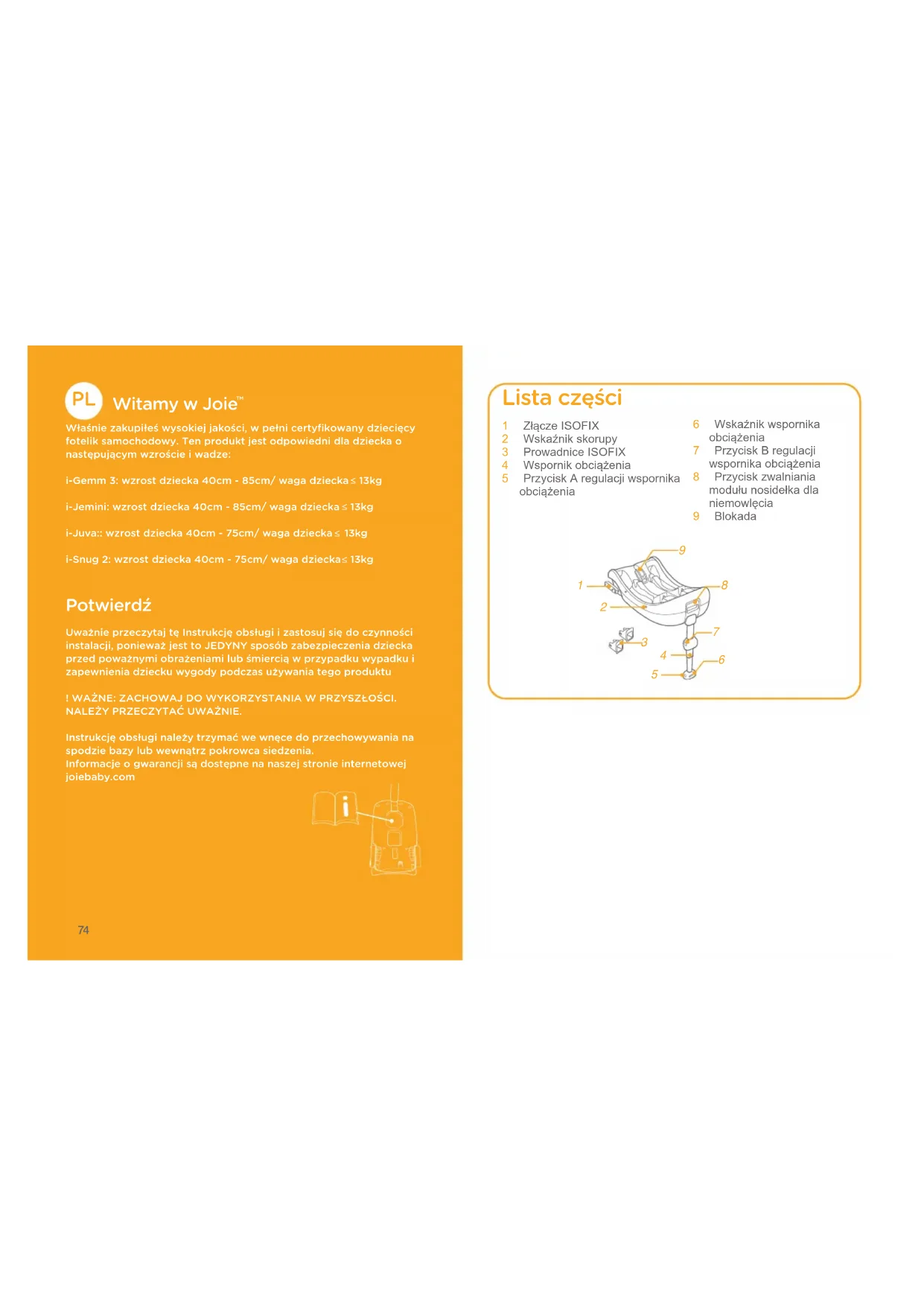 Właśnie zakupiłeś wysokiej jakości, w pełni certyfikowany dziecięcy fotelik samochodowy. Ten produkt jest odpowiedni dla dziecka o następującym wzroście i wadze:i-Gemm 3: wzrost dziecka 40cm - 85cm/ waga dziecka 13kgi-Jemini: wzrost dziecka 40cm - 85cm/ waga dziecka 13kgi-Juva:: wzrost dziecka 40cm - 75cm/ waga dziecka 13kgi-Snug 2: wzrost dziecka 40cm - 75cm/ waga dziecka 13kg Potwierdź Uważnie przeczytaj tę Instrukcję obsługi i zastosuj się do czynności instalacji, ponieważ jest to JEDYNY sposób zabezpieczenia dziecka przed poważnymi obrażeniami lub śmiercią w przypadku wypadku i zapewnienia dziecku wygody podczas używania tego produktu! WAŻNE: ZACHOWAJ DO WYKORZYSTANIA W PRZYSZŁOŚCI. NALEŻY PRZECZYTAĆ UWAŻNIE.Instrukcję obsługi należy trzymać we wnęce do przechowywania na spodzie bazy lub wewnątrz pokrowca siedzenia.Informacje o gwarancji są dostępne na naszej stronie internetowej joiebaby.com 6 Wskaźnikwspornika obciążenia 7 PrzyciskBregulacji wspornikaobciążenia 8 Przyciskzwalniania modułunosidełkadla niemowlęcia 9 Blokada