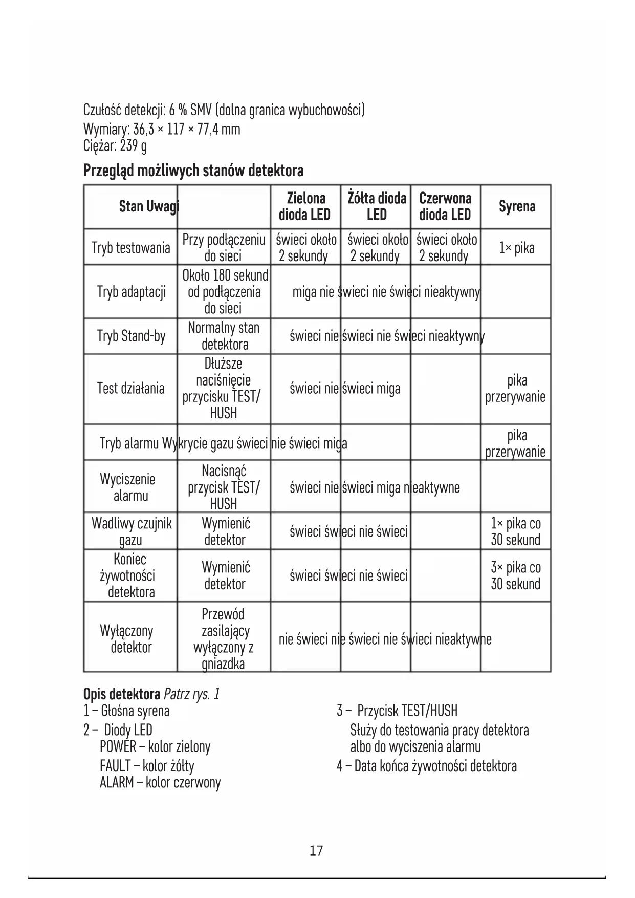 - Tento prístroj nie je určený pre používanie osobami (vrátane detí), ktorým fyzická, zmyslová alebo mentálna neschopnosť či nedostatok skúseností a znalostí zabraňuje v bezpečnom používaní prístroja, pokiaľ na ne nebude dohliadané, alebo pokiaľ neboli inštruované ohľadne použitia tohto prístroja osobou zodpovednou za ich bezpečnosť. Je nutný dohľad nad deťmi, aby sa zaistilo, že sa nebudú s prístrojom hrať. Nevyhadzujte elektrické spotrebiče ako netriedený komunálny odpad, použite zberné miesta triedeného odpadu. Pre aktuálne informácie o zberných miestach kontaktujte miestne úrady. Pokiaľ sú elektrické spotrebiče uložené na skládkach odpadkov, nebez- pečné látky môžu presakovať do podzemnej vody a dostať sa do potravinového reťazca a poško- dzovať vaše zdravie. PL | Detektor gazu Detektor służy do wykrywania wypływu gazów łatwopalnych (gaz ziemny, metan, propan, butan) w gospodarstwach domowych. Ta instrukcja zawiera ważne informacje bezpieczeństwa o instalacji i użytkowaniu detektora. Prosimy uważnie przeczytać tę instrukcję i bezpiecznie zachować ją na przyszłość. Z obsługą detektora należy również zapoznać wszystkich innych mieszkańców budynku, aby potrali prawidłowo reagować na jego sygnały. Dane techniczne: Typ czujnika: półprzewodnikowy Zgodny z normą EN 50194-1:2009 Żywotność urządzenia: 5 lat Wykrywa: gaz ziemny, metan, propan, butan Temperatura pracy i wilgotność: -10 °C do +40 °C, 0 do 95 % (bez kondensacji) Stopień ochrony: IPX2D Sygnalizacja akustyczna: > 85 dB w odległości 1 m Zasilanie: 220–240 V/50–60 Hz Pobór energii: < 4 W17 Czułość detekcji: 6 % SMV (dolna granica wybuchowości) Wymiary: 36,3 × 117 × 77,4 mm Ciężar: 239 g Przegląd możliwych stanów detektora Stan Uwagi Zielona dioda LED Żółta dioda LED Czerwona dioda LED Syrena Tryb testowania Przy podłączeniu do sieci świeci około 2 sekundy świeci około 2 sekundy świeci około 2 sekundy 1× pika Tryb adaptacji Około 180 sekund od podłączenia do sieci miga nie świeci nie świeci nieaktywny Tryb Stand-by Normalny stan detektora świeci nie świeci nie świeci nieaktywny Test działania Dłuższe naciśnięcie przycisku TEST/ HUSH świeci nie świeci miga pika przerywanie Tryb alarmu Wykrycie gazu świeci nie świeci miga pika przerywanie Wyciszenie alarmu Nacisnąć przycisk TEST/ HUSH świeci nie świeci miga nieaktywne Wadliwy czujnik gazu Wymienić detektor świeci świeci nie świeci 1× pika co 30 sekund Koniec żywotności detektora Wymienić detektor świeci świeci nie świeci 3× pika co 30 sekund Wyłączony detektor Przewód zasilający wyłączony z gniazdka nie świeci nie świeci nie świeci nieaktywne Opis detektora Patrz rys. 1 1 – Głośna syrena 2 – Diody LED POWER – kolor zielony FAULT – kolor żółty ALARM – kolor czerwony 3 – Przycisk TEST/HUSH Służy do testowania pracy detektora albo do wyciszenia alarmu 4 – Data końca żywotności detektora18 Instalacja Instalacja musi być wykonana przez kompetentną osobę. Osoba wykonująca montaż jest odpowiedzialna za instalację produktu zgodnie z obowiązującymi przepisami. W przypadku wątpliwości co do zasad instalacji, trzeba się zwrócić do specjalisty. Detektor powinien być umieszczony w tym pomieszczeniu, w którym jest największe ryzyko wypływu gazu, na przykład w kuchni. Gaz ziemny jest lżejszy od powietrza i ma tendencję unoszenia się do góry i wypełniania miejsca, które znajduje się nad miejscem jego wypływu. Detektor powinien być zainstalowany ponad poziomem prawdopodobnego miejsca wypływu gazu, około 30 cm od stropu. Nie instalujemy detektora w miejscu, w którym przepływ powietrza jest utrudniony meblami i innym wyposażeniem pomieszczenia. Detektor powinien być zainstalowany w dobrze dostępnym miejscu, aby w przypadku alarmu użytkownik mógł nacisnąć przycisk TEST/HUSH. Detektor powinien być zainstalowany w miejscu, z którego alarm będzie dobrze słyszalny. Detektora nie instaluje się: