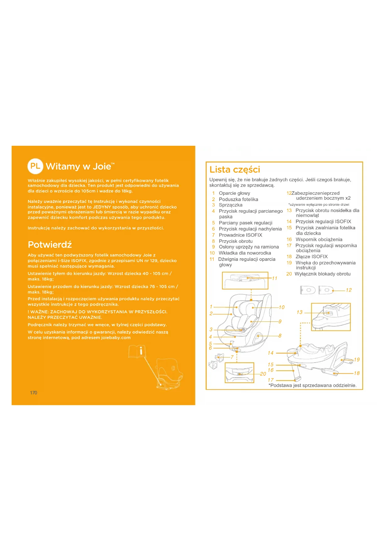 Właśnie zakupiłeś wysokiej jakości﹐ w pełni certyfikowany fotelik samochodowy dla dziecka. Ten produkt jest odpowiedni do używania dla dzieci o wzroście do 105cm i wadze do 18kg.Należy uważnie przeczytać tę Instrukcję i wykonać czynności instalacyjne﹐ ponieważ jest to JEDYNY sposób﹐ aby uchronić dziecko przed poważnymi obrażeniami lub śmiercią w razie wypadku oraz zapewnić dziecku komfort podczas używania tego produktu.Instrukcję należy zachować do wykorzystania w przyszłości. Potwierdź Aby używać ten podwyższony fotelik samochodowy Joie z połączeniami i-Size ISOFIX﹐ zgodnie z przepisami UN nr 129﹐ dziecko musi spełniać następujące wymagania.Ustawienie tyłem do kierunku jazdy: Wzrost dziecka 40 - 105 cm /maks. 18kg;Ustawienie przodem do kierunku jazdy: Wzrost dziecka 76 - 105 cm /maks. 18kg;Przed instalacją i rozpoczęciem używania produktu należy przeczytać wszystkie instrukcje z tego podręcznika.! WAŻNE: ZACHOWAJ DO WYKORZYSTANIA W PRZYSZŁOŚCI. NALEŻY PRZECZYTAĆ UWAŻNIE.Podręcznik należy trzymać we wnęce﹐ w tylnej części podstawy.W celu uzyskania informacji o gwarancji﹐ należy odwiedzić naszą stronę internetową﹐ pod adresem joiebaby.com Lista części 1 Oparcie głowy 2 Poduszka fotelika 3 Sprzączka 4 Przycisk regulacji parcianego paska 5 Parciany pasek regulacji 6 Przycisk regulacji nachylenia 7 Prowadnice ISOFIX 8 Przycisk obrotu 9 Osłony uprzęży na ramiona10 Wkładka dla noworodka11 Dźwignia regulacji oparcia głowy12 Zabezpieczenie przed uderzeniem bocznym x2 *używanie wyłącznie po stronie drzwi13 Przycisk obrotu nosidełka dla niemowląt14 Przycisk regulacji ISOFIX15 Przycisk zwalniania fotelika dla dziecka16 Wspornik obciążenia17 Przycisk regulacji wspornika obciążenia18 Złącze ISOFIX19 Wnęka do przechowywania instrukcji20 Wyłącznik blokady obrotuUpewnij się, że nie brakuje żadnych części. Jeśli czegoś brakuje, skontaktuj się ze sprzedawcą. *Podstawa jest sprzedawana oddzielnie.