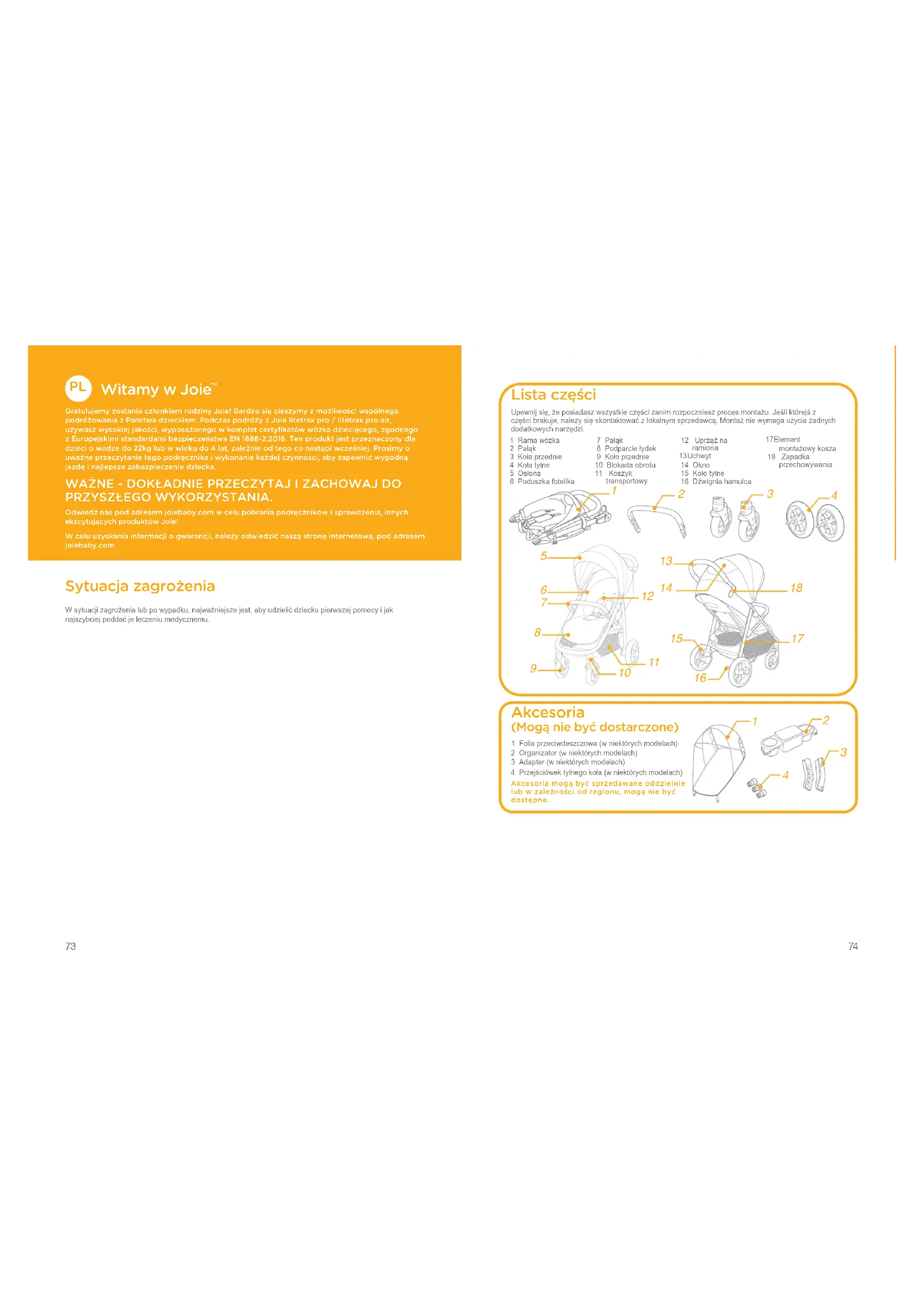 Gratulujemy zostania członkiem rodziny Joie! Bardzo się cieszymy z możliwości wspólnego podróżowania z Państwa dzieckiem. Podczas podróży z Joie litetrax pro / litetrax pro air, używasz wysokiej jakości, wyposażonego w komplet certyfikatów wózka dziecięcego, zgodnego z Europejskimi standardami bezpieczeństwa EN 1888-2:2018. Ten produkt jest przeznaczony dla dzieci o wadze do 22kg lub w wieku do 4 lat, zależnie od tego co nastąpi wcześniej. Prosimy o uważne przeczytanie tego podręcznika i wykonanie każdej czynności, aby zapewnić wygodną jazdę i najlepsze zabezpieczenie dziecka. WAŻNE - DOKŁADNIE PRZECZYTAJ I ZACHOWAJ DO PRZYSZŁEGO WYKORZYSTANIA. Odwiedź nas pod adresem joiebaby.com w celu pobrania podręczników i sprawdzenia, innych ekscytujących produktów Joie!W celu uzyskania informacji o gwarancji, należy odwiedzić naszą stronę internetową, pod adresem joiebaby.com Sytuacja zagrożenia W sytuacji zagrożenia lub po wypadku, najważniejsze jest, aby udzielić dziecku pierwszej pomocy i jak najszybciej poddać je leczeniu medycznemu. 1 Rama wózka 2 Pałąk 3 Koła przednie 4 Koła tylne 5 Osłona 6 Poduszka fotelika 7 Pałąk 8 Podparcie łydek 9 Koło przednie 10 Blokada obrotu 11 Koszyk transportowy 12 Uprząż na ramiona 13 Uchwyt 14 Okno 15 Koło tylne 16 Dźwignia hamulca 17 Element montażowy kosza 18 Zapadka przechowywania Lista części Upewnij się, że posiadasz wszystkie części zanim rozpoczniesz proces montażu. Jeśli którejś z części brakuje, należy się skontaktować z lokalnym sprzedawcą. Montaż nie wymaga użycia żadnych dodatkowych narzędzi. Akcesoria (Mogą nie być dostarczone) 1 Folia przeciwdeszczowa )w niektórych modelach(2 Organizator )w niektórych modelach(3 Adapter )w niektórych modelach(4 Przejściówek tylnego koła )w niektórych modelach(Akcesoria mogą być sprzedawane oddzielnie lub w zależności od regionu, mogą nie być dostępne.