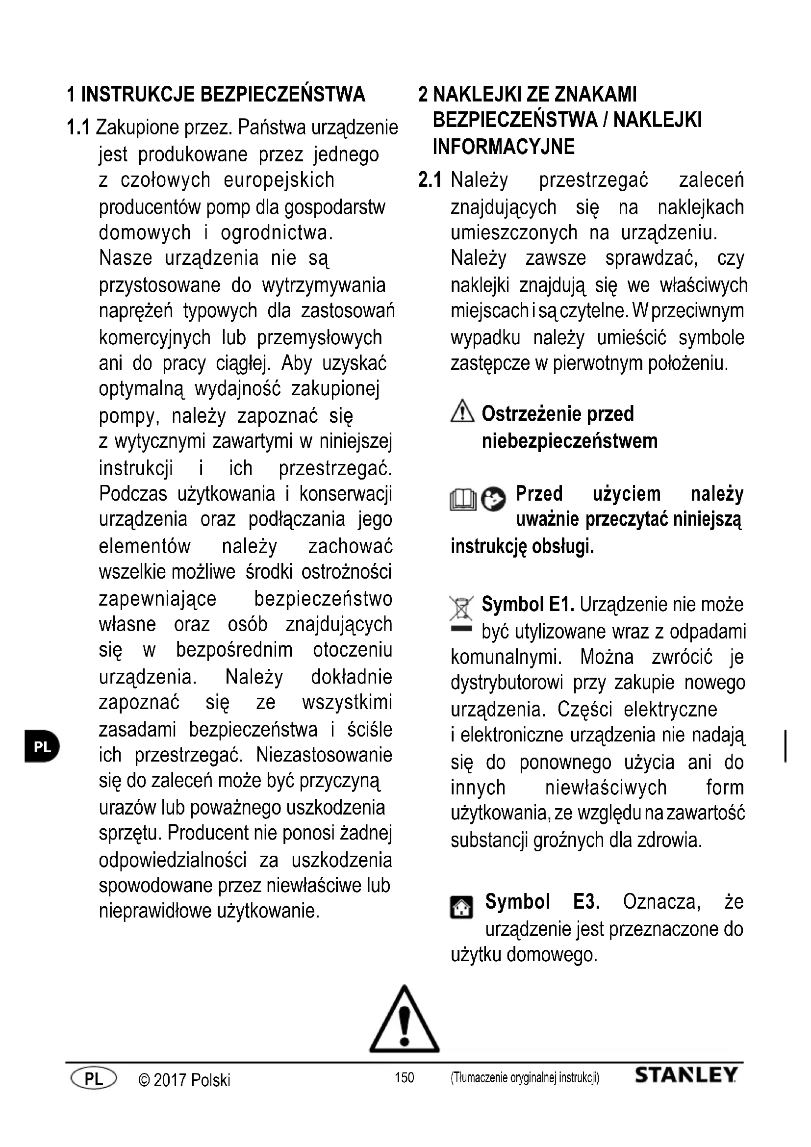 Należy przestrzegać zaleceń znajdujących się na naklejkach umieszczonych na urządzeniu. Należy zawsze sprawdzać, czy naklejki znajdują się we właściwych miejscach i są czytelne. W przeciwnym wypadku należy umieścić symbole zastępcze w pierwotnym położeniu. Ostrzeżenie przed niebezpieczeństwem Przed użyciem należy uważnie przeczytać niniejszą instrukcję obsługi. Symbol E1. Urządzenie nie może być utylizowane wraz z odpadami komunalnymi. Można zwrócić je dystrybutorowi przy zakupie nowego urządzenia. Części elektryczne i elektroniczne urządzenia nie nadają się do ponownego użycia ani do innych niewłaściwych form użytkowania, ze względu na zawartość substancji groźnych dla zdrowia. Symbol E3. Oznacza, że urządzenie jest przeznaczone do użytku domowego.151 (Tłumaczenie oryginalnej instrukcji) © 2017 Polski (Tłumaczenie oryginalnej instrukcji) © 2017 Polski