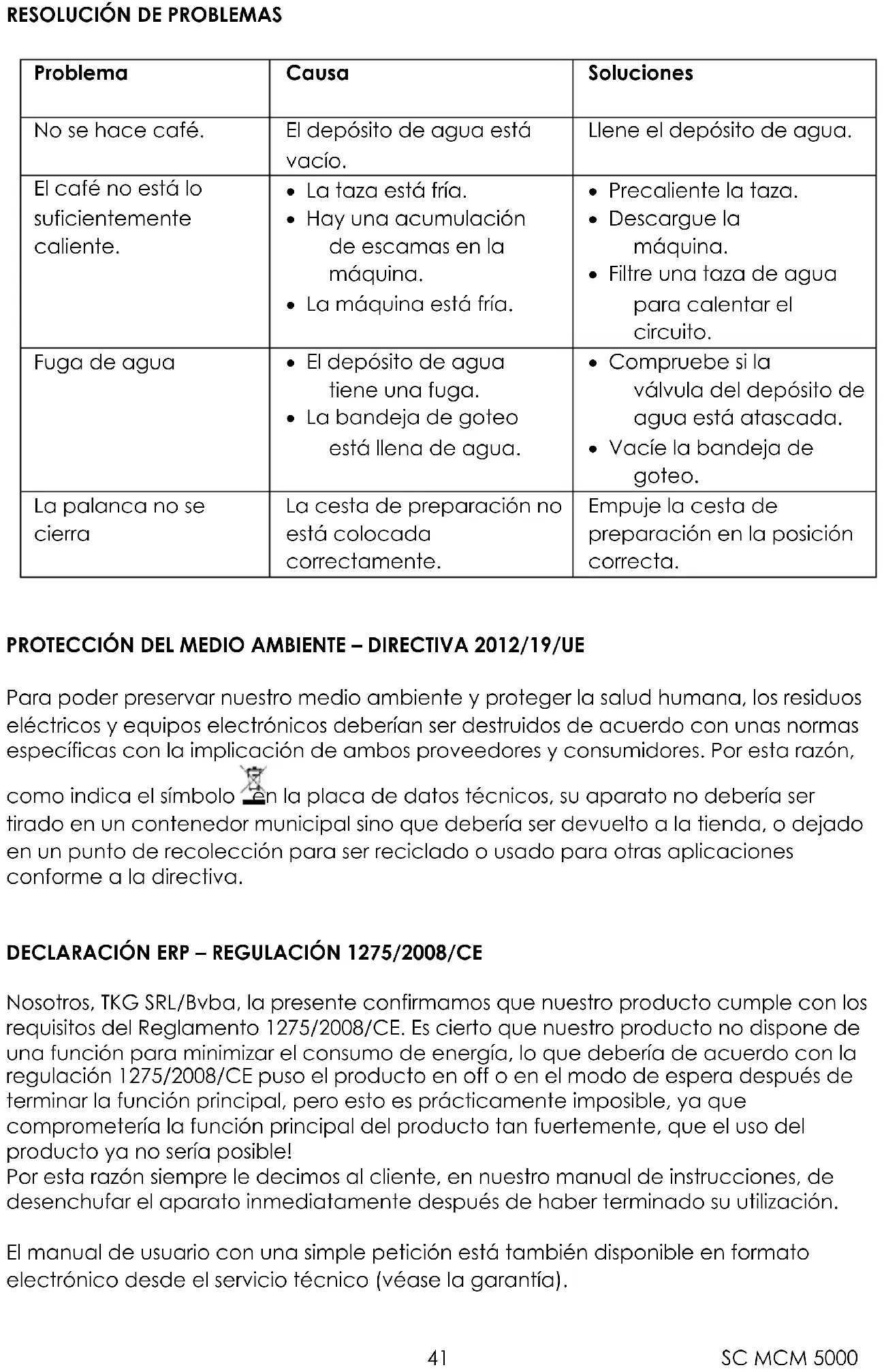 (*) Kompetentny elektryk: dział obsługi posprzedażnej producenta lub importera lub każda osoba, która jest wykwalifikowana, upoważniona i kompetentna do wykonywania tego typu napraw w celu uniknięcia wszelkiego niebezpieczeństwa. W razie potrzeby należy oddać urządzenie temu elektrykowi w celu przeglądu lub naprawy.SC MCM 5000