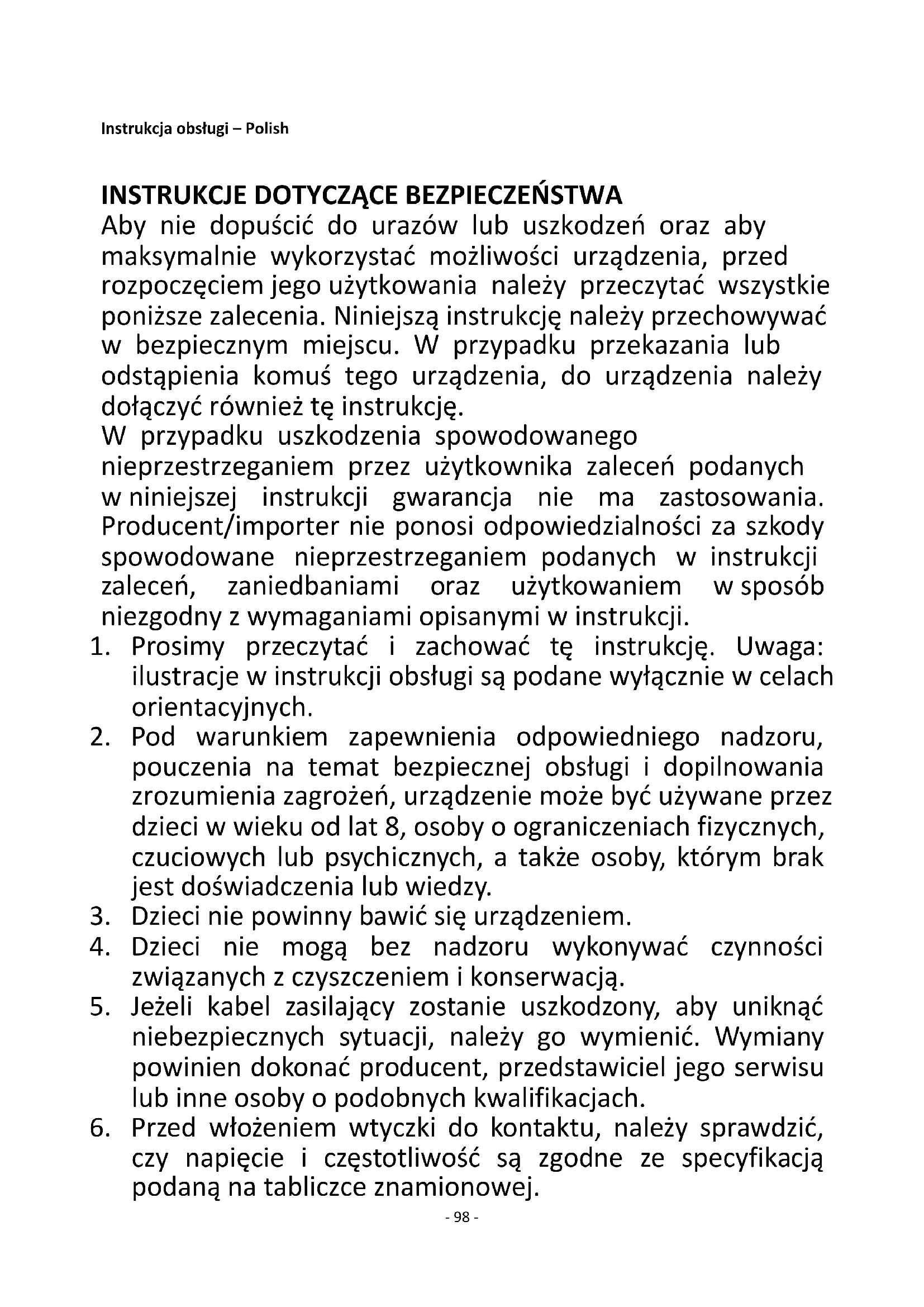 Aby nie dopuścić do urazów lub uszkodzeń oraz aby maksymalnie wykorzystać możliwości urządzenia, przed rozpoczęciem jego użytkowania należy przeczytać wszystkie poniższe zalecenia. Niniejszą instrukcję należy przechowywać w bezpiecznym miejscu. W przypadku przekazania lub odstąpienia komuś tego urządzenia, do urządzenia należy dołączyć również tę instrukcję. W przypadku uszkodzenia spowodowanego nieprzestrzeganiem przez użytkownika zaleceń podanych w niniejszej instrukcji gwarancja nie ma zastosowania. Producent/importer nie ponosi odpowiedzialności za szkody spowodowane nieprzestrzeganiem podanych w instrukcji zaleceń, zaniedbaniami oraz użytkowaniem w sposób niezgodny z wymaganiami opisanymi w instrukcji.