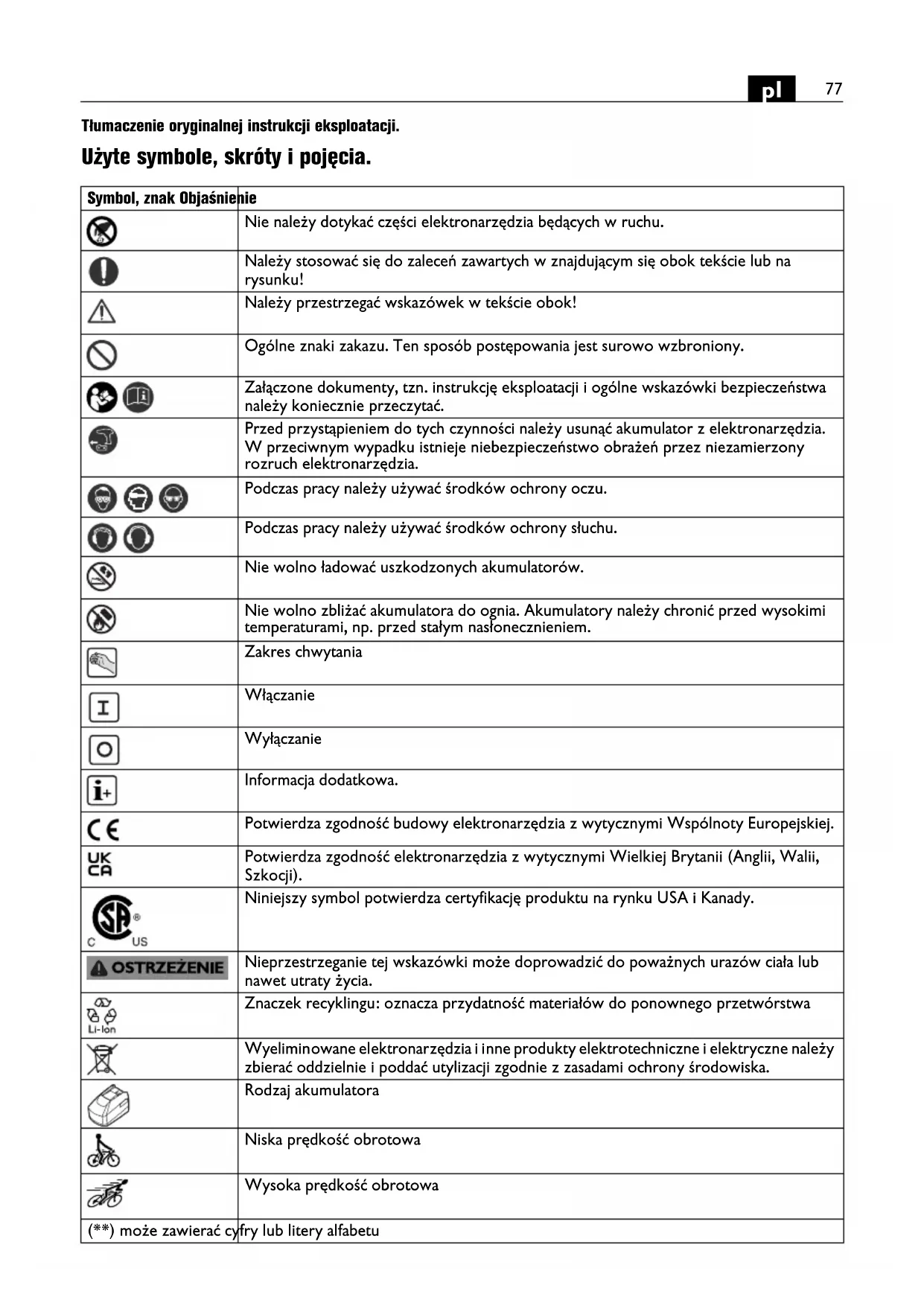 Tłumaczenie oryginalnej instrukcji eksploatacji. Użyte symbole, skróty i pojęcia. Symbol, znak Objaśnienie Nie należy dotykać części elektronarzędzia będących w ruchu. Należy stosować się do zaleceń zawartych w znajdującym się obok tekście lub na rysunku! Należy przestrzegać wskazówek w tekście obok! Ogólne znaki zakazu. Ten sposób postępowania jest surowo wzbroniony. Załączone dokumenty, tzn. instrukcję eksploatacji i ogólne wskazówki bezpieczeństwa należy koniecznie przeczytać. Przed przystąpieniem do tych czynności należy usunąć akumulator z elektronarzędzia. W przeciwnym wypadku istnieje niebezpieczeństwo obrażeń przez niezamierzony rozruch elektronarzędzia. Podczas pracy należy używać środków ochrony oczu. Podczas pracy należy używać środków ochrony słuchu. Nie wolno ładować uszkodzonych akumulatorów. Nie wolno zbliżać akumulatora do ognia. Akumulatory należy chronić przed wysokimi temperaturami, np. przed stałym nasłonecznieniem. Zakres chwytania Włączanie Wyłączanie Informacja dodatkowa. Potwierdza zgodność budowy elektronarzędzia z wytycznymi Wspólnoty Europejskiej. Potwierdza zgodność elektronarzędzia z wytycznymi Wielkiej Brytanii (Anglii, Walii, Szkocji). Niniejszy symbol potwierdza certyfikację produktu na rynku USA i Kanady. Nieprzestrzeganie tej wskazówki może doprowadzić do poważnych urazów ciała lub nawet utraty życia. Znaczek recyklingu: oznacza przydatność materiałów do ponownego przetwórstwa Wyeliminowane elektronarzędzia i inne produkty elektrotechniczne i elektryczne należy zbierać oddzielnie i poddać utylizacji zgodnie z zasadami ochrony środowiska. Rodzaj akumulatora Niska prędkość obrotowa Wysoka prędkość obrotowa (**) może zawierać cyfry lub litery alfabetu78