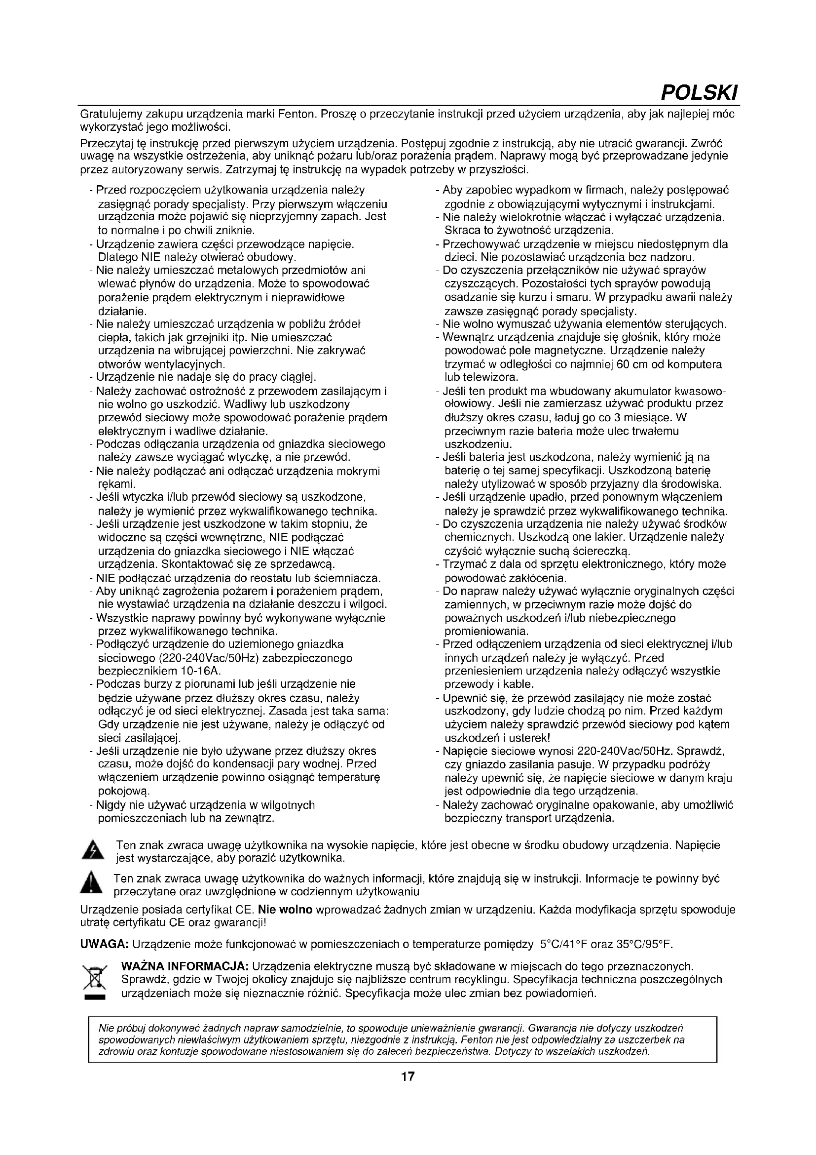 Passez de la répétition unique à la répétition totale.17 POLSKI Gratulujemy zakupu urządzenia marki Fenton. Proszę o przeczytanie instrukcji przed użyciem urządzenia, aby jak najlepiej móc wykorzystać jego możliwości. Przeczytaj tę instrukcję przed pierwszym użyciem urządzenia. Postępuj zgodnie z instrukcją, aby nie utracić gwarancji. Zwróć uwagę na wszystkie ostrzeżenia, aby uniknąć pożaru lub/oraz porażenia prądem. Naprawy mogą być przeprowadzane jedynie przez autoryzowany serwis. Zatrzymaj tę instrukcję na wypadek potrzeby w przyszłości. - Przed rozpoczęciem użytkowania urządzenia należy zasięgnąć porady specjalisty. Przy pierwszym włączeniu urządzenia może pojawić się nieprzyjemny zapach. Jest to normalne i po chwili zniknie. - Urządzenie zawiera części przewodzące napięcie. Dlatego NIE należy otwierać obudowy. - Nie należy umieszczać metalowych przedmiotów ani wlewać płynów do urządzenia. Może to spowodować porażenie prądem elektrycznym i nieprawidłowe działanie. - Nie należy umieszczać urządzenia w pobliżu źródeł ciepła, takich jak grzejniki itp. Nie umieszczać urządzenia na wibrującej powierzchni. Nie zakrywać otworów wentylacyjnych. - Urządzenie nie nadaje się do pracy ciągłej. - Należy zachować ostrożność z przewodem zasilającym i nie wolno go uszkodzić. Wadliwy lub uszkodzony przewód sieciowy może spowodować porażenie prądem elektrycznym i wadliwe działanie. - Podczas odłączania urządzenia od gniazdka sieciowego należy zawsze wyciągać wtyczkę, a nie przewód. - Nie należy podłączać ani odłączać urządzenia mokrymi rękami. - Jeśli wtyczka i/lub przewód sieciowy są uszkodzone, należy je wymienić przez wykwalifikowanego technika. - Jeśli urządzenie jest uszkodzone w takim stopniu, że widoczne są części wewnętrzne, NIE podłączać urządzenia do gniazdka sieciowego i NIE włączać urządzenia. Skontaktować się ze sprzedawcą. - NIE podłączać urządzenia do reostatu lub ściemniacza. - Aby uniknąć zagrożenia pożarem i porażeniem prądem, nie wystawiać urządzenia na działanie deszczu i wilgoci. - Wszystkie naprawy powinny być wykonywane wyłącznie przez wykwalifikowanego technika. - Podłączyć urządzenie do uziemionego gniazdka sieciowego (220-240Vac/50Hz) zabezpieczonego bezpiecznikiem 10-16A. - Podczas burzy z piorunami lub jeśli urządzenie nie będzie używane przez dłuższy okres czasu, należy odłączyć je od sieci elektrycznej. Zasada jest taka sama: Gdy urządzenie nie jest używane, należy je odłączyć od sieci zasilającej. - Jeśli urządzenie nie było używane przez dłuższy okres czasu, może dojść do kondensacji pary wodnej. Przed włączeniem urządzenie powinno osiągnąć temperaturę pokojową. - Nigdy nie używać urządzenia w wilgotnych pomieszczeniach lub na zewnątrz. - Aby zapobiec wypadkom w firmach, należy postępować zgodnie z obowiązującymi wytycznymi i instrukcjami. - Nie należy wielokrotnie włączać i wyłączać urządzenia. Skraca to żywotność urządzenia. - Przechowywać urządzenie w miejscu niedostępnym dla dzieci. Nie pozostawiać urządzenia bez nadzoru. - Do czyszczenia przełączników nie używać sprayów czyszczących. Pozostałości tych sprayów powodują osadzanie się kurzu i smaru. W przypadku awarii należy zawsze zasięgnąć porady specjalisty. - Nie wolno wymuszać używania elementów sterujących. - Wewnątrz urządzenia znajduje się głośnik, który może powodować pole magnetyczne. Urządzenie należy trzymać w odległości co najmniej 60 cm od komputera lub telewizora. - Jeśli ten produkt ma wbudowany akumulator kwasowo- ołowiowy. Jeśli nie zamierzasz używać produktu przez dłuższy okres czasu, ładuj go co 3 miesiące. W przeciwnym razie bateria może ulec trwałemu uszkodzeniu. - Jeśli bateria jest uszkodzona, należy wymienić ją na baterię o tej samej specyfikacji. Uszkodzoną baterię należy utylizować w sposób przyjazny dla środowiska. - Jeśli urządzenie upadło, przed ponownym włączeniem należy je sprawdzić przez wykwalifikowanego technika. - Do czyszczenia urządzenia nie należy używać środków chemicznych. Uszkodzą one lakier. Urządzenie należy czyścić wyłącznie suchą ściereczką. - Trzymać z dala od sprzętu elektronicznego, który może powodować zakłócenia. - Do napraw należy używać wyłącznie oryginalnych części zamiennych, w przeciwnym razie może dojść do poważnych uszkodzeń i/lub niebezpiecznego promieniowania. - Przed odłączeniem urządzenia od sieci elektrycznej i/lub innych urządzeń należy je wyłączyć. Przed przeniesieniem urządzenia należy odłączyć wszystkie przewody i kable. - Upewnić się, że przewód zasilający nie może zostać uszkodzony, gdy ludzie chodzą po nim. Przed każdym użyciem należy sprawdzić przewód sieciowy pod kątem uszkodzeń i usterek! - Napięcie sieciowe wynosi 220-240Vac/50Hz. Sprawdź, czy gniazdo zasilania pasuje. W przypadku podróży należy upewnić się, że napięcie sieciowe w danym kraju jest odpowiednie dla tego urządzenia. - Należy zachować oryginalne opakowanie, aby umożliwić bezpieczny transport urządzenia. Ten znak zwraca uwagę użytkownika na wysokie napięcie, które jest obecne w środku obudowy urządzenia. Napięcie jest wystarczające, aby porazić użytkownika. Ten znak zwraca uwagę użytkownika do ważnych informacji, które znajdują się w instrukcji. Informacje te powinny być przeczytane oraz uwzględnione w codziennym użytkowaniu Urządzenie posiada certyfikat CE. Nie wolno wprowadzać żadnych zmian w urządzeniu. Każda modyfikacja sprzętu spowoduje utratę certyfikatu CE oraz gwarancji! UWAGA: Urządzenie może funkcjonować w pomieszczeniach o temperaturze pomiędzy 5°C/41°F oraz 35°C/95°F. WAŻNA INFORMACJA: Urządzenia elektryczne muszą być składowane w miejscach do tego przeznaczonych. Sprawdź, gdzie 
