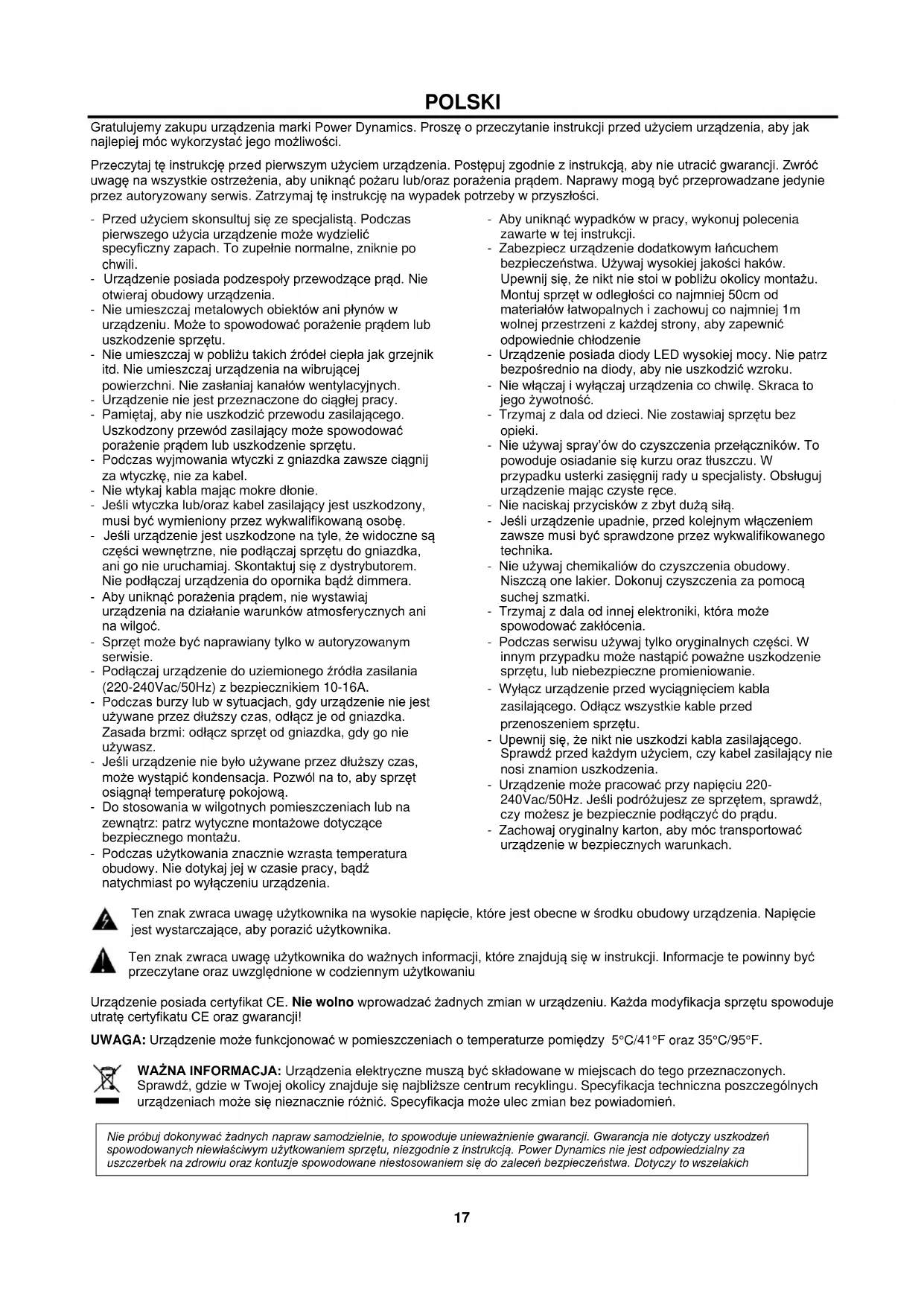 Commutation entre BT et WIFI17 POLSKI Gratulujemy zakupu urządzenia marki Power Dynamics. Proszę o przeczytanie instrukcji przed użyciem urządzenia, aby jak najlepiej móc wykorzystać jego możliwości. Przeczytaj tę instrukcję przed pierwszym użyciem urządzenia. Postępuj zgodnie z instrukcją, aby nie utracić gwarancji. Zwróć uwagę na wszystkie ostrzeżenia, aby uniknąć pożaru lub/oraz porażenia prądem. Naprawy mogą być przeprowadzane jedynie przez autoryzowany serwis. Zatrzymaj tę instrukcję na wypadek potrzeby w przyszłości. - Przed użyciem skonsultuj się ze specjalistą. Podczas pierwszego użycia urządzenie może wydzielić specyficzny zapach. To zupełnie normalne, zniknie po chwili. - Urządzenie posiada podzespoły przewodzące prąd. Nie otwieraj obudowy urządzenia. - Nie umieszczaj metalowych obiektów ani płynów w urządzeniu. Może to spowodować porażenie prądem lub uszkodzenie sprzętu. - Nie umieszczaj w pobliżu takich źródeł ciepła jak grzejnik itd. Nie umieszczaj urządzenia na wibrującej powierzchni. Nie zasłaniaj kanałów wentylacyjnych. - Urządzenie nie jest przeznaczone do ciągłej pracy. - Pamiętaj, aby nie uszkodzić przewodu zasilającego. Uszkodzony przewód zasilający może spowodować porażenie prądem lub uszkodzenie sprzętu. - Podczas wyjmowania wtyczki z gniazdka zawsze ciągnij za wtyczkę, nie za kabel. - Nie wtykaj kabla mając mokre dłonie. - Jeśli wtyczka lub/oraz kabel zasilający jest uszkodzony, musi być wymieniony przez wykwalifikowaną osobę. - Jeśli urządzenie jest uszkodzone na tyle, że widoczne są części wewnętrzne, nie podłączaj sprzętu do gniazdka, ani go nie uruchamiaj. Skontaktuj się z dystrybutorem. Nie podłączaj urządzenia do opornika bądź dimmera. - Aby uniknąć porażenia prądem, nie wystawiaj urządzenia na działanie warunków atmosferycznych ani na wilgoć. - Sprzęt może być naprawiany tylko w autoryzowanym serwisie. - Podłączaj urządzenie do uziemionego źródła zasilania (220-240Vac/50Hz) z bezpiecznikiem 10-16A. - Podczas burzy lub w sytuacjach, gdy urządzenie nie jest używane przez dłuższy czas, odłącz je od gniazdka. Zasada brzmi: odłącz sprzęt od gniazdka, gdy go nie używasz. - Jeśli urządzenie nie było używane przez dłuższy czas, może wystąpić kondensacja. Pozwól na to, aby sprzęt osiągnął temperaturę pokojową. - Do stosowania w wilgotnych pomieszczeniach lub na zewnątrz: patrz wytyczne montażowe dotyczące bezpiecznego montażu. - Podczas użytkowania znacznie wzrasta temperatura obudowy. Nie dotykaj jej w czasie pracy, bądź natychmiast po wyłączeniu urządzenia. - Aby uniknąć wypadków w pracy, wykonuj polecenia zawarte w tej instrukcji. - Zabezpiecz urządzenie dodatkowym łańcuchem bezpieczeństwa. Używaj wysokiej jakości haków. Upewnij się, że nikt nie stoi w pobliżu okolicy montażu. Montuj sprzęt w odległości co najmniej 50cm od materiałów łatwopalnych i zachowuj co najmniej 1m wolnej przestrzeni z każdej strony, aby zapewnić odpowiednie chłodzenie - Urządzenie posiada diody LED wysokiej mocy. Nie patrz bezpośrednio na diody, aby nie uszkodzić wzroku. - Nie włączaj i wyłączaj urządzenia co chwilę. Skraca to jego żywotność. - Trzymaj z dala od dzieci. Nie zostawiaj sprzętu bez opieki. - Nie używaj spray’ów do czyszczenia przełączników. To powoduje osiadanie się kurzu oraz tłuszczu. W przypadku usterki zasięgnij rady u specjalisty. Obsługuj urządzenie mając czyste ręce. - Nie naciskaj przycisków z zbyt dużą siłą. - Jeśli urządzenie upadnie, przed kolejnym włączeniem zawsze musi być sprawdzone przez wykwalifikowanego technika. - Nie używaj chemikaliów do czyszczenia obudowy. Niszczą one lakier. Dokonuj czyszczenia za pomocą suchej szmatki. - Trzymaj z dala od innej elektroniki, która może spowodować zakłócenia. - Podczas serwisu używaj tylko oryginalnych części. W innym przypadku może nastąpić poważne uszkodzenie sprzętu, lub niebezpieczne promieniowanie. - Wyłącz urządzenie przed wyciągnięciem kabla zasilającego. Odłącz wszystkie kable przed przenoszeniem sprzętu. - Upewnij się, że nikt nie uszkodzi kabla zasilającego. Sprawdź przed każdym użyciem, czy kabel zasilający nie nosi znamion uszkodzenia. - Urządzenie może pracować przy napięciu 220- 240Vac/50Hz. Jeśli podróżujesz ze sprzętem, sprawdź, czy możesz je bezpiecznie podłączyć do prądu. - Zachowaj oryginalny karton, aby móc transportować urządzenie w bezpiecznych warunkach. Ten znak zwraca uwagę użytkownika na wysokie napięcie, które jest obecne w środku obudowy urządzenia. Napięcie jest wystarczające, aby porazić użytkownika. Ten znak zwraca uwagę użytkownika do ważnych informacji, które znajdują się w instrukcji. Informacje te powinny być przeczytane oraz uwzględnione w codziennym użytkowaniu Urządzenie posiada certyfikat CE. Nie wolno wprowadzać żadnych zmian w urządzeniu. Każda modyfikacja sprzętu spowoduje utratę certyfikatu CE oraz gwarancji! UWAGA: Urządzenie może funkcjonować w pomieszczeniach o temperaturze pomiędzy 5°C/41°F oraz 35°C/95°F. WAŻNA INFORMACJA: Urządzenia elektryczne muszą być składowane w miejscach do tego przeznaczonych. Sprawdź, gdzie w Twojej okolicy znajduje się najbliższe centrum recyklingu. Specyfikacja techniczna poszczególnych urządzeniach może się nieznacznie różnić. Specyfikacja może ulec zmian bez powiadomień. Nie próbuj dokonywać żadnych napraw samodzielnie, to spowoduje unieważnienie gwarancji. Gwarancja nie dotyczy uszkodzeń spowodowanych niewłaściwym użytkowaniem sprzętu, niezgodnie z instrukcją. Power Dynamics nie jest odpowiedzialny za uszczerbek na zdrowiu oraz kontuzje spowodowane niestosowaniem się do zaleceń bezpieczeństwa. Dotyczy to wszelakich uszkodzeń.18 PRZEGLĄD