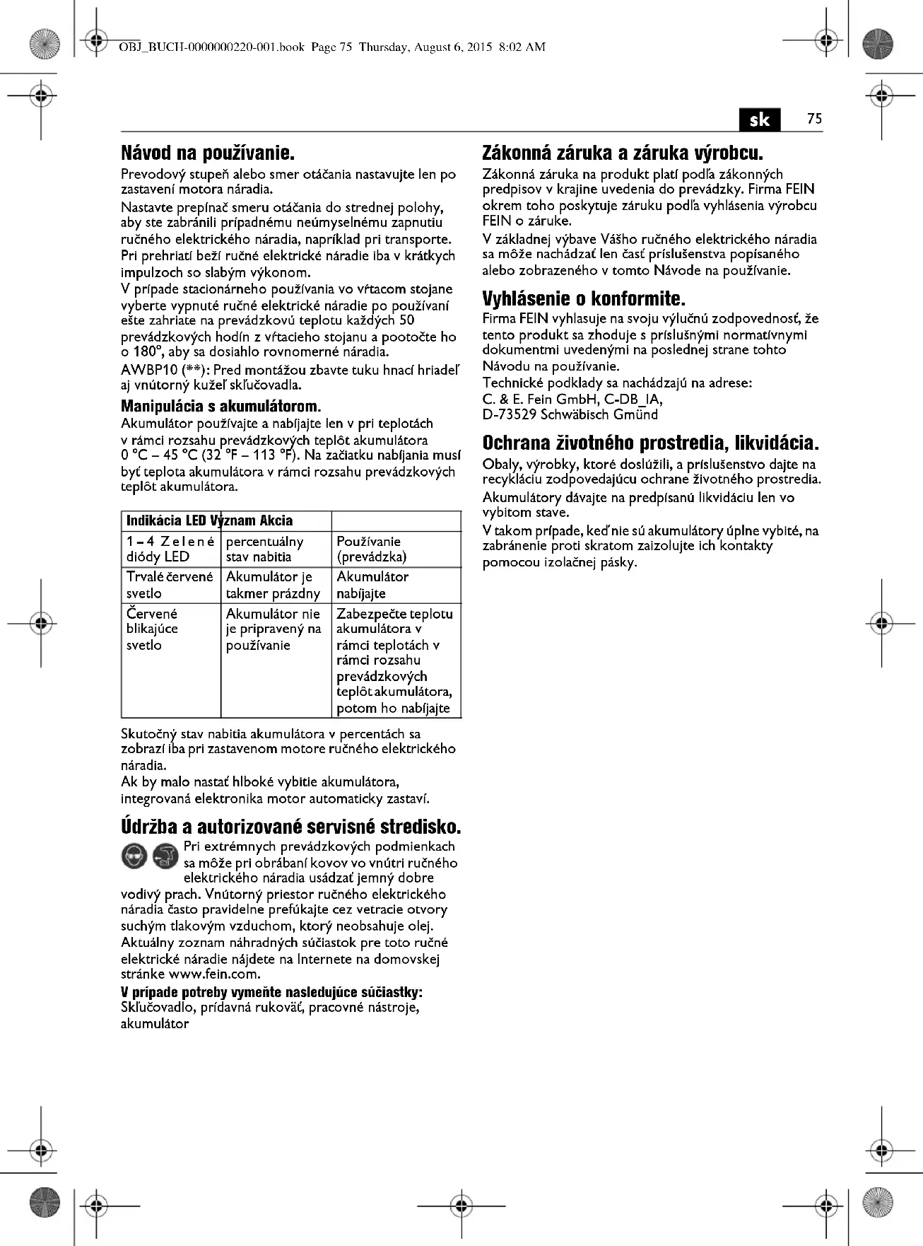 na pojemnik na pył; należy też unikać przegrzania się elektronarzędzia i obrabianego materiału. Należy regularnie opróżniać pojemnik na pył, przestrzegając przy tym wskazówek producenta obrabianego materiału, jak również obowiązujących przepisów danego kraju. Wskazówki dotyczące obsługi. Prędkość obrotową i kierunek obrotów należy ustawiać przy wyłączonym silniku. Ustawić przełącznik kierunku obrotów w położeniu środkowym, aby uniknąć niezamierzonego uruchomienia narzędzia, np. podczas transportu. Przegrzane elektronarzędzie pracuje krótkimi małowydajnymi impulsami Należy doprowadzić do schłodzenia elektronarzędzia, puszczając go na biegu jałowym. W przypadku zastosowania stacjonarnego (przy użyciu stojaka wiertarskiego) należy co 50 roboczogodzin zdjąć rozgrzane do temperatury roboczej elektronarzędzie ze stojaka i obrócić je o 180° w celu równomiernego rozprowadzenia środka smarnego. AWBP10 (**): Przed przystąpieniem do montażu należy odtłuścić wrzeciono i stożek wewnętrzny uchwytu wiertarskiego. Obchodzenie się z akumulatorami. Użytkowanie i ładowanie akumulatora dozwolone jest tylko wówczas, gdy akumulator znajduje się w zakresie temperatur roboczych leżącym między 0 °C –45 °C (32 °F– 113 °F). Temperatura akumulatora na początku ładowania musi znajdować się w zakresie temperatur roboczych akumulatora. Prawdziwy stan naładowania akumulatora ukazany zostanie w procentach tylko przy wyłączonym silniku elektronarzędzia. Przed zbliżającym się głębokim wyładowaniem się akumulatora, układ elektroniczny elektronarzędzia automatycznie wyłącza silnik. Konserwacja i serwisowanie. Obróbka metali w ekstremalnych warunkach może spowodować osadzenie się wewnątrz elektronarzędzia pyłu metalicznego, będącego w stanie przewodzić prąd. Należy często przedmuchiwać wnętrze elektronarzędzia (przez otwory wentylacyjne) za pomocą suchego i bezolejowego powietrza sprężonego. Aktualna lista części zamiennych dla niniejszego elektronarzędzia znajduje się pod adresem internetowym www.fein.com. W razie potrzeby możliwa jest wymiana we własnym zakresie następujących elementów: Uchwyt wiertarski, rękojeść dodatkowa, narzędzia robocze, akumulator Rękojmia i gwarancja. Rękojmia na produkt jest ważna zgodnie z ustawowymi przepisami regulującymi w kraju, w którym produkt został wprowadzony do obrotu. Oprócz tego produkt objęty jest gwarancją firmy FEIN, zgodnie z deklaracją gwarancyjną producenta. W zakres dostawy nabytego elektronarzędzia może wchodzić tylko część ukazanego na rysunkach lub opisanego w instrukcji eksploatacji osprzętu. Oświadczenie o zgodności. Firma FEIN oświadcza z pełną odpowiedzialnością, że niniejszy produkt zgodny jest z odpowiednimi postanowieniami podanymi na ostatniej stronie niniejszej instrukcji eksploatacji. Dokumentacja techniczna: C. & E. Fein GmbH, C-DB_IA, D-73529 Schwäbisch Gmünd Ochrona środowiska, usuwanie odpadów. Opakowanie, zużyte elektronarzędzia i osprzęt należy dostarczyć do utylizacji zgodnie z przepisami z ochrony środowiska. Akumulatory należy oddawać do punktu utylizacji w stanie rozładowanym. Jeżeli akumulator nie rozładował się całkowicie, styki należy zakleić taśmą izolującą, w celu uniknięcia zwarcia. Wskaźnik LED Znaczenie Akcja 1 – 4 zielone diody LED Procentualny stan stopnia naładowania akumulatora Eksploatacja Czerwone światło ciągłe Akumulator jest prawie całkowicie rozładowany Naładować akumulator Czerwone światło migające Akumulator nie jest gotowy do eksploatacji Przed przystąpieniem do ładowania akumulator musi mieścić się w zakresie temperatur roboczych akumulatora OBJ_BUCH-0000000220-001.book Page 79 Thursday, August 6, 2015 8:02 AM80