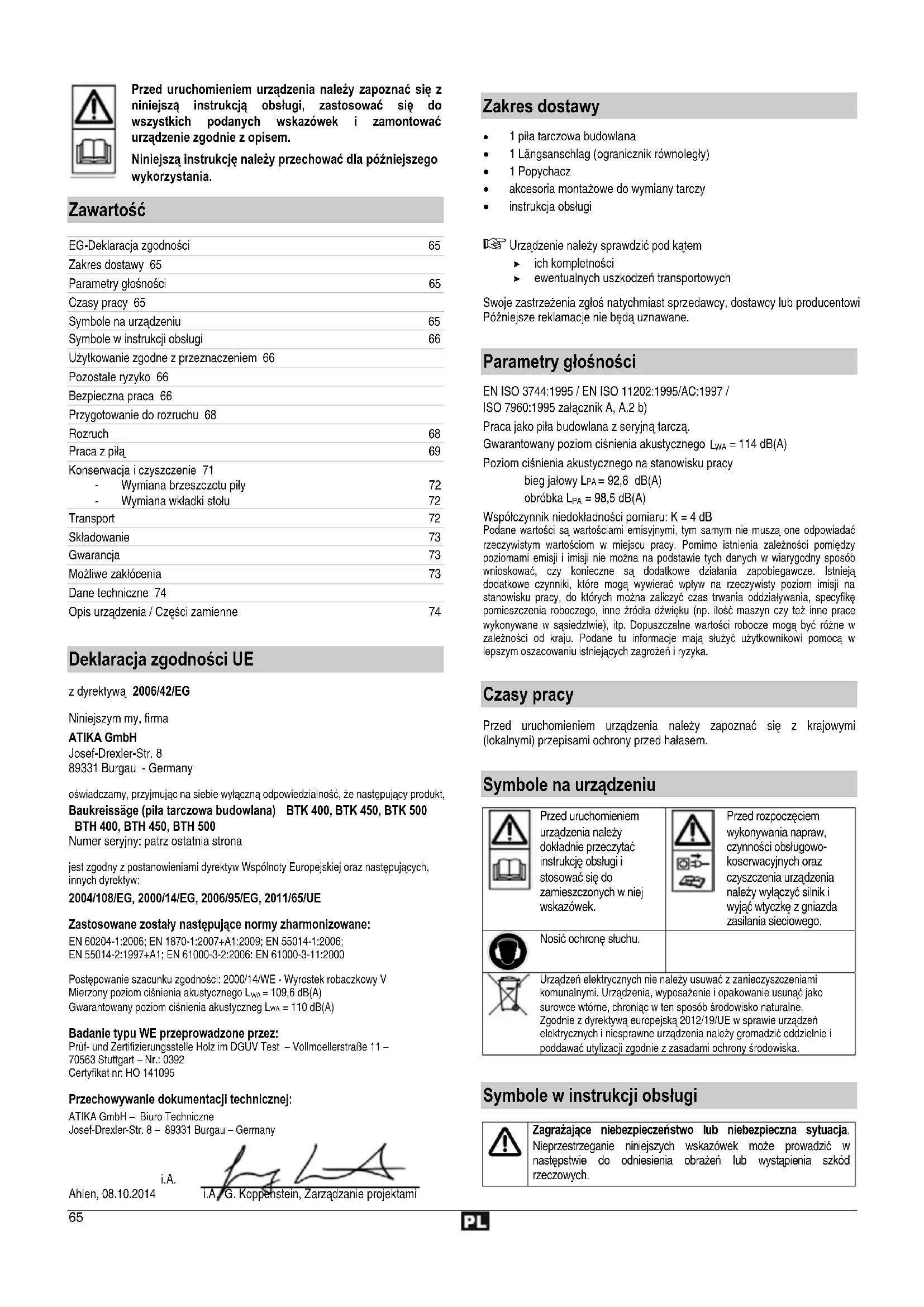 Deklaracja zgodności UE z dyrektywą 2006/42/EG Niniejszym my, firma ATIKA GmbH Josef-Drexler-Str. 8 89331 Burgau - Germany oświadczamy, przyjmując na siebie wyłączną odpowiedzialność, że następujący produkt, Baukreissäge (piła tarczowa budowlana) BTK 400, BTK 450, BTK 500 BTH 400, BTH 450, BTH 500 Numer seryjny: patrz ostatnia strona jest zgodny z postanowieniami dyrektyw Wspólnoty Europejskiej oraz następujących, innych dyrektyw: 2004/108/EG, 2000/14/EG, 2006/95/EG, 2011/65/UE Zastosowane zostały następujące normy zharmonizowane: EN 60204-1:2006; EN 1870-1:2007+A1:2009; EN 55014-1:2006; EN 55014-2:1997+A1; EN 61000-3-2:2006: EN 61000-3-11:2000 Postępowanie szacunku zgodności: 2000/14/WE - Wyrostek robaczkowy V Mierzony poziom ciśnienia akustycznego L = 109,6 dB(A) Gwarantowany poziom ciśnienia akustyczneg L = 110 dB(A) Badanie typu WE przeprowadzone przez: Prüf- und Zertifizierungsstelle Holz im DGUV Test – Vollmoellerstraße 11 – 70563 Stuttgart – Nr.: 0392 Certyfikat nr: HO 141095 Przechowywanie dokumentacji technicznej: ATIKA GmbH – Biuro Techniczne Josef-Drexler-Str. 8 – 89331 Burgau – Germany