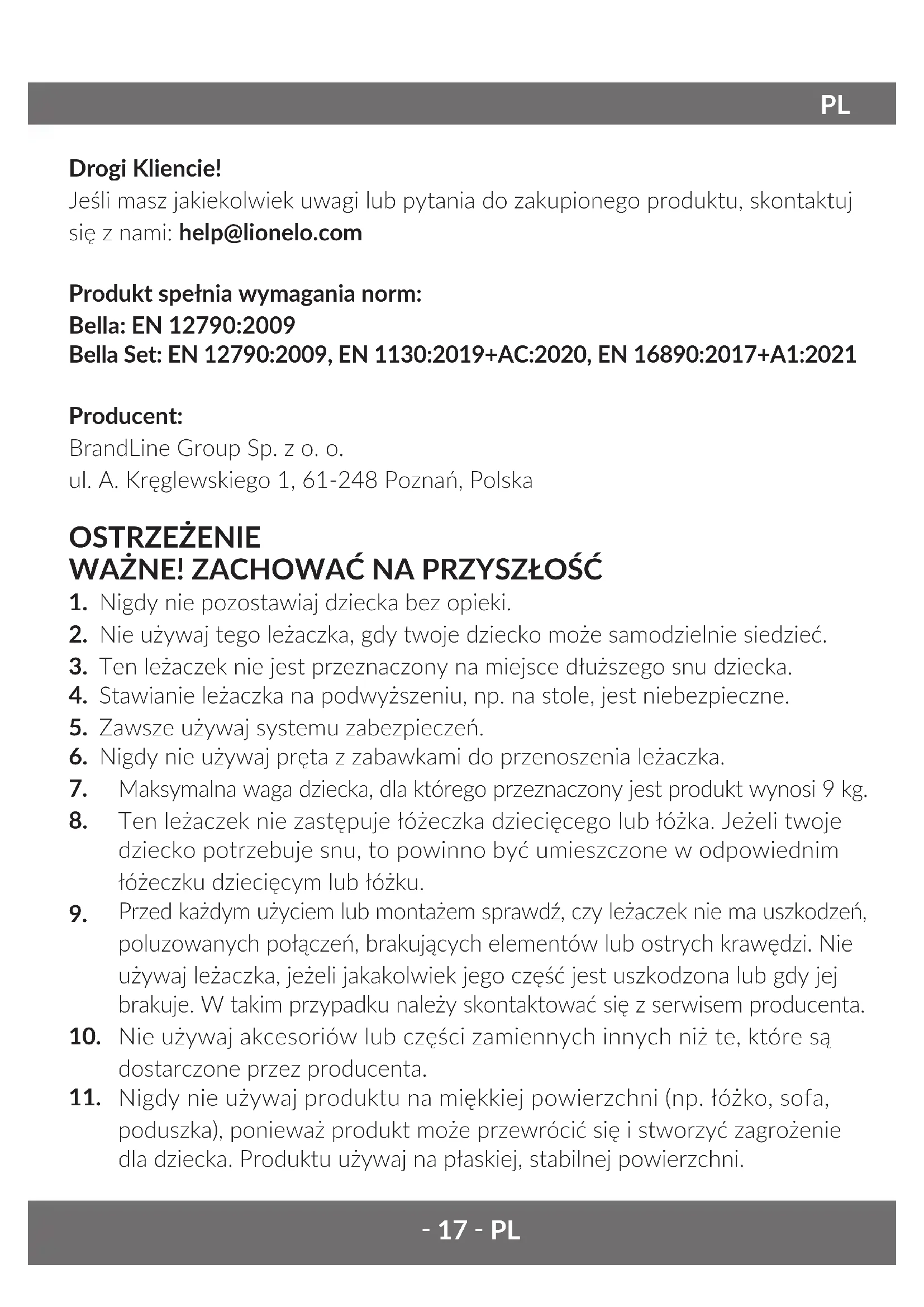 Drogi Kliencie! Jeśli masz jakiekolwiek uwagi lub pytania do zakupionego produktu, skontaktuj się z nami: help@lionelo.com Produkt spełnia wymagania norm: Bella: EN 12790:2009 Bella Set: EN 12790:2009, EN 1130:2019+AC:2020, EN 16890:2017+A1:2021 Producent: BrandLine Group Sp. z o. o. ul. A. Kręglewskiego 1, 61-248 Poznań, Polska OSTRZEŻENIE