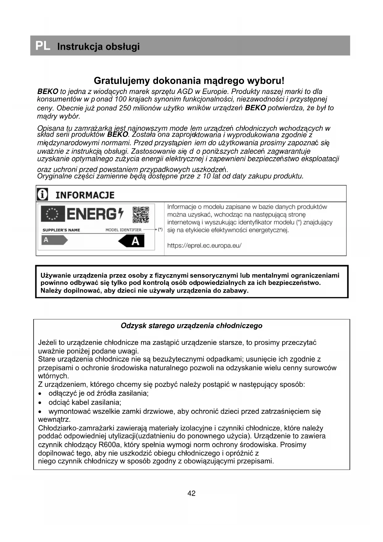 Gratulujemy dokonania mądrego wyboru! BEKO to jedna z wiodących marek sprzętu AGD w Europie. Produkty naszej marki to dla konsumentów w p onad 100 krajach synonim funkcjonalności, niezawodności i przystępnej ceny. Obecnie już ponad 250 milionów użytko wników urządzeń BEKO potwierdza, że był to mądry wybór. Opisana tu zamrażarka jest najnowszym mode lem urządzeń chłodniczych wchodzących w skład serii produktów BEKO. Została ona zaproje ktowana i wyprodukowana zgodnie z międzynarodowymi normami. Przed przystąpien iem do użytkowania prosimy zapoznać się uważnie z instrukcją obsługi. Zastosowanie się d o poniższych zaleceń zagwarantuje uzyskanie optymalnego zużycia energii elektrycznej i zapewnieni bezpieczeństwo eksploatacji oraz uchroni przed powstaniem przypadkowych uszko dzeń. Oryginalne części zamienne będą dostępne prze z 10 lat od daty zakupu produktu. PL Instrukcja obsługi Używanie urządzenia przez osoby z fizycznymi sensorycznymi lub mentalnymi ograniczeniami powinno odbywać się tylko pod kontrolą osób od powiedzialnych za ich bezpieczeństwo. Należy dopilnować, aby dzieci nie używały urządzenia do zabawy.1