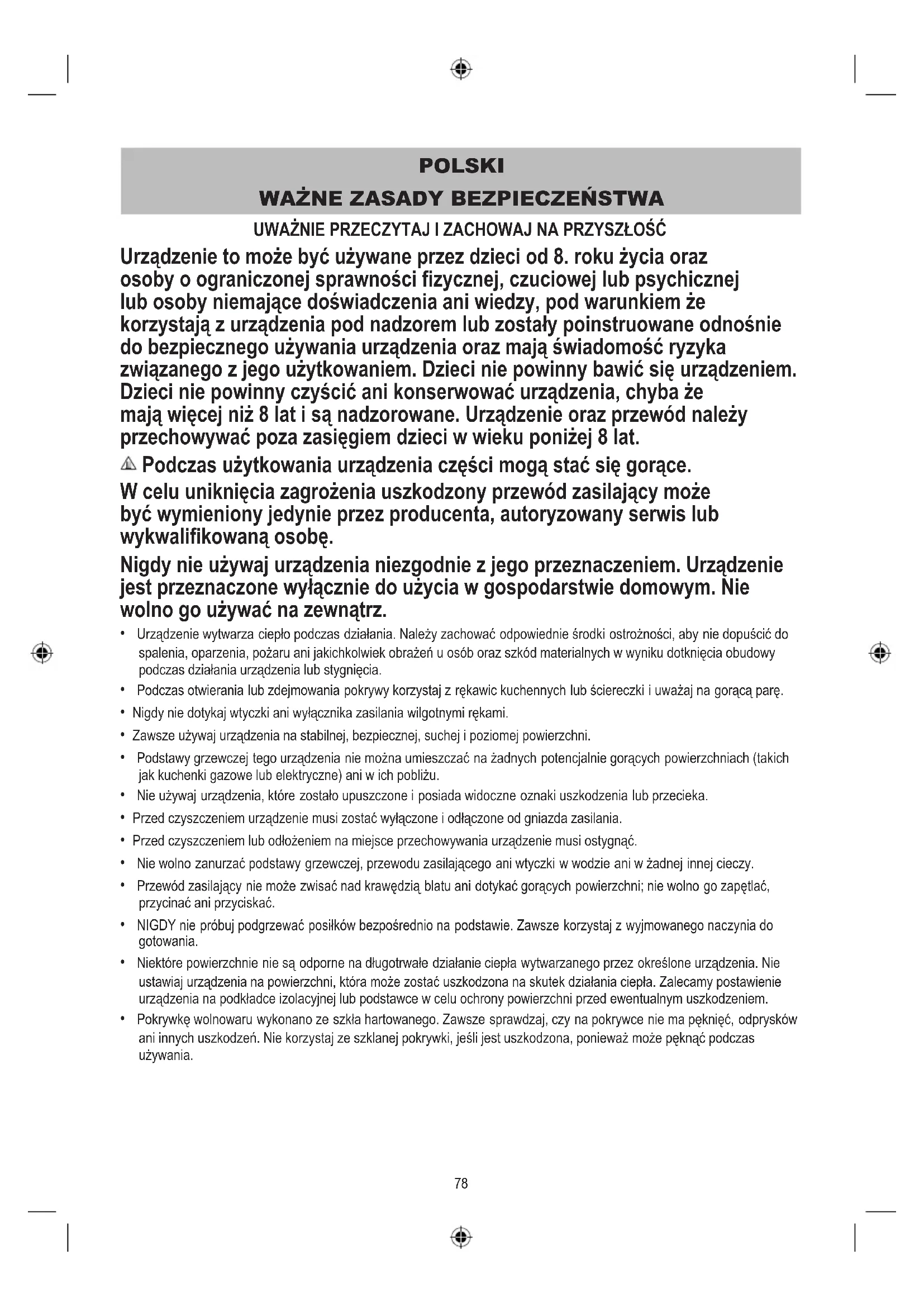UWAŻNIE PRZECZYTAJ I ZACHOWAJ NA PRZYSZŁOŚĆ Urządzenie to może być używane przez dzieci od 8. roku życia oraz osoby o ograniczonej sprawności fizycznej, czuciowej lub psychicznej lub osoby niemające doświadczenia ani wiedzy, pod warunkiem że korzystają z urządzenia pod nadzorem lub zostały poinstruowane odnośnie do bezpiecznego używania urządzenia oraz mają świadomość ryzyka związanego z jego użytkowaniem. Dzieci nie powinny bawić się urządzeniem. Dzieci nie powinny czyścić ani konserwować urządzenia, chyba że mają więcej niż 8 lat i są nadzorowane. Urządzenie oraz przewód należy przechowywać poza zasięgiem dzieci w wieku poniżej 8 lat. Podczas użytkowania urządzenia części mogą stać się gorące. W celu uniknięcia zagrożenia uszkodzony przewód zasilający może być wymieniony jedynie przez producenta, autoryzowany serwis lub wykwalifikowaną osobę. Nigdy nie używaj urządzenia niezgodnie z jego przeznaczeniem. Urządzenie jest przeznaczone wyłącznie do użycia w gospodarstwie domowym. Nie wolno go używać na zewnątrz.