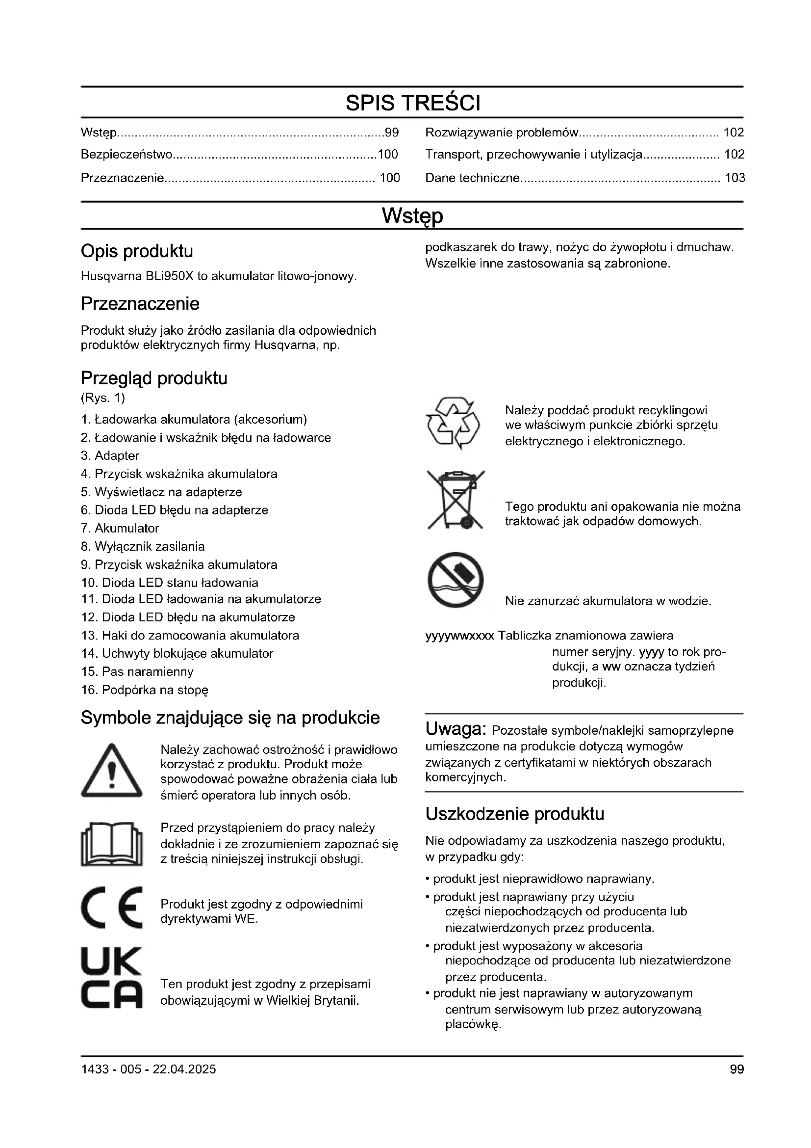 - Dane techniczne Wstęp Opis produktu Husqvarna BLi950X to akumulator litowo-jonowy. Przeznaczenie Produkt służy jako źródło zasilania dla odpowiednich produktów elektrycznych firmy Husqvarna, np. podkaszarek do trawy, nożyc do żywopłotu i dmuchaw. Wszelkie inne zastosowania są zabronione. Przegląd produktu (Rys. 1) p. 103
