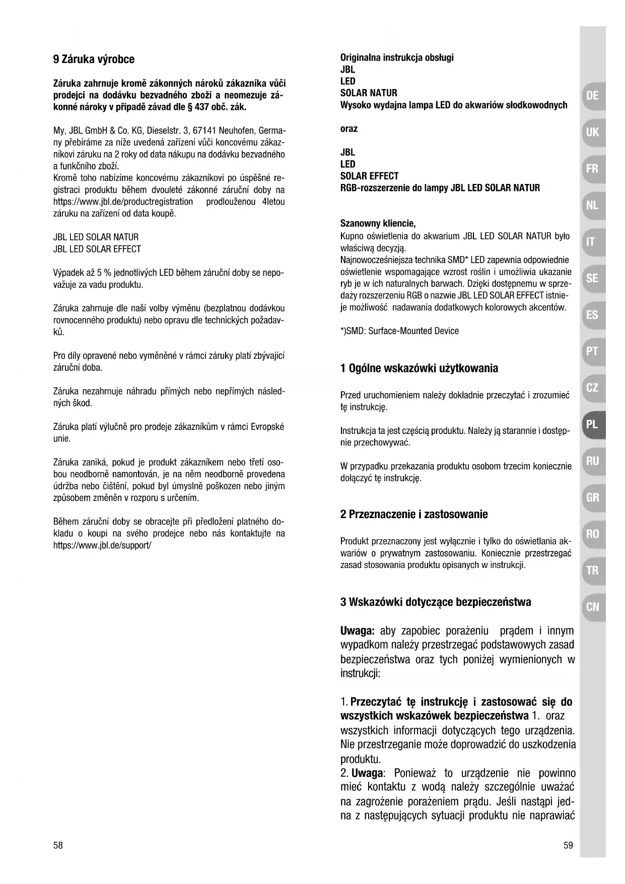 Výpadek až 5 % jednotlivých LED během záruční doby se nepo- važuje za vadu produktu. Záruka zahrnuje dle naší volby výměnu (bezplatnou dodávkou rovnocenného produktu) nebo opravu dle technických požadav- ků. Pro díly opravené nebo vyměněné v rámci záruky platí zbývající záruční doba. Záruka nezahrnuje náhradu přímých nebo nepřímých násled- ných škod. Záruka platí výlučně pro prodeje zákazníkům v rámci Evropské unie. Záruka zaniká, pokud je produkt zákazníkem nebo třetí oso- bou neodborně namontován, je na něm neodborně provedena údržba nebo čištění, pokud byl úmyslně poškozen nebo jiným způsobem změněn v rozporu s určením. Během záruční doby se obracejte při předložení platného do- kladu o koupi na svého prodejce nebo nás kontaktujte na https://www.jbl.de/support/ Originalna instrukcja obsługi JBL LED SOLAR NATUR Wysoko wydajna lampa LED do akwariów słodkowodnych oraz JBL LED SOLAR EFFECT RGB-rozszerzenie do lampy JBL LED SOLAR NATUR Szanowny kliencie, Kupno oświetlenia do akwarium JBL LED SOLAR NATUR było właściwą decyzją. Najnowocześniejsza technika SMD* LED zapewnia odpowiednie oświetlenie wspomagające wzrost roślin i umożliwia ukazanie ryb je w ich naturalnych barwach. Dzięki dostępnemu w sprze- daży rozszerzeniu RGB o nazwie JBL LED SOLAR EFFECT istnie- je możliwość nadawania dodatkowych kolorowych akcentów. *)SMD: Surface-Mounted Device 1 Ogólne wskazówki użytkowania Przed uruchomieniem należy dokładnie przeczytać i zrozumieć tę instrukcję. Instrukcja ta jest częścią produktu. Należy ją starannie i dostęp- nie przechowywać. W przypadku przekazania produktu osobom trzecim koniecznie dołączyć tę instrukcję. 2 Przeznaczenie i zastosowanie Produkt przeznaczony jest wyłącznie i tylko do oświetlania ak- wariów o prywatnym zastosowaniu. Koniecznie przestrzegać zasad stosowania produktu opisanych w instrukcji. 3 Wskazówki dotyczące bezpieczeństwa Uwaga: aby zapobiec porażeniu prądem i innym wypadkom należy przestrzegać podstawowych zasad bezpieczeństwa oraz tych poniżej wymienionych w instrukcji: