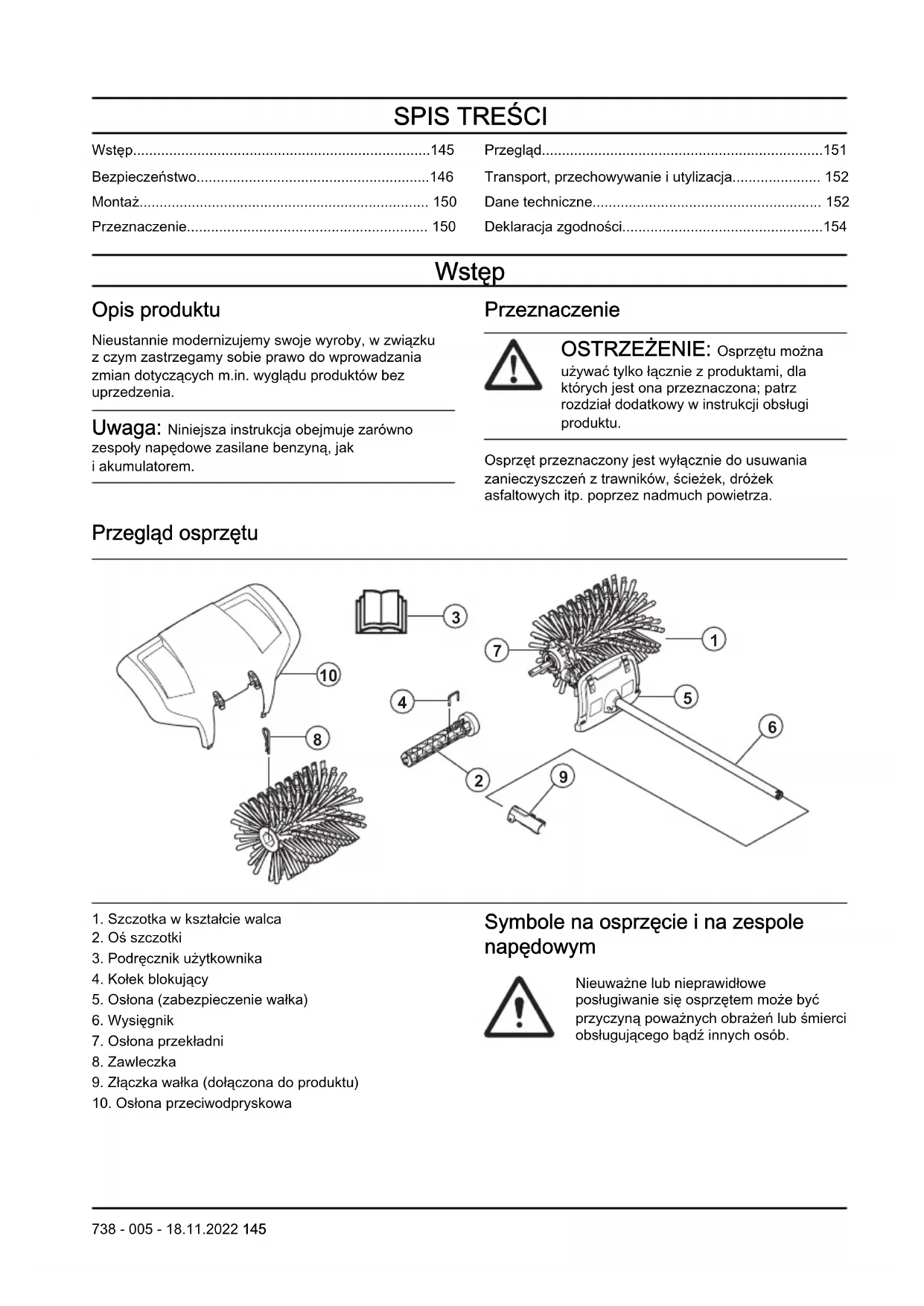 - Deklaracja zgodności Wstęp Opis produktu Nieustannie modernizujemy swoje wyroby, w związku z czym zastrzegamy sobie prawo do wprowadzania zmian dotyczących m.in. wyglądu produktów bez uprzedzenia. Uwaga: Niniejsza instrukcja obejmuje zarówno zespoły napędowe zasilane benzyną, jak i akumulatorem. Przeznaczenie OSTRZEŻENIE: Osprzętu można używać tylko łącznie z produktami, dla których jest ona przeznaczona; patrz rozdział dodatkowy w instrukcji obsługi produktu. Osprzęt przeznaczony jest wyłącznie do usuwania zanieczyszczeń z trawników, ścieżek, dróżek asfaltowych itp. poprzez nadmuch powietrza. Przegląd osprzętu p. 154