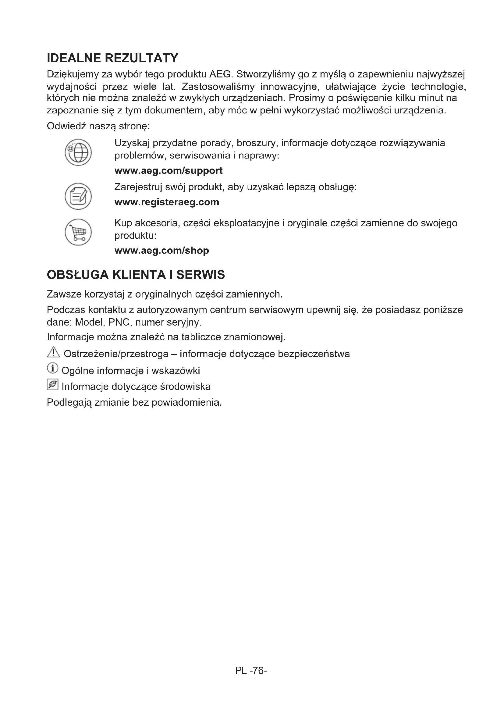Zawsze korzystaj z oryginalnych części zamiennych. Podczas kontaktu z autoryzowanym centrum serwisowym upewnij się, że posiadasz poniższe dane: Model, PNC, numer seryjny. Informacje można znaleźć na tabliczce znamionowej. Ostrzeżenie/przestroga – informacje dotyczące bezpieczeństwa Ogólne informacje i wskazówki Informacje dotyczące środowiska Podlegają zmianie bez powiadomienia.PL -77-