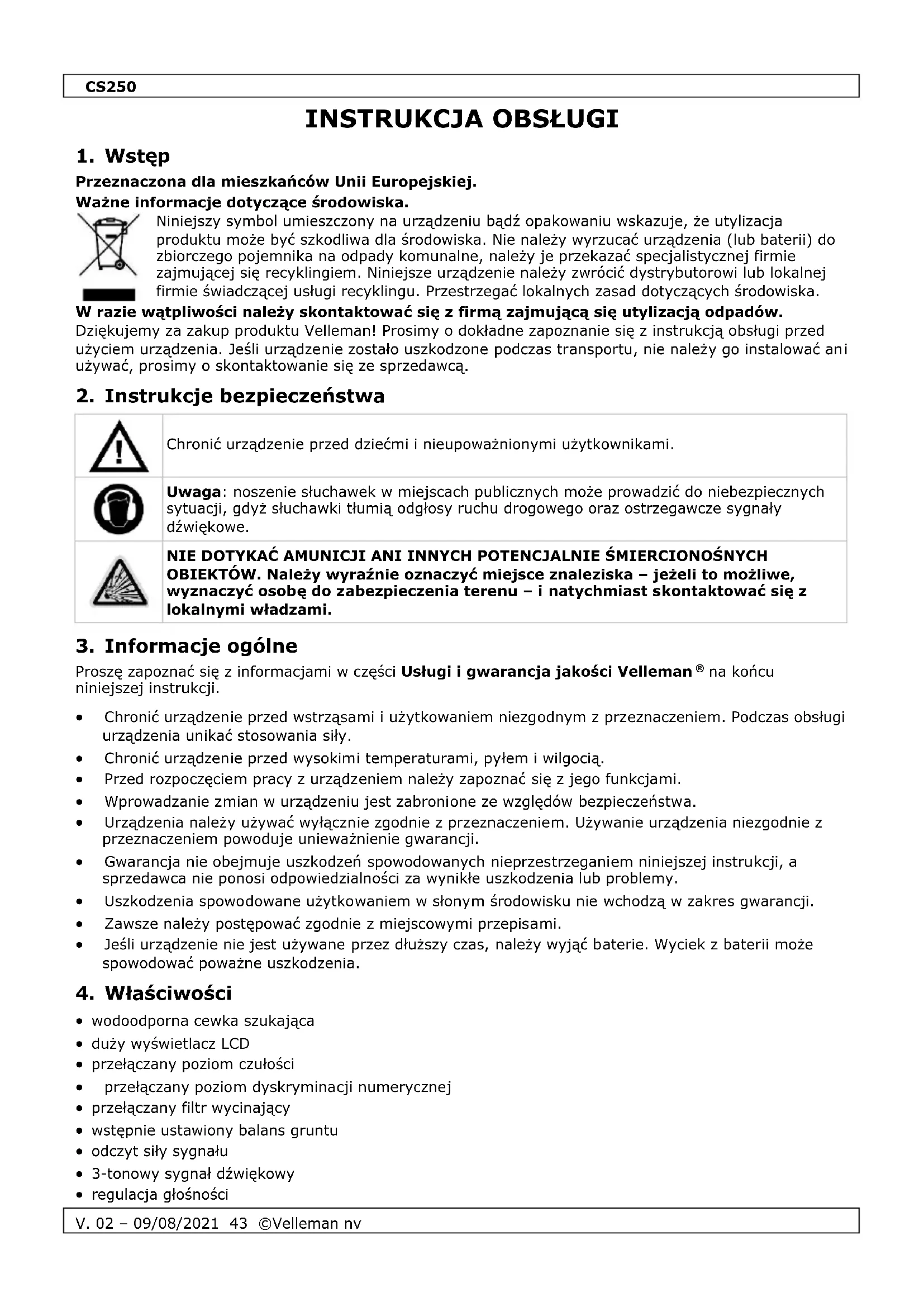 Przeznaczona dla mieszkańców Unii Europejskiej. Ważne informacje dotyczące środowiska. Niniejszy symbol umieszczony na urządzeniu bądź opakowaniu wskazuje, że utylizacja produktu może być szkodliwa dla środowiska. Nie należy wyrzucać urządzenia (lub baterii) do zbiorczego pojemnika na odpady komunalne, należy je przekazać specjalistycznej firmie zajmującej się recyklingiem. Niniejsze urządzenie należy zwrócić dystrybutorowi lub lokalnej firmie świadczącej usługi recyklingu. Przestrzegać lokalnych zasad dotyczących środowiska. W razie wątpliwości należy skontaktować się z firmą zajmującą się utylizacją odpadów. Dziękujemy za zakup produktu Velleman! Prosimy o dokładne zapoznanie się z instrukcją obsługi przed użyciem urządzenia. Jeśli urządzenie zostało uszkodzone podczas transportu, nie należy go instalować ani używać, prosimy o skontaktowanie się ze sprzedawcą.